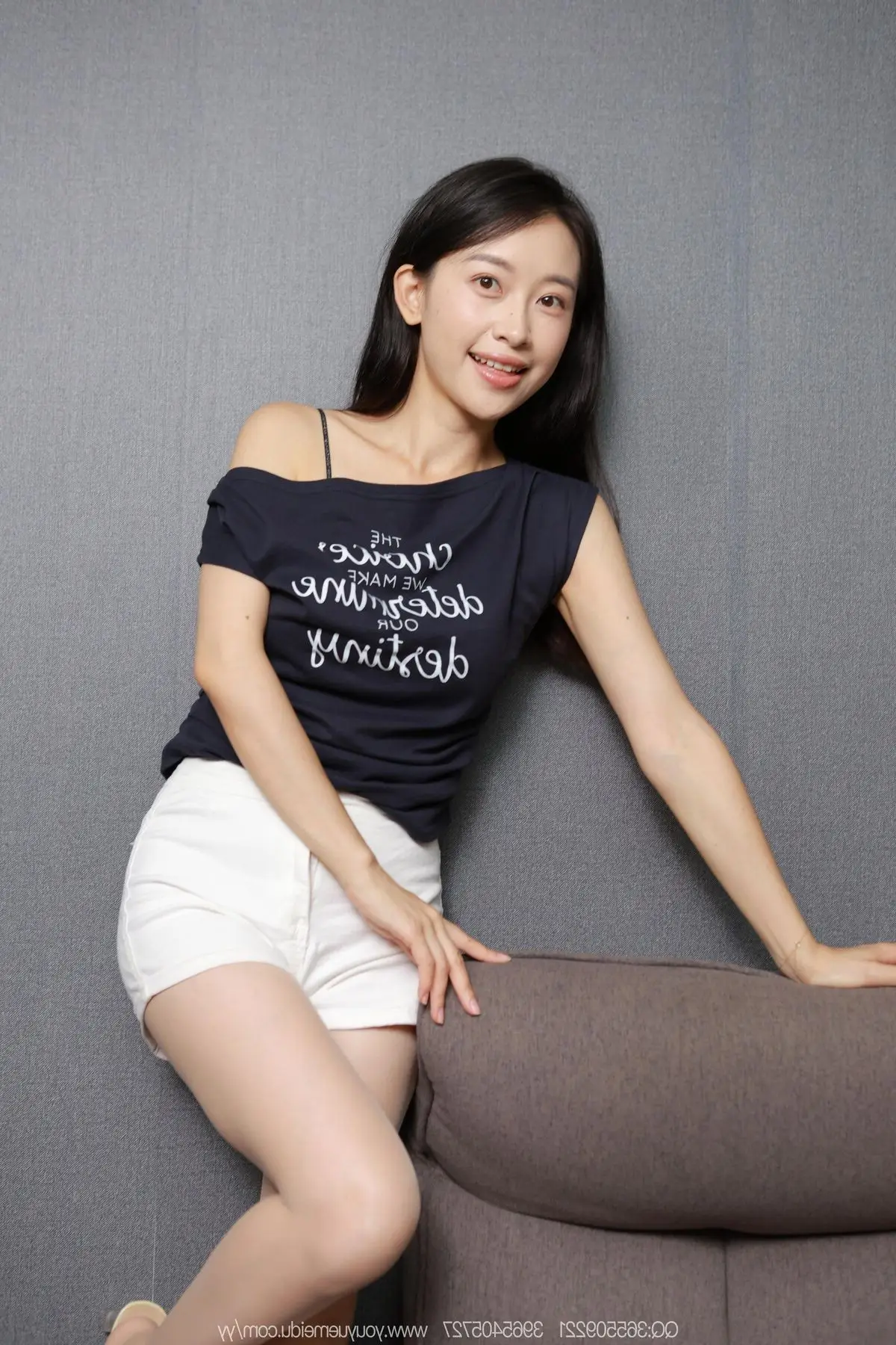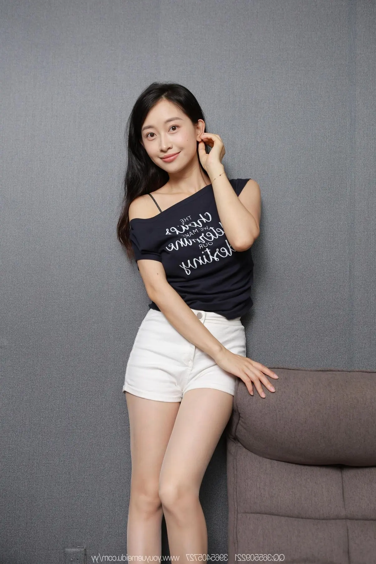 Step into the captivating world of Asian fashion and beauty with YouMi Vol.1169, featuring the radiant Chinese model Kai Zhu Quinn. In this stunning photograph, Kai Zhu Quinn effortlessly showcases her slender figure and remarkably long legs in a stylish ensemble. The elegant white top, patterned mini skirt, and high heels perfectly accentuate her alluring yet sophisticated charm. From her intense gaze to her confident pose leaning against the desk, every element speaks volumes of her self-assured beauty and irresistible appeal. This is a must-see piece from Kai Zhu Quinn's exclusive photo collection, offering an intimate and emotive glimpse into a true icon of Chinese glamour.