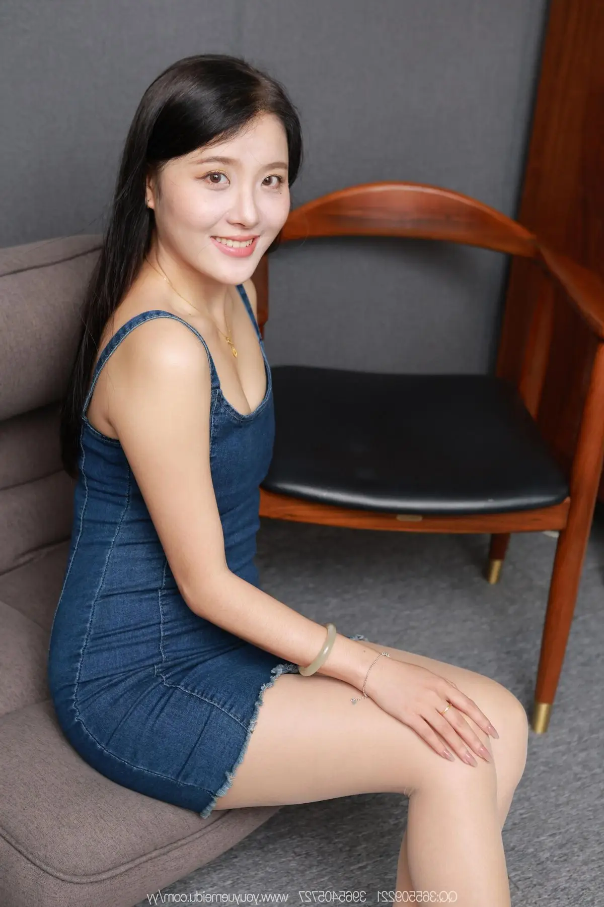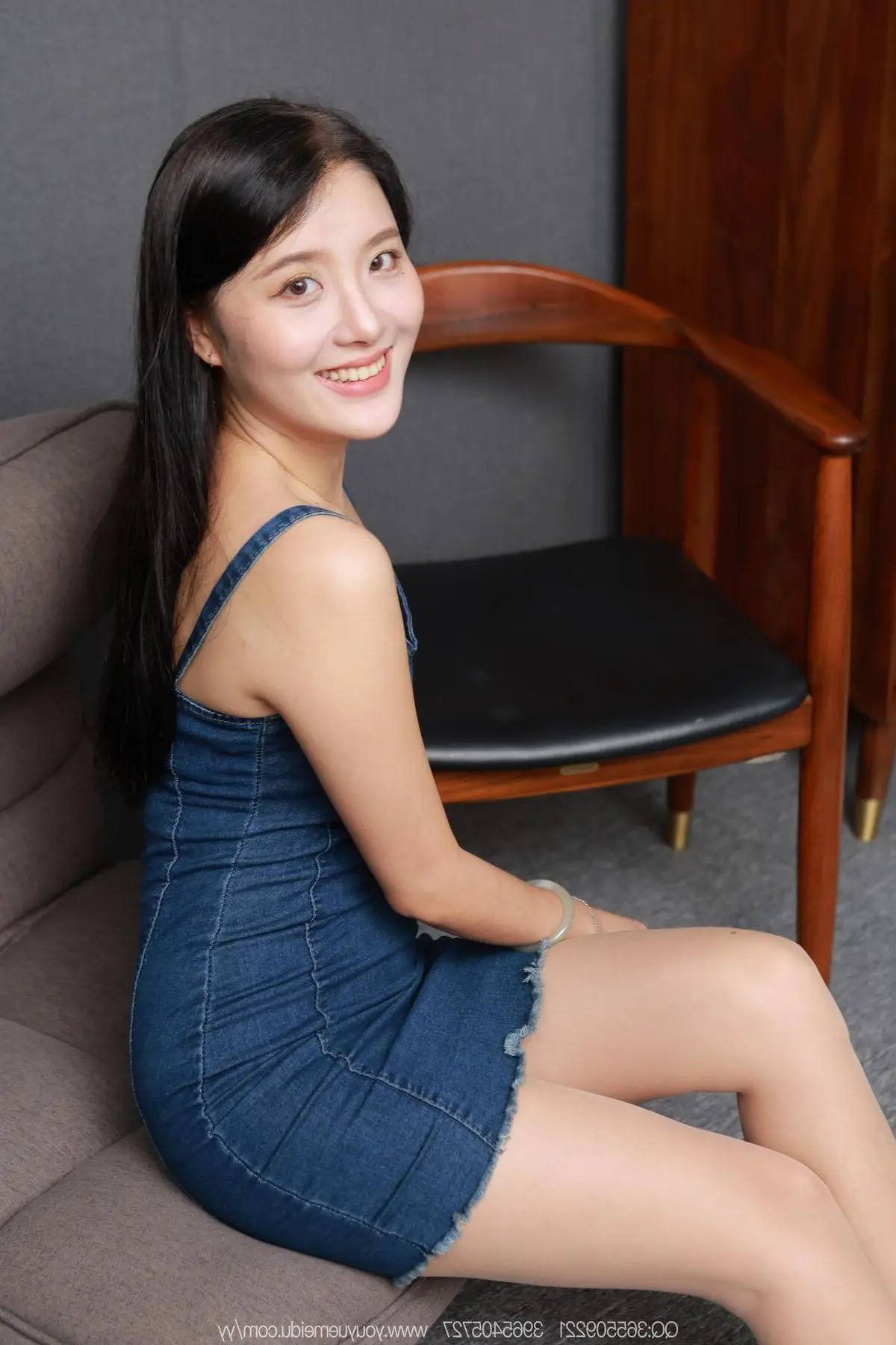 Discover the enchanting allure of Xiao Jiu from the IESS SXJ No.2144 collection. In this captivating image Chinese model Xiao Jiu relaxes gracefully in a leather armchair exuding confidence and charm. Her modern denim dress beautifully highlights her slender figure and elegant legs subtly showcased beneath sheer hosiery. Xiao Jiu's pensive gaze and poised posture create an irresistible magnetism perfectly blending traditional East Asian beauty with contemporary fashion. This portrayal embodies elegance sensuality and captivating grace promising to mesmerize every viewer. Explore the distinctive style and captivating presence that defines this iconic IESS series.