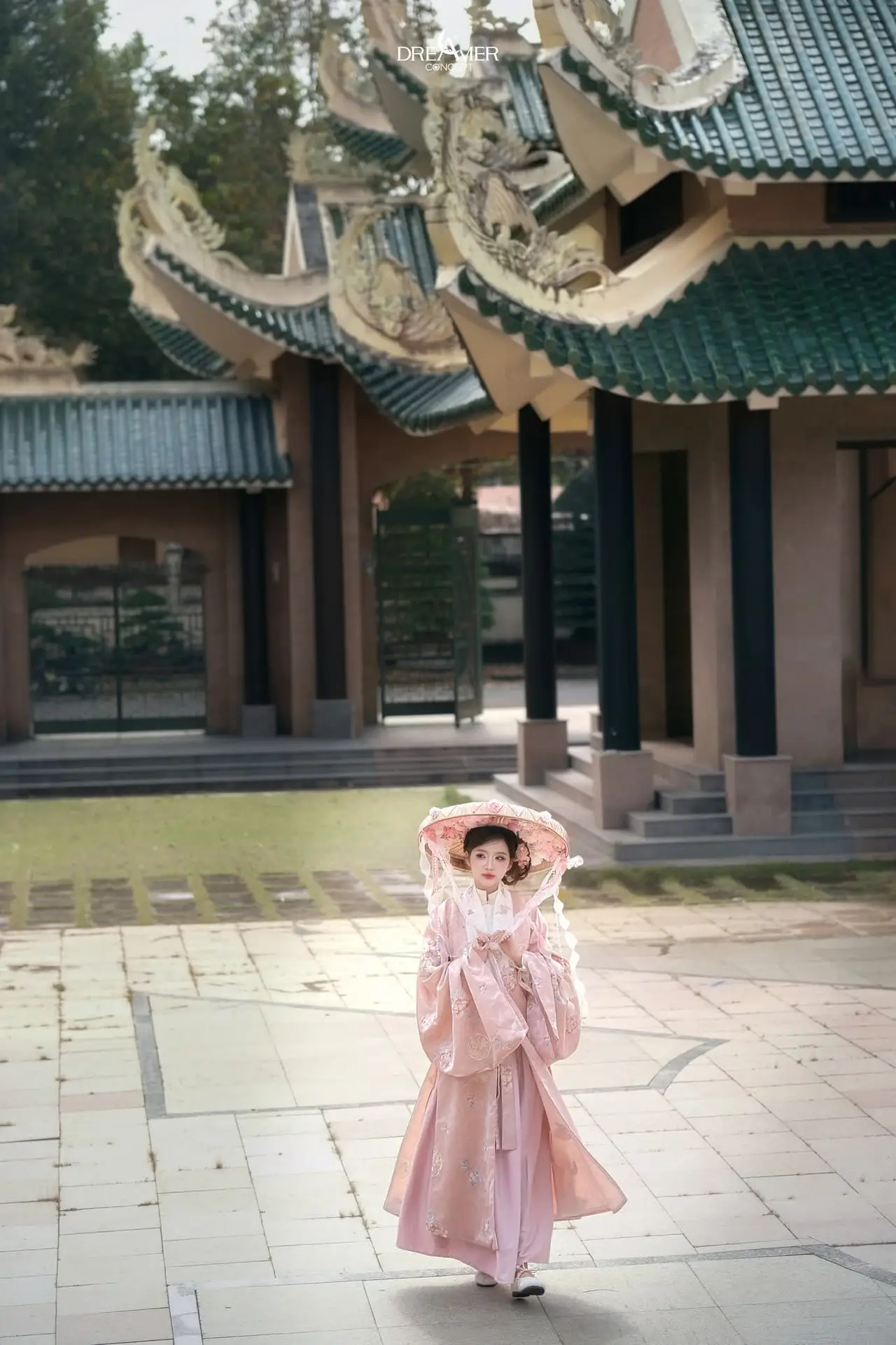 The images transports us to a deeply traditional setting where Asian beauty shines through the figure of a young woman in a delicate pink Hanfu. The gown with its gentle pink hue adorned with meticulously embroidered patterns and traditional design elements accentuates her elegance and grace. Her hair styled in a high bun with floral accents combined with subtle jewelry completes her fluid and ethereal demeanor. The girl stands amidst an ancient garden scene featuring intricately carved stone railings creating a harmonious picture between human and architecture. This moment is not just an admiration of an outfit but a profound feeling for the cultural depth and timeless beauty of traditional Chinese attire evoking peace and nostalgia for a golden past.