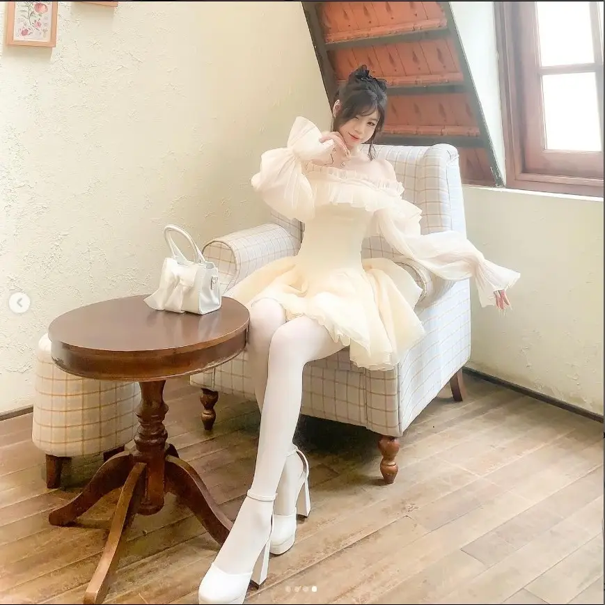 This image captures a truly impressive moment of a female bartender who has undergone a complete transformation with sophisticated and alluring fashion She appears in a light cream puffy dress paired with white stockings and matching high heels exuding an elegant yet captivating beauty Her graceful posture and confident demeanor highlight her radiant looks and balanced physique This striking change has surprised many showcasing an appeal that stems not only from her profession but also from her aesthetic taste and ability to transform her personal style making her a focal point of attention and likened to a true online celebrity She proves that allure can be expressed through various facets