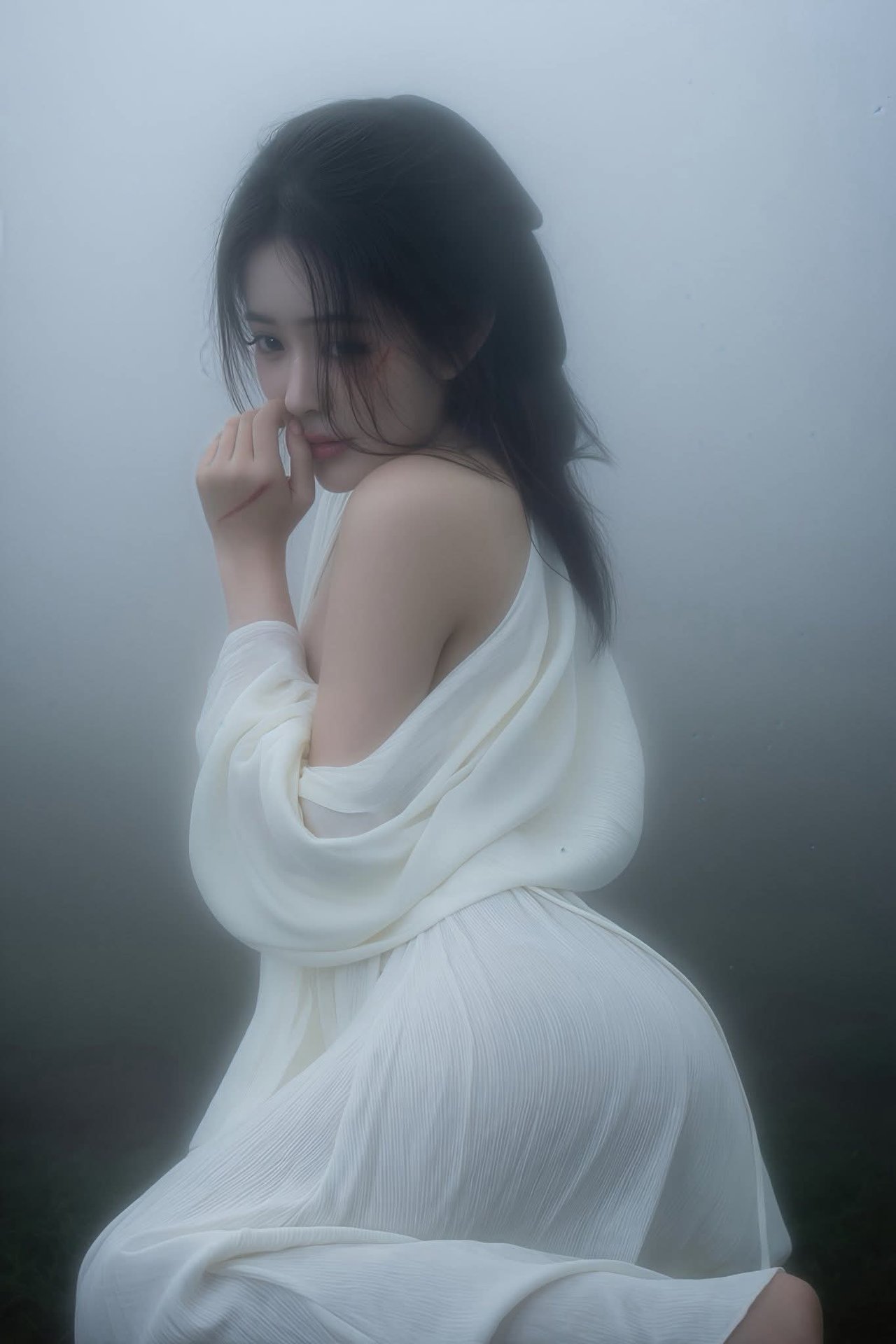 Ethereal Woman in White Dress Amidst Misty Haze Portrait