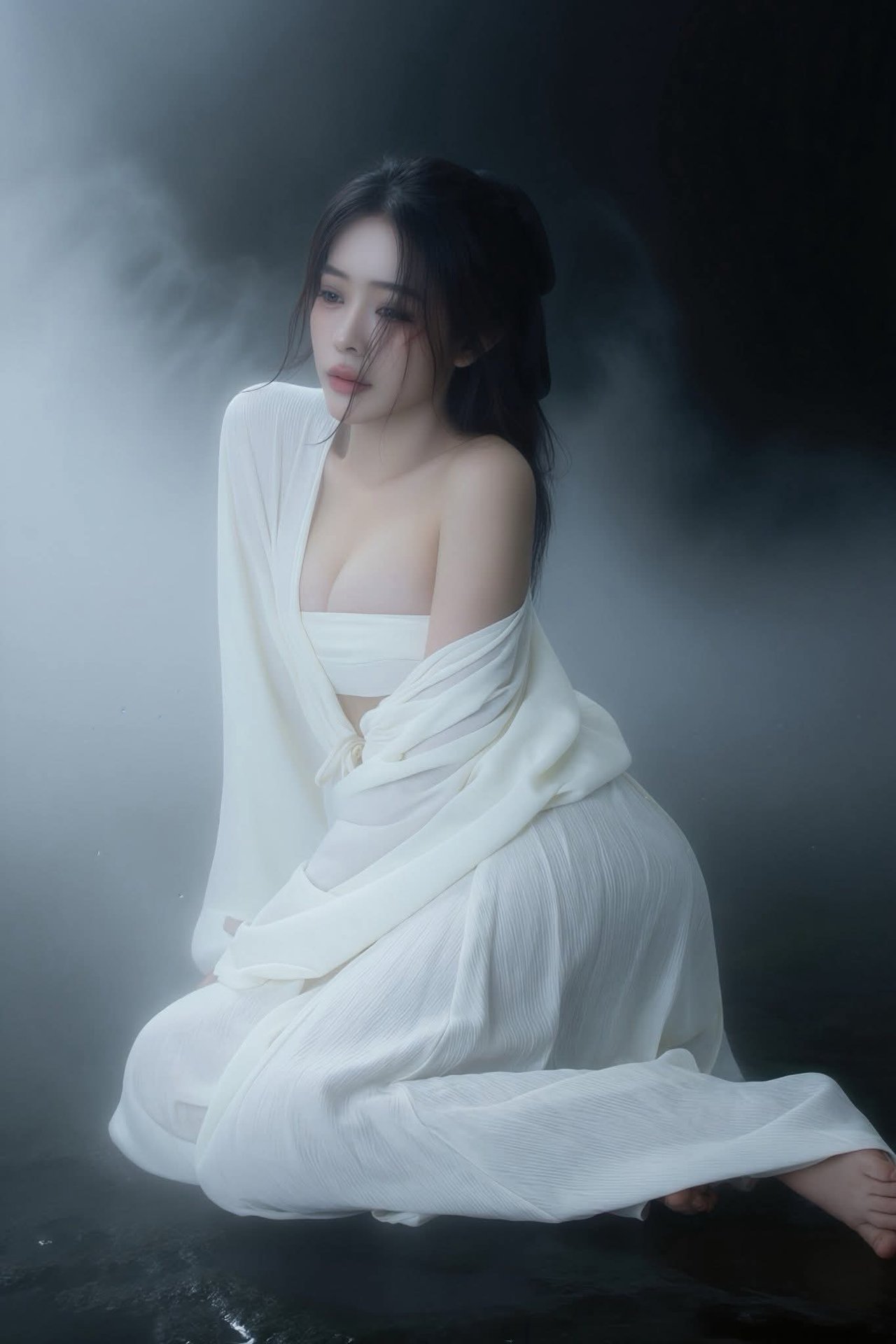 This stunning portrait captures a woman in a pristine white dress kneeling amidst a hazy misty space. Soft light illuminates her graceful and dreamy beauty with long dark hair and a face radiating peace and serenity. Her bowed head and closed eyes suggest deep contemplation or intense inner emotion. The entire scene creates a feeling that is both mysterious and pure like a dream frozen in time. This is an emotionally rich work of art not only showcasing external beauty but also touching the depths of the soul evoking tranquility and timeless elegance.
