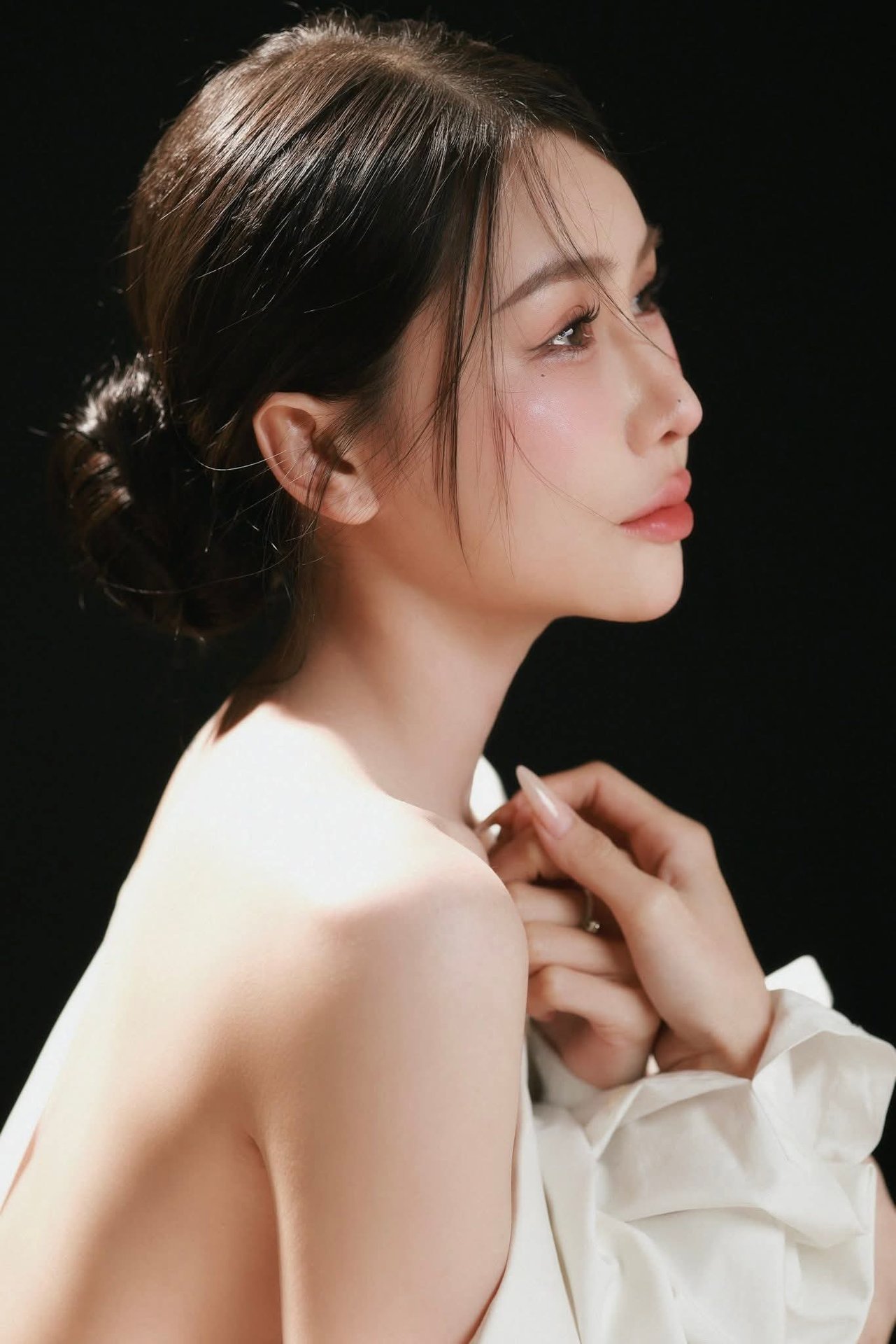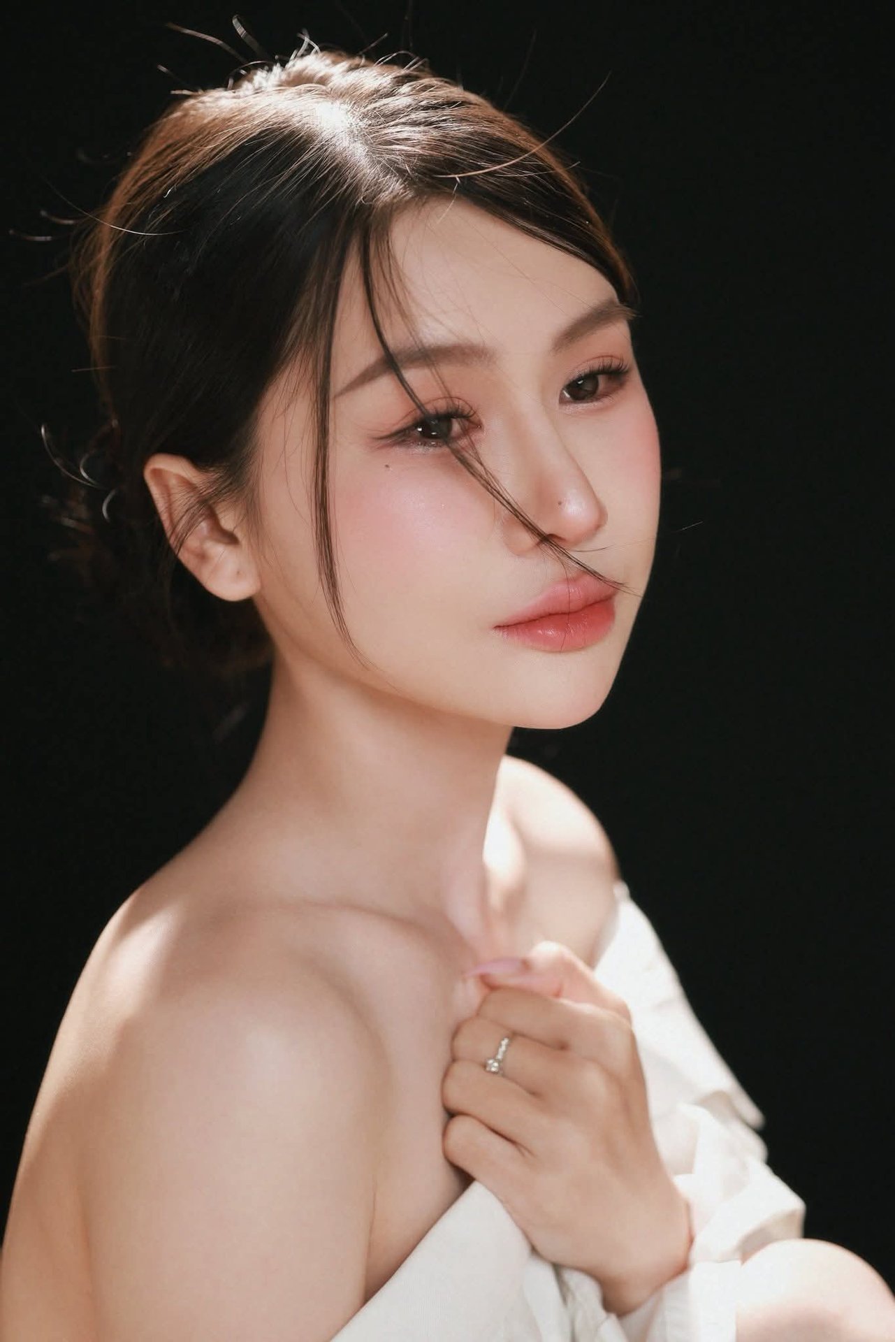 This portrait photograph is a refined work of art celebrating the elegant beauty of a woman With soft lighting and a solid black background the subject appears captivating and profound The woman in the image exudes natural unpretentious yet emotional beauty This moment evokes contemplation of inner beauty and pure grace This is not just a photograph but also a story of self-confidence and timeless allure The picture stands as a testament to simplicity yet captivating charm in artistic photography