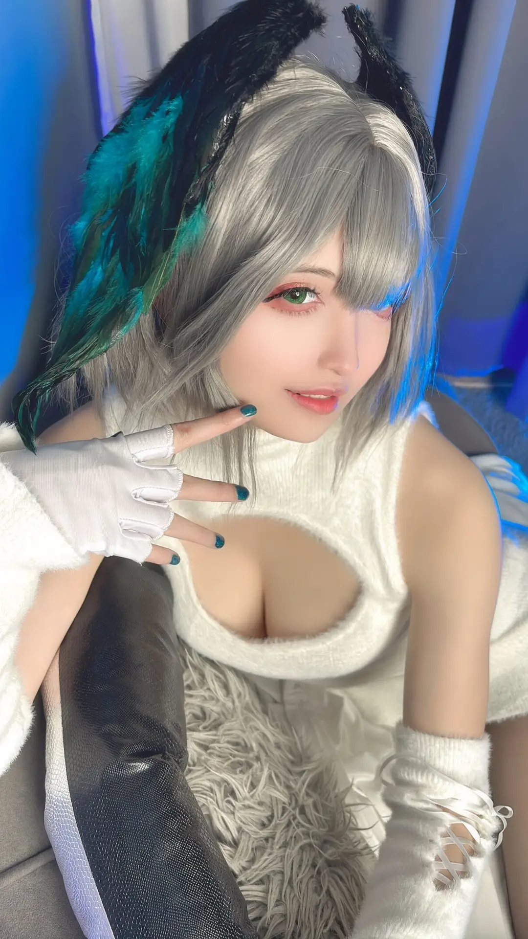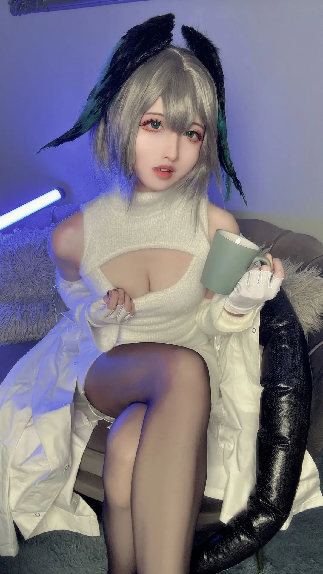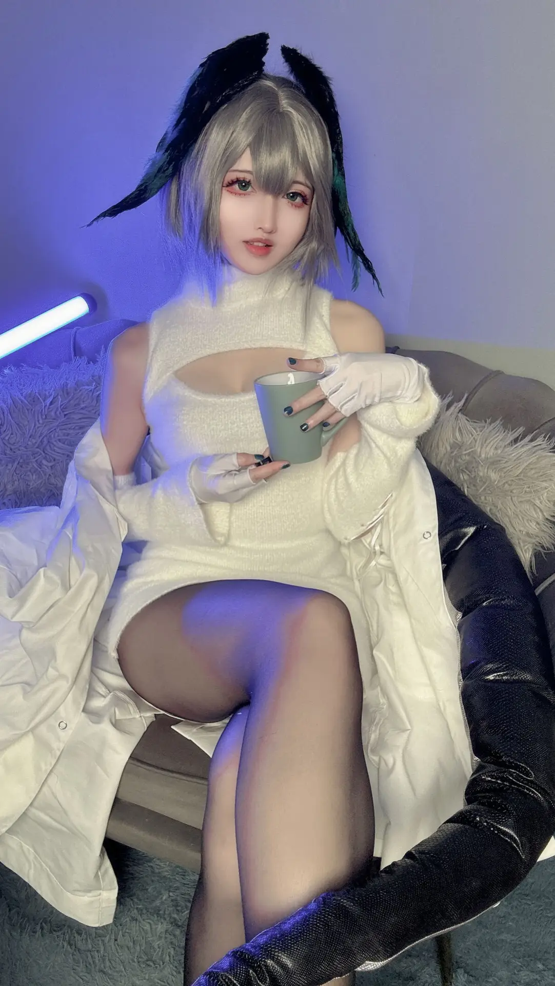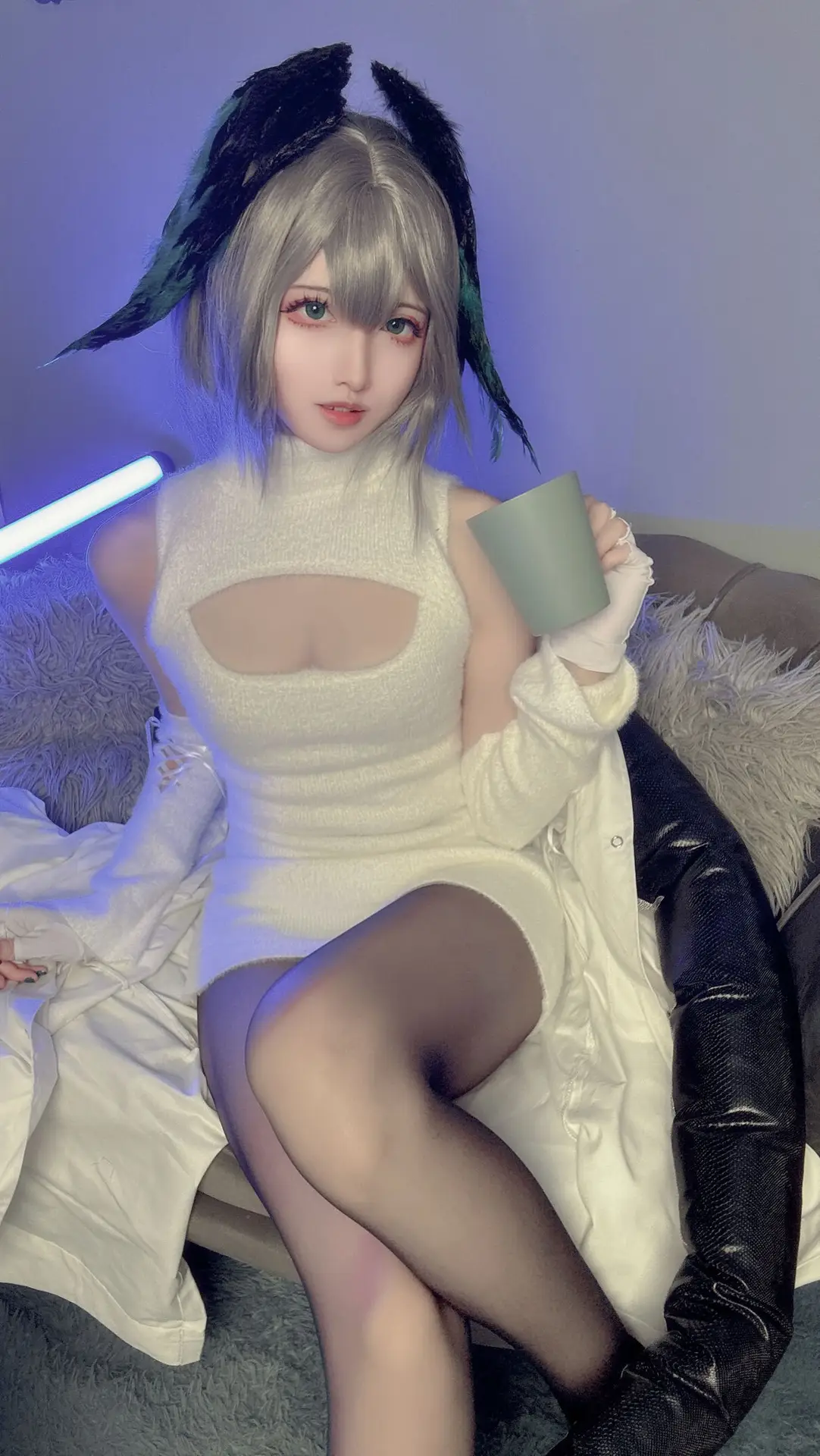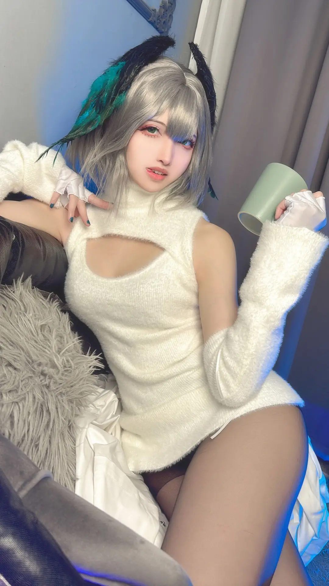 Immerse yourself in the captivating beauty of Coser Shan Qi Lei Na in this stunning Part02 photo set where she embodies the Akenaizi Huohaia character in a unique vertical sweater The pristine white sleeveless high-neck sweater dress featuring a delicate chest cutout elegantly highlights her slender figure and charming curves Her lustrous silver hair adorned with distinctive ear accessories and green feathers creates an enchanting appearance that is both cute and mysterious Posed in a cozy setting with a gentle gaze and a green mug in hand Shan Qi Lei Na exudes an inviting and mesmerizing aura This collection not only showcases meticulous attention to costume detail but also masterfully captures the characters essence making it impossible for viewers to look away A truly essential part of her impressive cosplay series#Coser #ShanQiLeiNa #AkenaiziHuohaia #VerticalSweater #CosplayFashion #AsianModel
