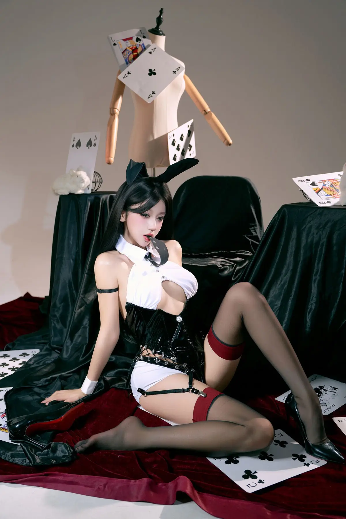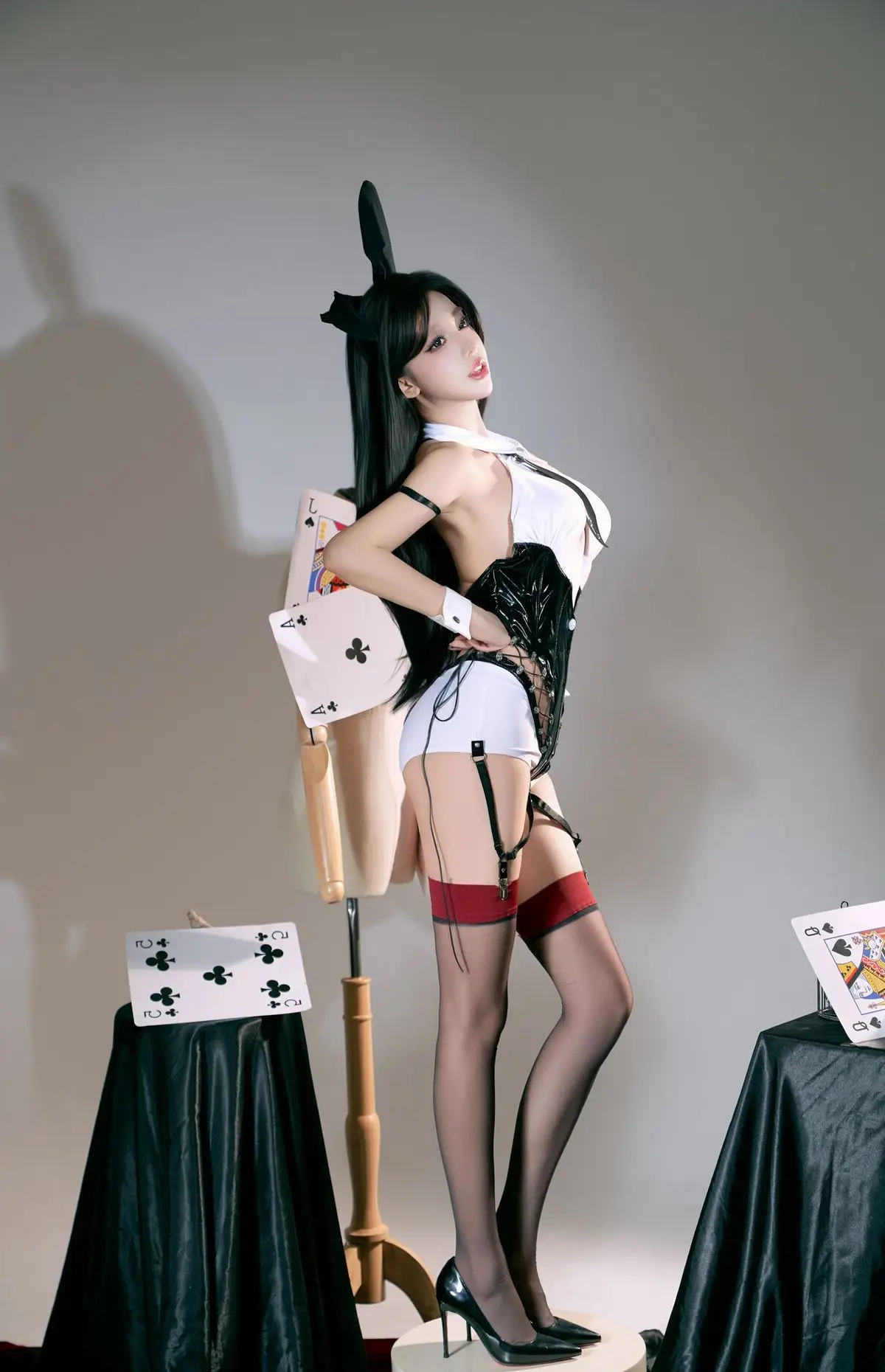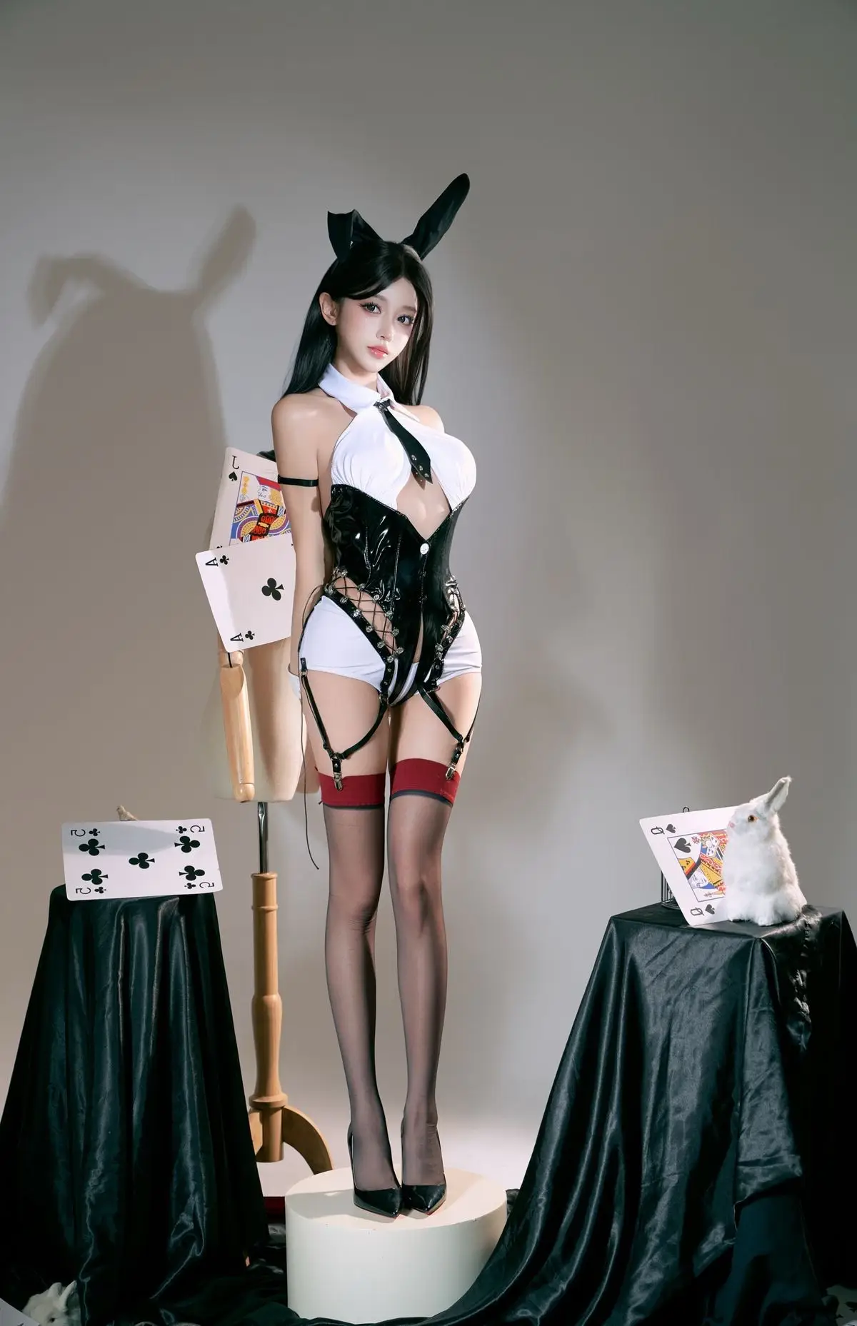 In this captivating photo set, Coser XueqiSAMA shines as the alluring Card Bunny Girl, exuding confidence and charm. She wears a sophisticated black and white bunny outfit, gracefully combining playful bunny ears with elegant card-themed details, from a stylish tie to striking red-accented thigh-high stockings. Every element is meticulously crafted, enhancing her slender figure and captivating presence. The minimalist yet effective backdrop, featuring oversized playing cards and white bunny figures as props, perfectly complements the enchanting Card Bunny Girl theme. This exceptional cosplay showcases XueqiSAMA's professionalism and alluring charisma, promising to delight cosplay enthusiasts.#Coser #Xueqi #SAMA #CardBunnyGirl #BunnyGirlCosplay #CosplayFashion