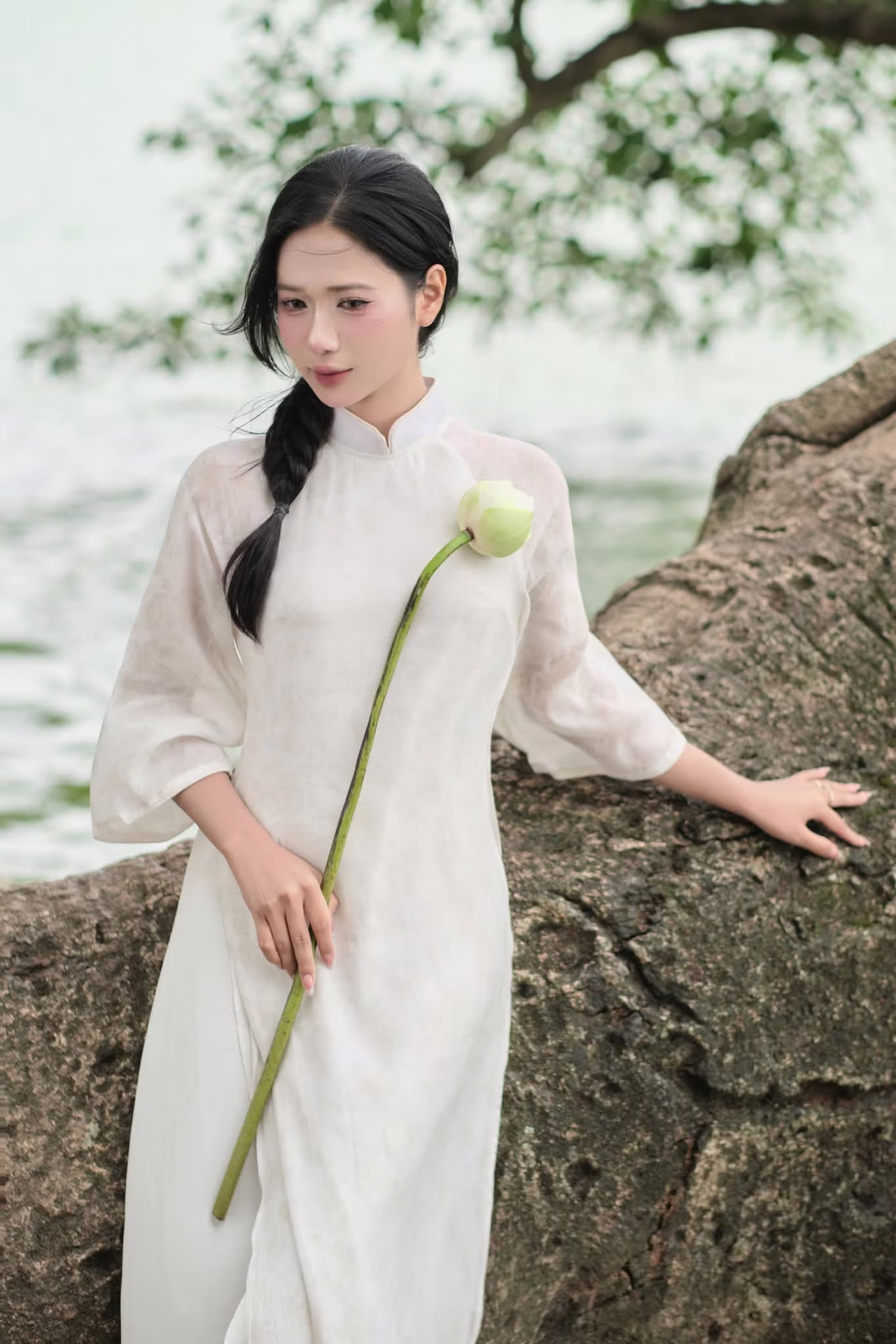 The image VGU No16 captures a beautiful and romantic scene showcasing the traditional beauty of Vietnam. The central figure is a young woman with long dark braided hair gracefully adorned in a pristine white Ao Dai. This traditional attire not only enhances her elegant silhouette but also embodies the sophistication of Vietnamese culture. She gently holds a fresh green lotus bud a symbol of purity and noble spirit. Her gentle gaze and subtle smile further highlight her enchanting East Asian charm. This picture is a harmonious blend of human beauty and cultural symbols evoking a sense of peace and profound serenity. It is truly a memorable moment reflecting pride in Vietnam’s Ao Dai and lotus flower. #Vietnamese #pretty #charmSerene Asian Beauty and Timeless Traditional Charm 1000020751