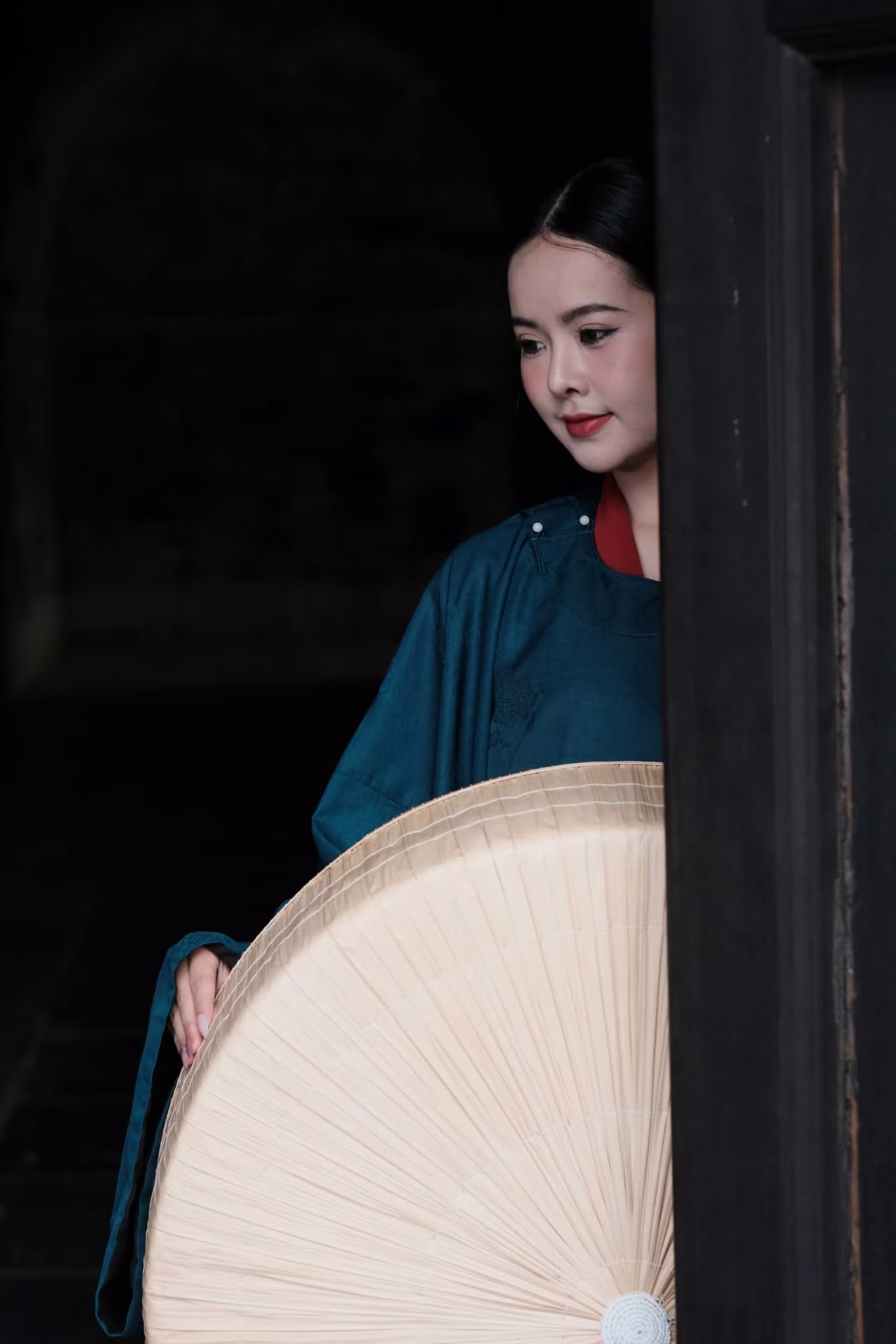 This captivating image beautifully portrays an enchanting and elegant Asian beauty. The woman, adorned in a pristine white cheongsam with subtle embroidery, exudes grace and sophistication. Her delicate posture, gently touching a classic blue and white porcelain vase filled with pure white flowers, creates a serene and poetic scene. The traditional charm is accentuated by her attire and the timeless setting, evoking a sense of refined Asian culture. Every detail, from her neatly styled hair and delicate earrings to her contemplative gaze, contributes to a perfect portrait that captivates the viewer, stirring deep emotions for a beauty that transcends time and trends.XVG No.54: The Grace of Vietnamese Ao Dai & Conical Hat. A beautiful woman embodies national pride and cultural heritage.