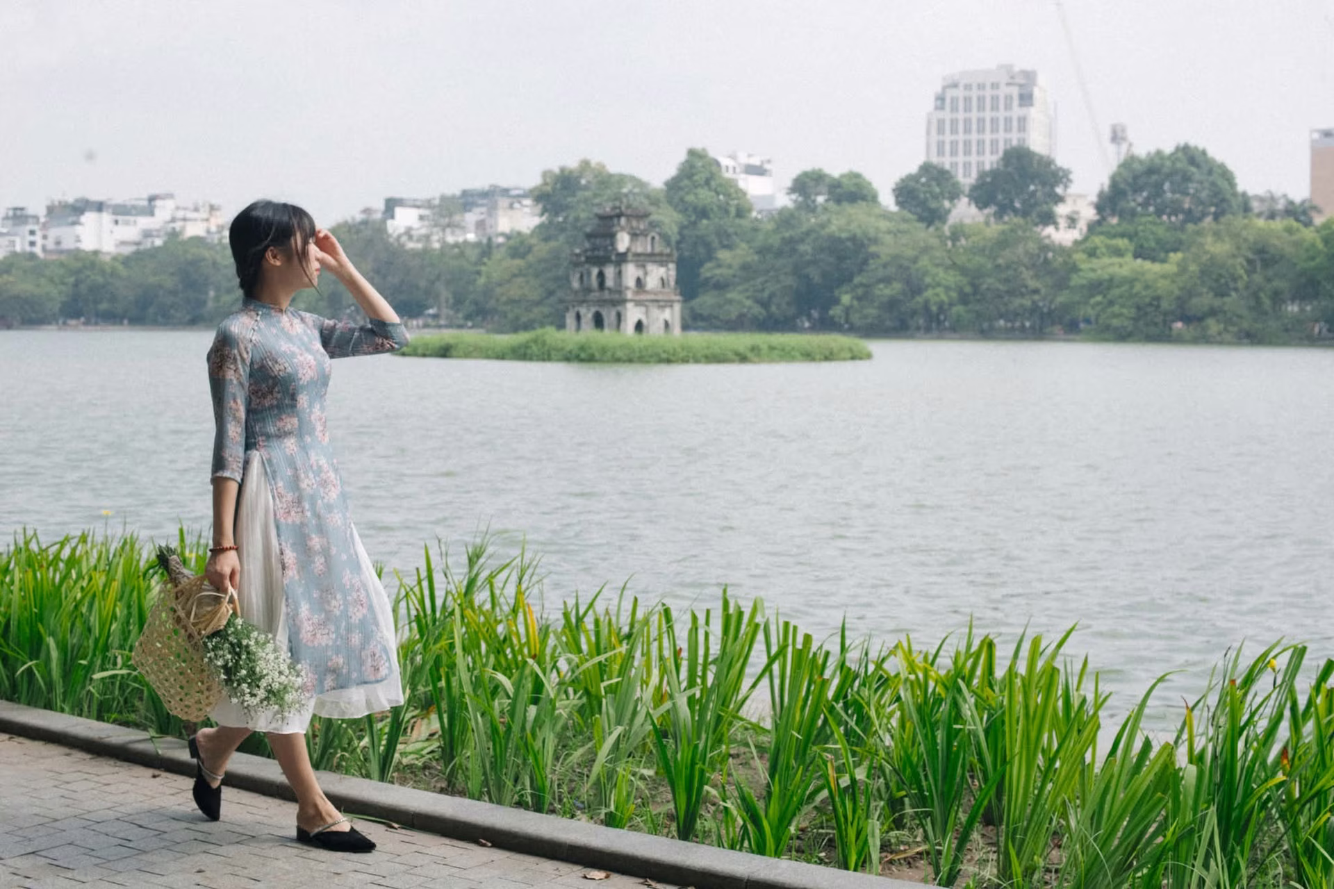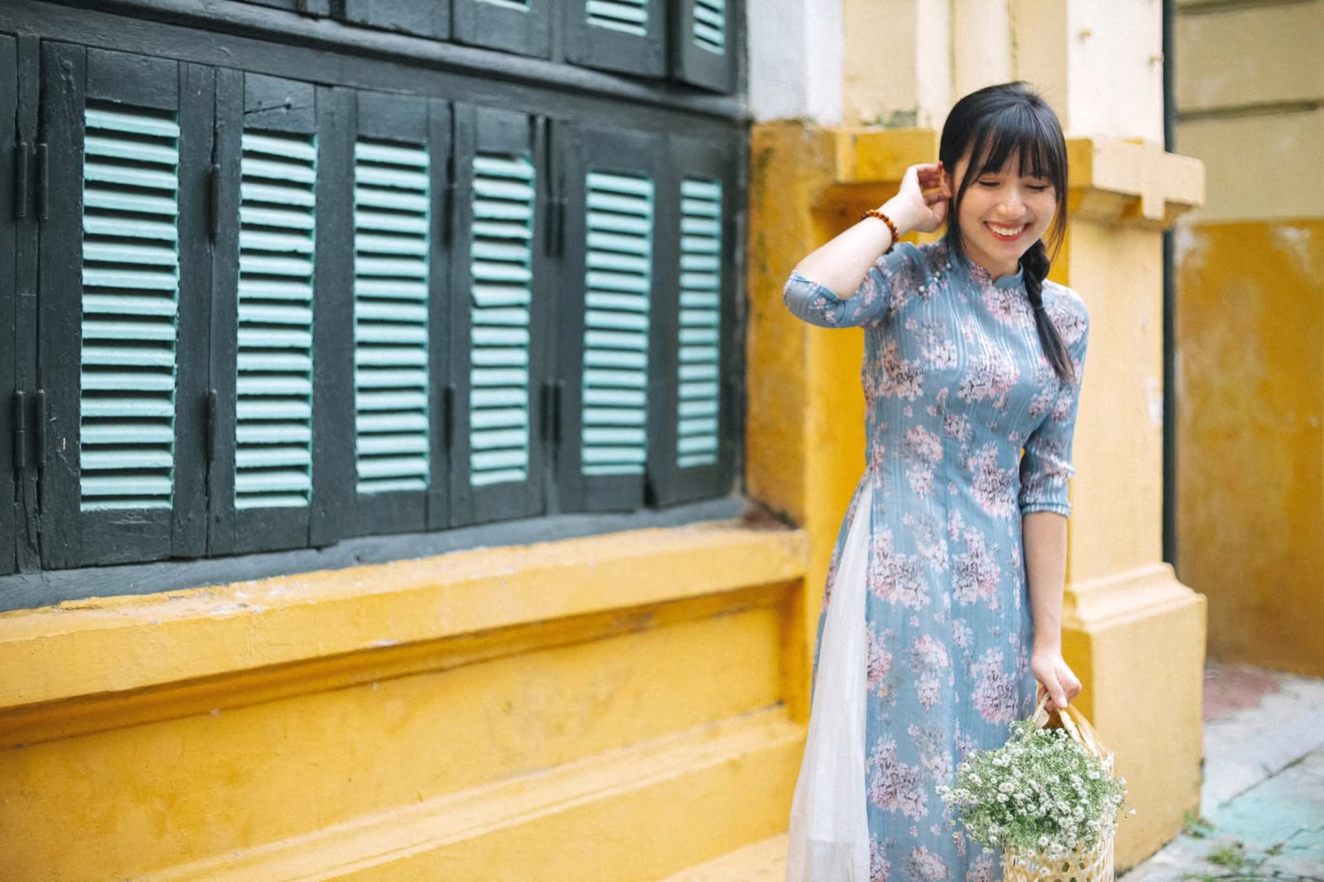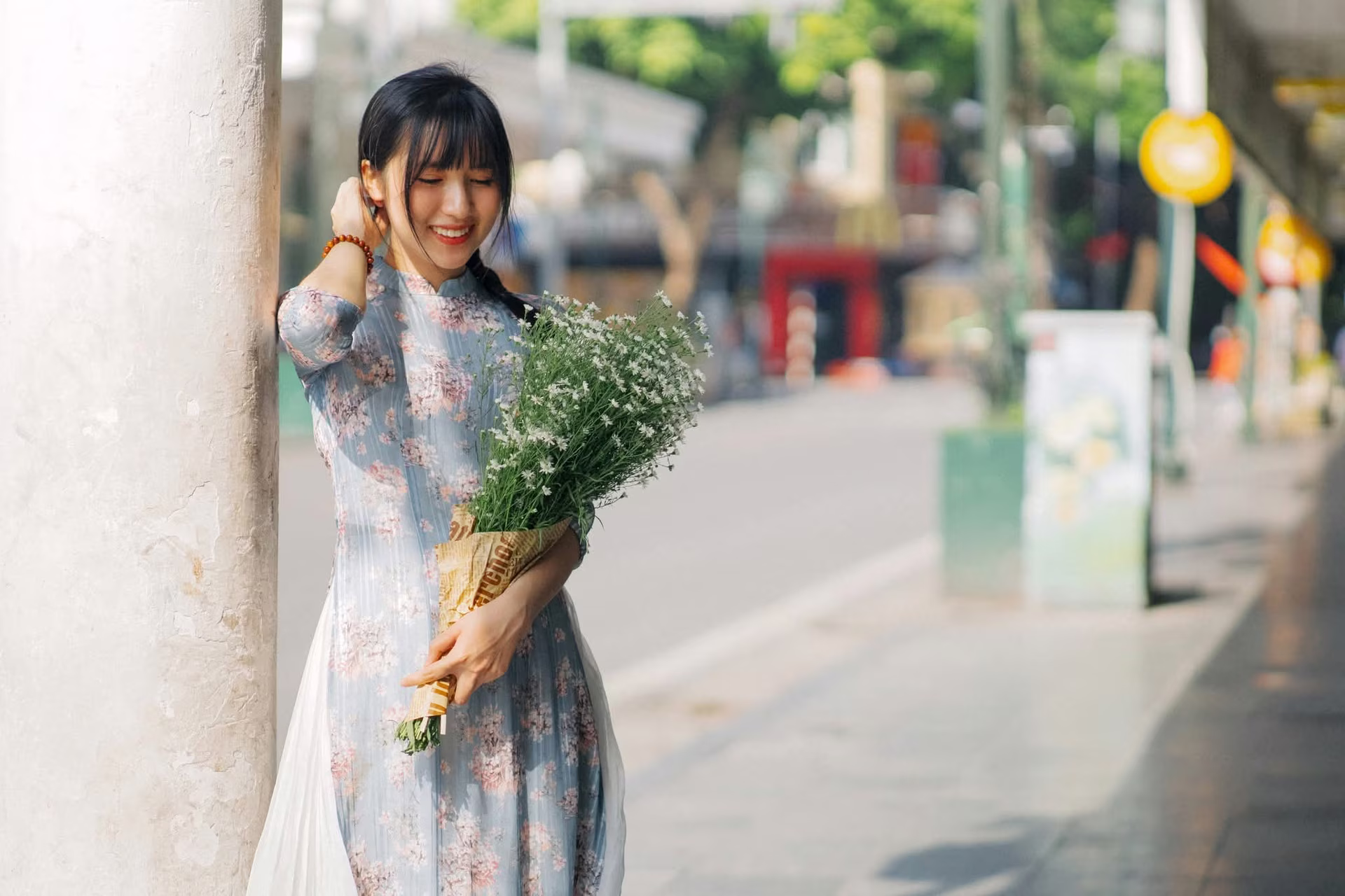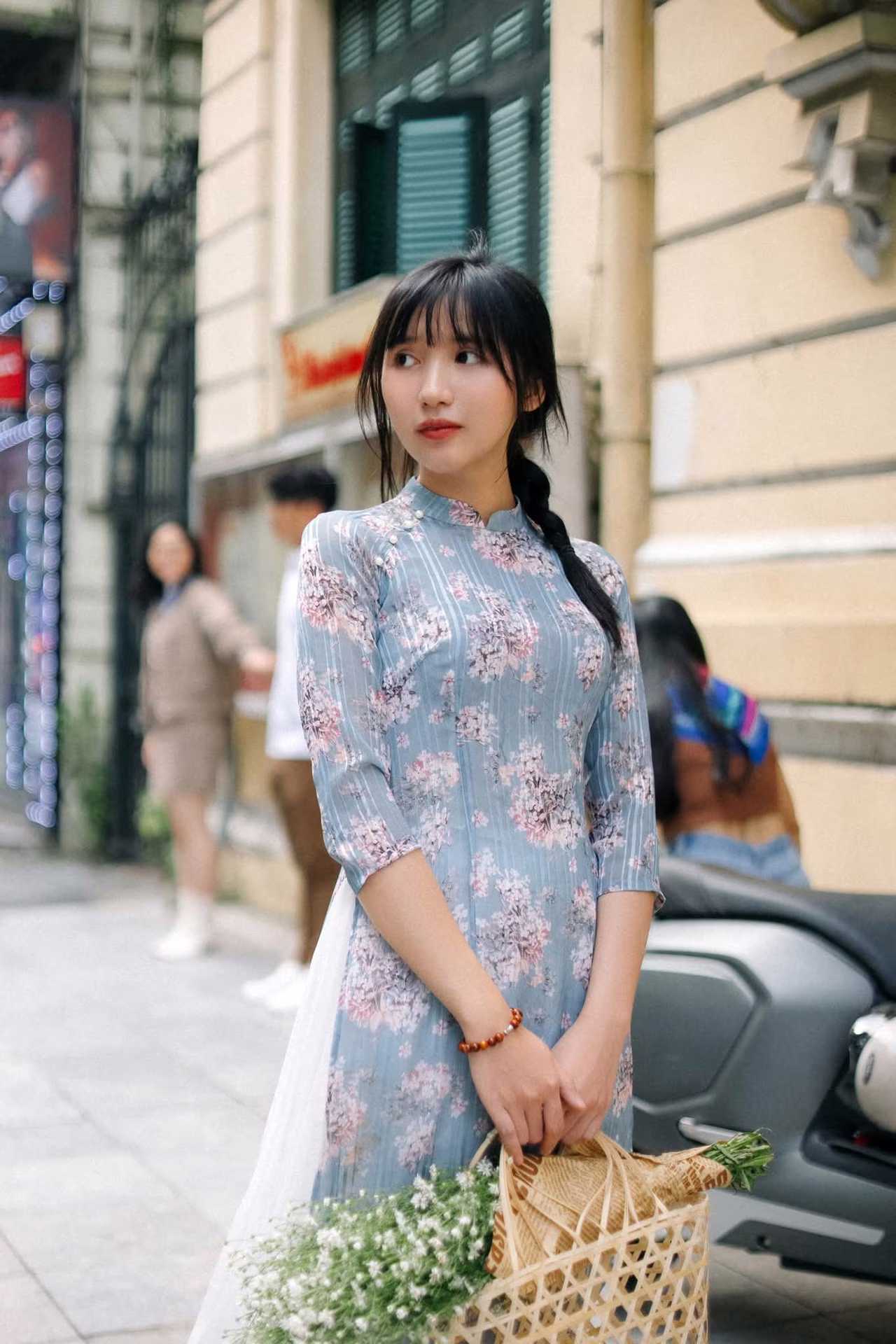 This stunning VGU No.19 image beautifully captures a graceful young Vietnamese woman in a traditional Ao Dai, adorned with delicate floral patterns, amidst the bustling city. Our muse, elegantly dressed, holds a basket of fresh flowers, exuding a gentle and pure beauty. From her distant gaze to her subtle smile, everything radiates a pristine East Asian charm. This is more than just a girl's portrait; it is a vibrant symbol of Vietnamese culture. The Ao Dai and the small white flowers blend perfectly, creating a serene and romantic moment. She stands like a blooming flower amidst the city's hustle and bustle, offering a sense of peace and nostalgia. #Vietnamese #pretty #charmVGU No.16: Discover the Gentle Charm of White Ao Dai and Lotus – Captivating Vietnamese Beauty