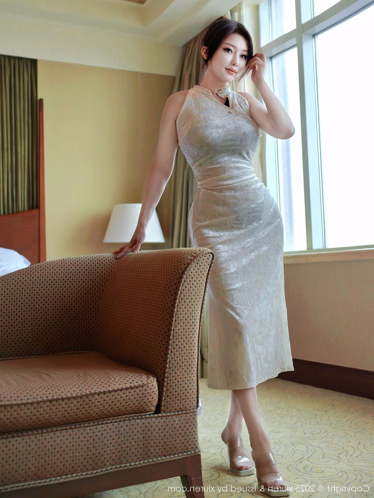 In the XiuRen No10355 photoshoot, Su Yi Nuo shines with irresistible elegance and allure. She wears a delicate cream-colored form-fitting dress, exquisitely designed to highlight her perfect figure and graceful curves. Her graceful pose on a luxurious chaise lounge, combined with captivating eyes and a gentle smile, exudes confidence and enchanting charm. The cozy bedroom setting, featuring high-end furnishings and soft lighting, further accentuates her sophisticated beauty and serene demeanor. The entire frame is a harmonious blend of modern flair and traditional Asian aesthetics, creating an emotional and refined tableau that sparks curiosity to explore more of this collection.
