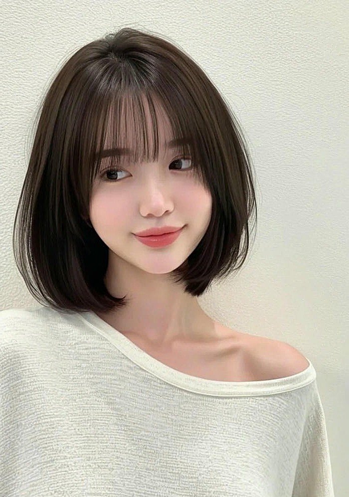 This stunning photo captures a pretty girl with a sweet smile, radiating freshness and cuteness. The undeniable highlight is her fluffy, gentle see-through bangs, softly framing her delicate face. These wispy see-through bangs not only subtly conceal her forehead but also accentuate her gentle and feminine beauty. With long wavy hair combined with the see-through fringe, the girl exudes a natural allure, appearing both youthful and captivating. This image perfectly illustrates the power of see-through bangs in creating a refined, sweet, and incredibly charming look for women.