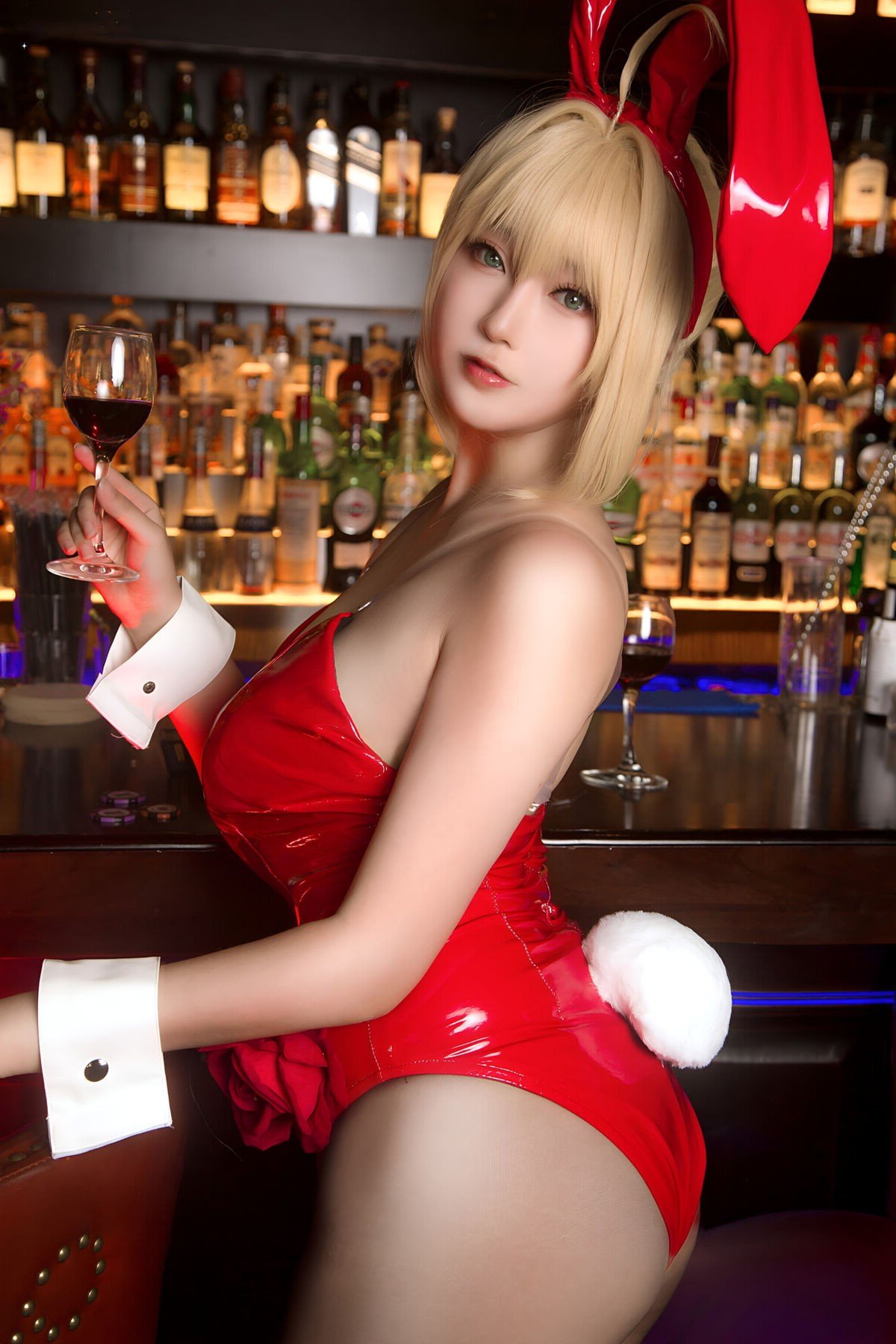 In this stunning photoshoot cosplayer 小容仔咕咕咕w transforms into the character 尼禄 Nero in a captivating bunny girl rendition She dons a vibrant red bunny suit that perfectly accentuates her alluring figure The cute bunny ears and a charming bow on her golden blonde hair create a harmonious blend of innocence and mature beauty The model exudes confident charisma with enchanting eyes and a gentle smile that mesmerizes viewers The simple yet elegant background featuring bookshelves and warm lighting further enhances the cosers charm This is an impressive cosplay showcasing meticulous attention to costume and expression The image radiates an atmosphere of both sophistication and sensuality drawing every gaze The fiery red outfit symbolizes the characters passionate and intense energy 小容仔咕咕咕w truly delivers an unforgettable Nero bunny girl portrayal