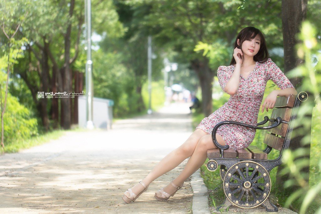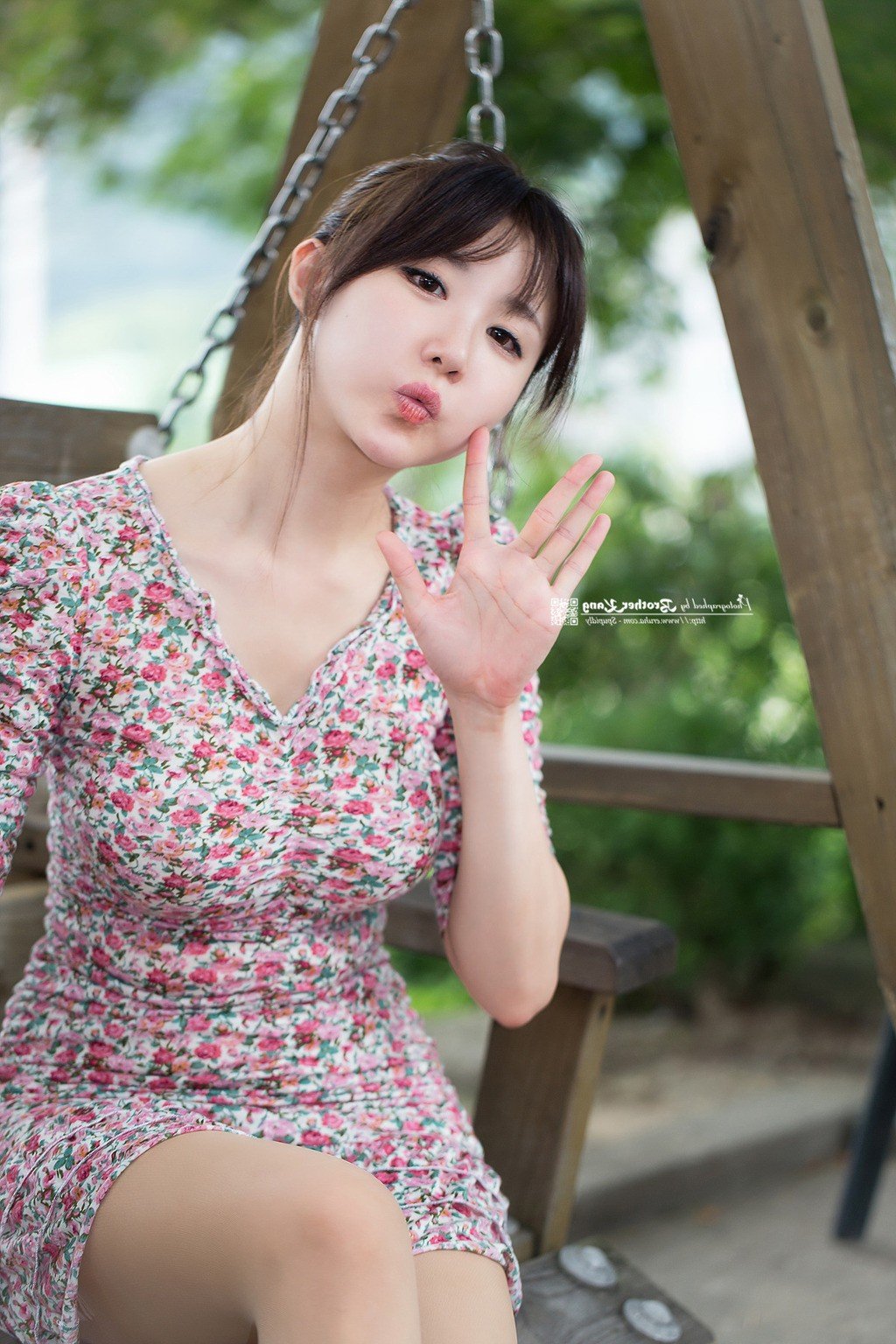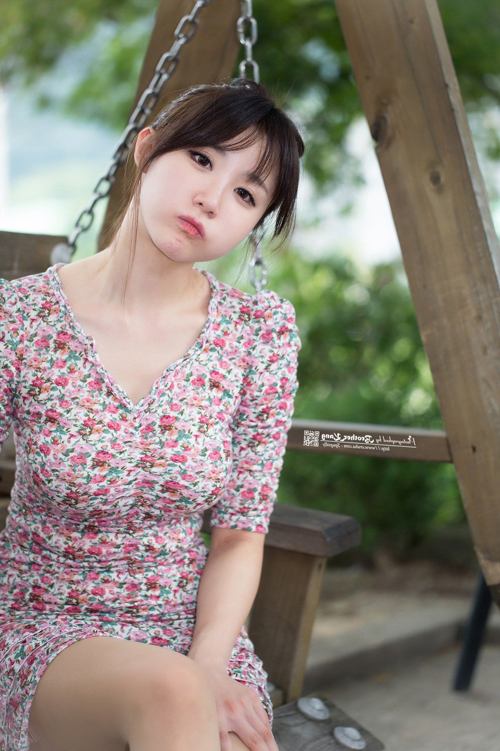 This captivating image features Yeon Da Bin a beautiful and incredibly cute Korean girl. She wears a charming floral dress with bright tones highlighting her natural radiant beauty. With mesmerizing eyes and a slightly pouty adorable expression Yeon Da Bin sits gracefully on a wooden swing amidst a lush green outdoor setting. This photograph exudes innocence sweetness and a subtle allure. Yeon Da Bins beauty lies not only in her appearance but also in her confident and captivating demeanor. This pretty Korean girl brings a sense of calm and pleasantness to the viewer. It is a moment perfectly capturing her unique charm and grace.