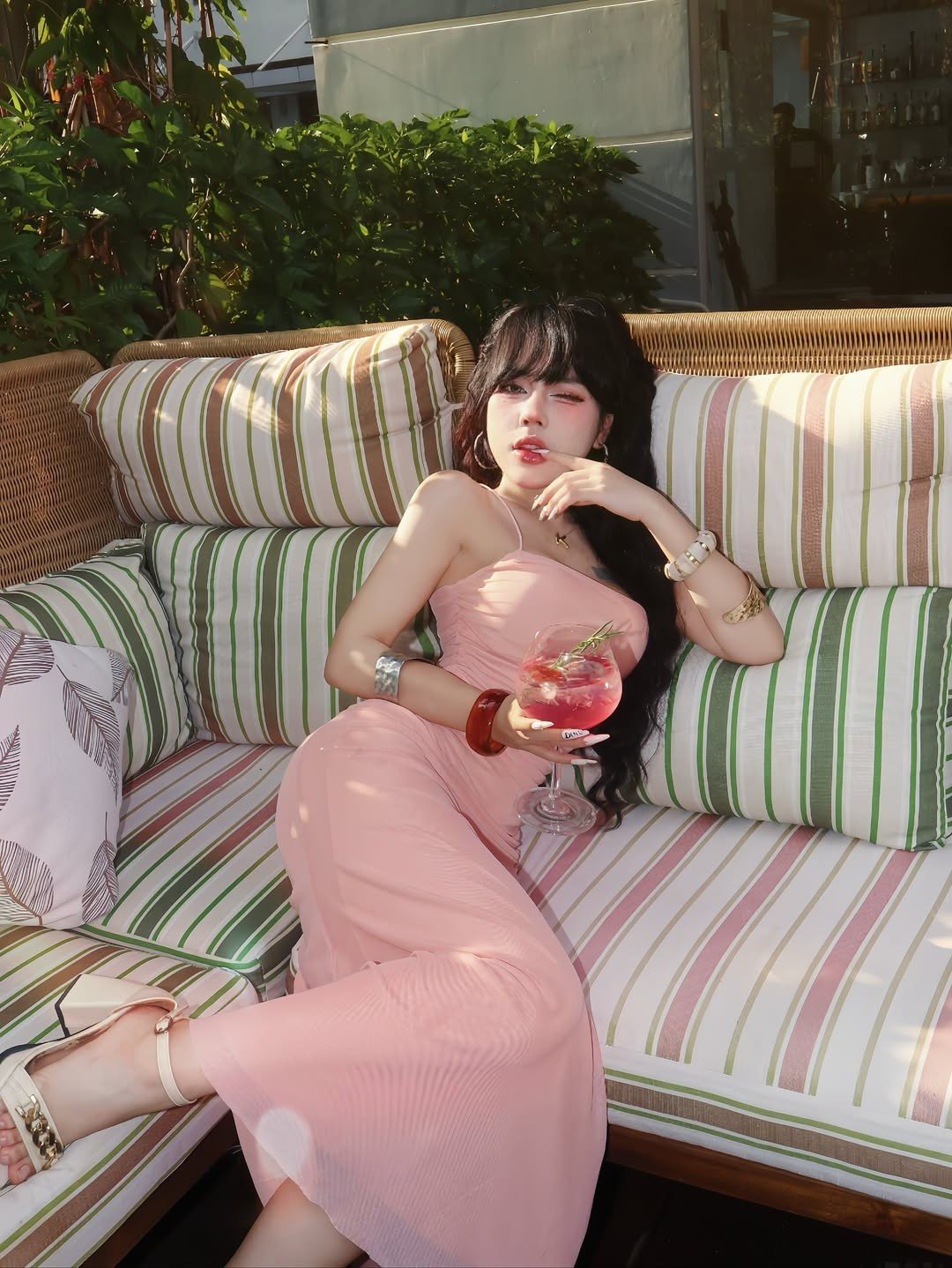 Hot girl Bao Khuyen Susan continues to make a strong impression with her sweet beauty and captivating aura in her latest social media images She showcases her innocent charm and elegant little wife style wearing a seductive yet graceful pink dress Bao Khuyen Susan exudes natural allure as she relaxes on a comfortable sofa with a refreshing cocktail Her gentle yet sophisticated demeanor truly captivates every gaze Fans constantly admire her radiant beauty and refined fashion sense affirming the undeniable appeal of a new beauty icon This look perfectly blends cuteness with subtle sensuality making her a trending topic online