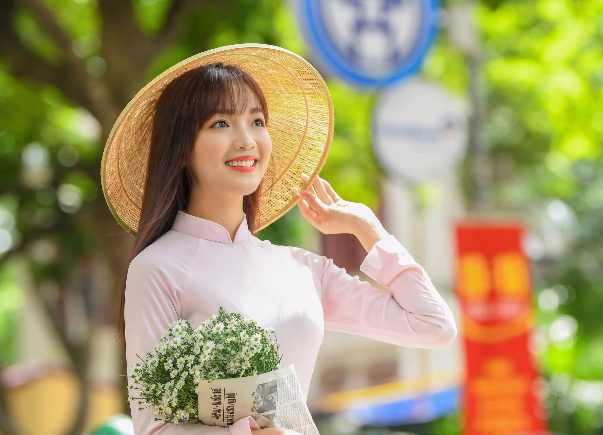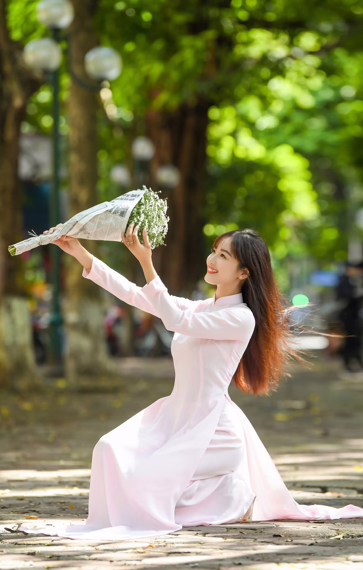 Vietnamese Ao Dai Beauty: Graceful Girl with Flowers.