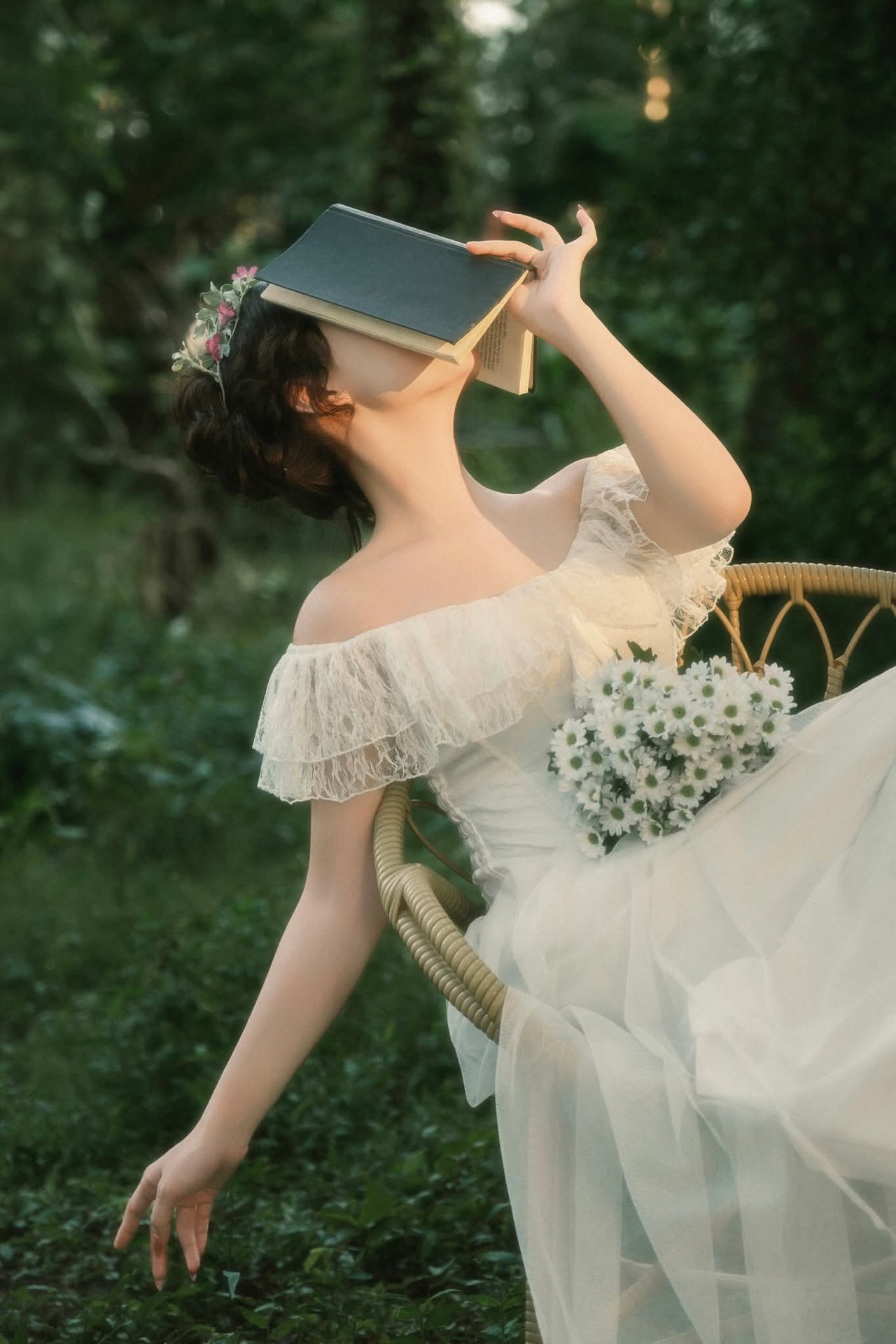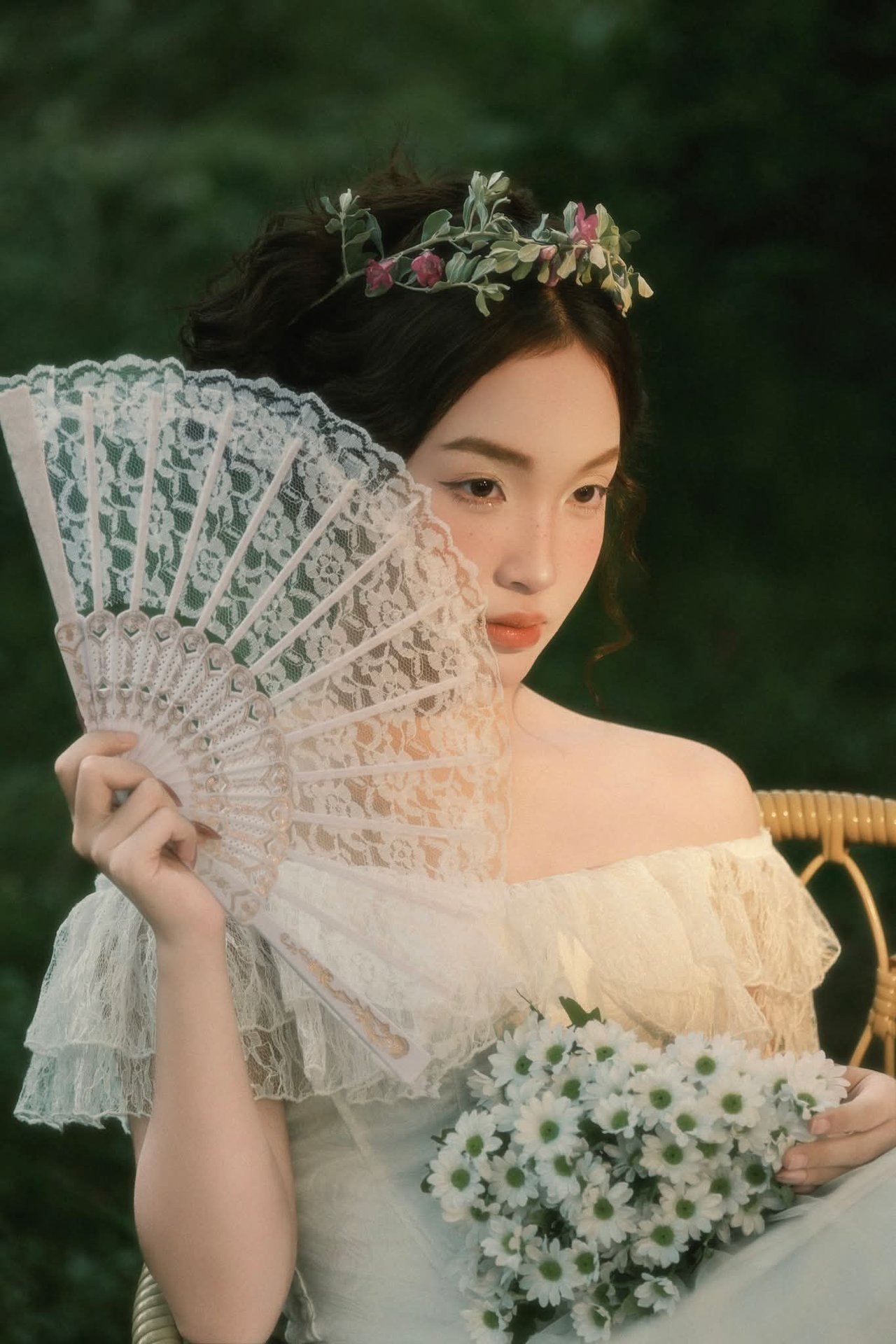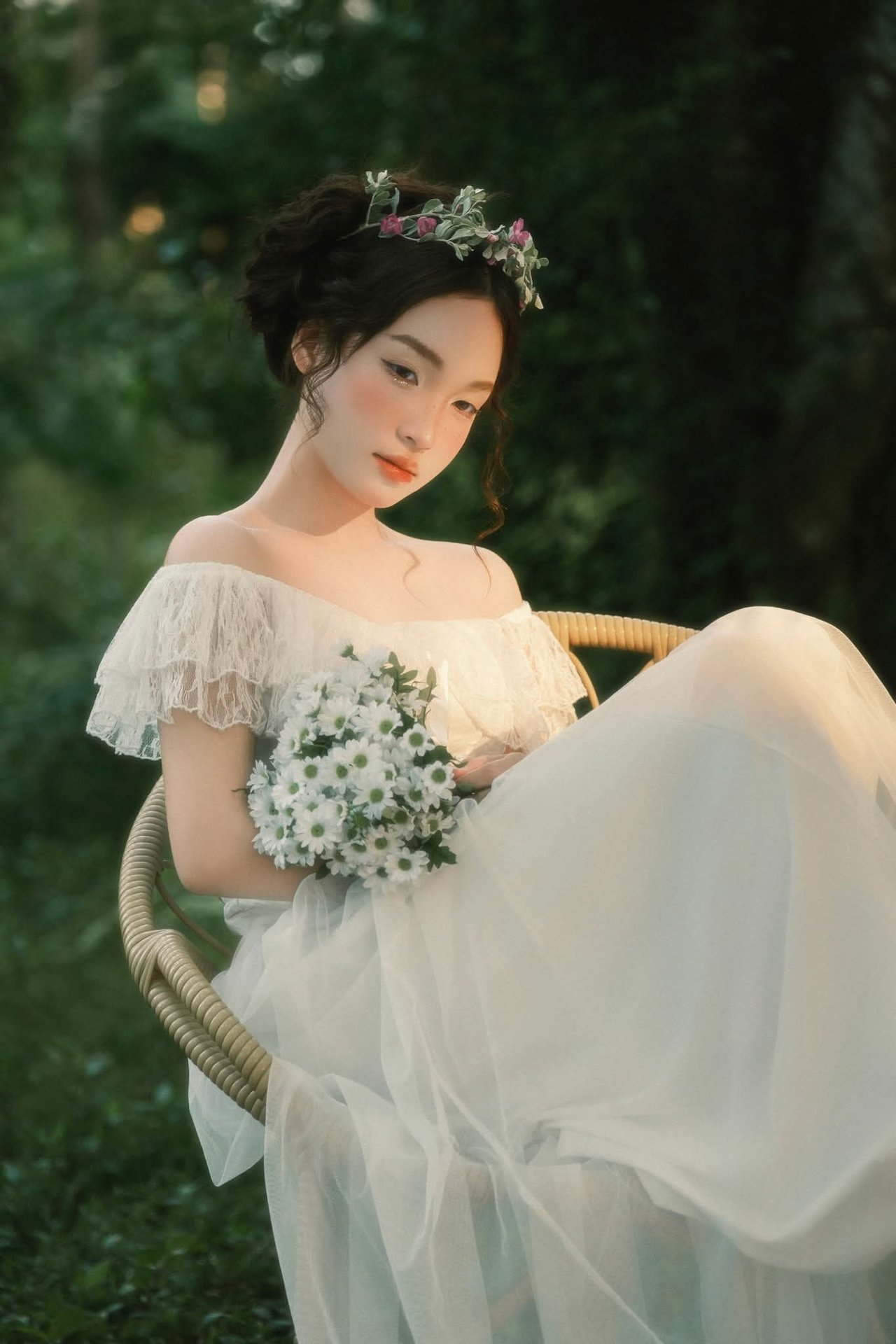 This photograph captures the ethereal beauty of a young woman. She sits gracefully in a wicker chair, adorned in a pristine white, off-shoulder dress that highlights her delicate shoulders. Her dark hair is styled up, crowned with a fresh flower wreath, creating a truly poetic image. In her arms, she gently holds a small bouquet of white daisies, symbolizing purity. Soft light filters through the lush green foliage in the background, enveloping the space in a dreamy, almost magical atmosphere. The woman's delicate, demure beauty, combined with the harmonious natural setting, transports viewers into a fairytale world where everything feels enchanting and romantic. It is a moment of serene charm and timeless elegance.