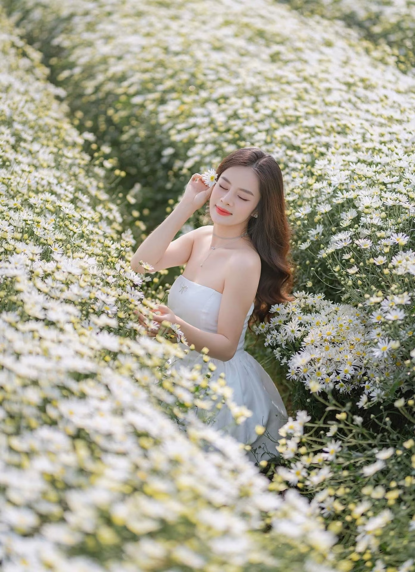 This VGU No.22 image captures a breathtaking moment of a graceful girl amidst a pristine field of white daisies. The gentle muse, adorned in a pure white dress, seamlessly merges with the flower-filled landscape. Her closed eyes and soft smile radiate an aura of peace and innocence. More than just a beautiful photograph, it evokes a profound emotion of harmony between humanity and nature. Each tiny daisy seems to cherish the girl's beauty, creating a dreamy, romantic tableau. The picture recalls beautiful youthful moments where the soul finds relaxation and tranquility. The natural charm and elegance of the girl illuminate the entire flower field, offering a light, airy sensation. #Vietnamese #pretty #charm