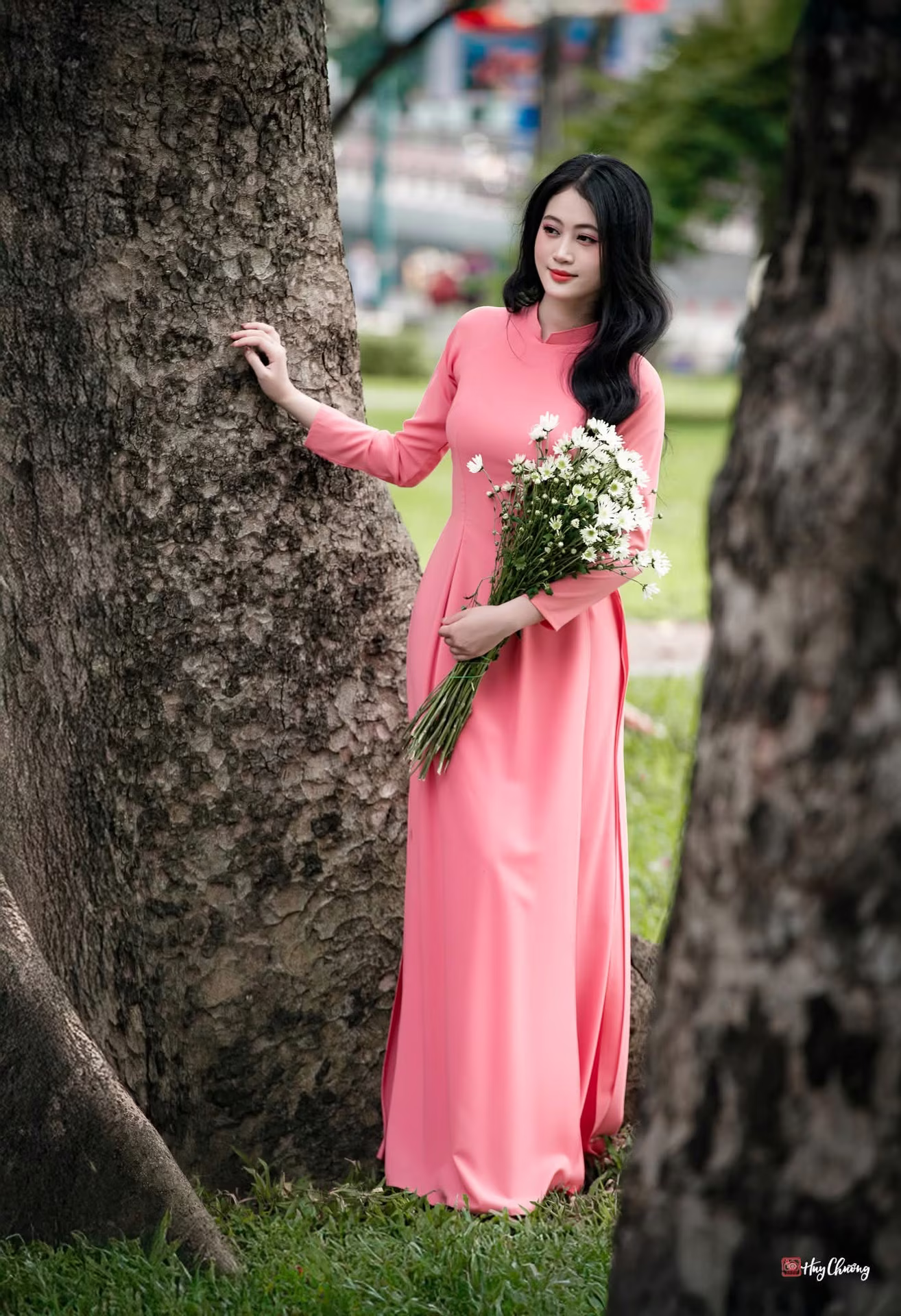 VGU No.18 captures a stunning Vietnamese young woman adorned in a flowing pink Ao Dai exuding elegance and grace. Her long raven hair frames a delicate face, and her dreamy gaze directed upwards adds a layer of emotion and depth to the moment. In her hands she holds a pristine bouquet of white daisies symbolizing purity and simple beauty further enhancing her charming Asian allure. The lush green natural backdrop provides a serene setting beautifully complementing the vibrant pink of her traditional attire. This image perfectly blends traditional aesthetics with the fresh vitality of youth creating a captivating and soulful portrait. #Vietnamese #pretty #charm