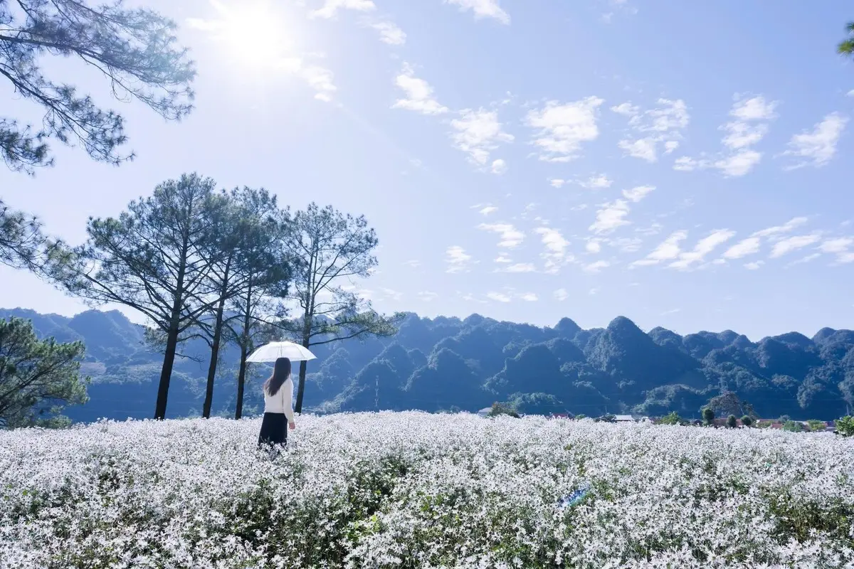 This stunning photograph captures a graceful young woman standing amidst a vast sea of pure white daisy flowers in Moc Chau. The elegant figure poses gently with a white umbrella blending seamlessly into the pristine ambiance of the plateau. The endless expanse of pure white daisies creates a romantic and poetic scenery characteristic of Moc Chau tourism during flower season. In the distance majestic mountain ranges and tall pine trees further enhance the serene and cool beauty of this region. This is truly an ideal check-in spot for anyone wishing to capture beautiful photographs and cherish memories of a captivating Moc Chau winter.