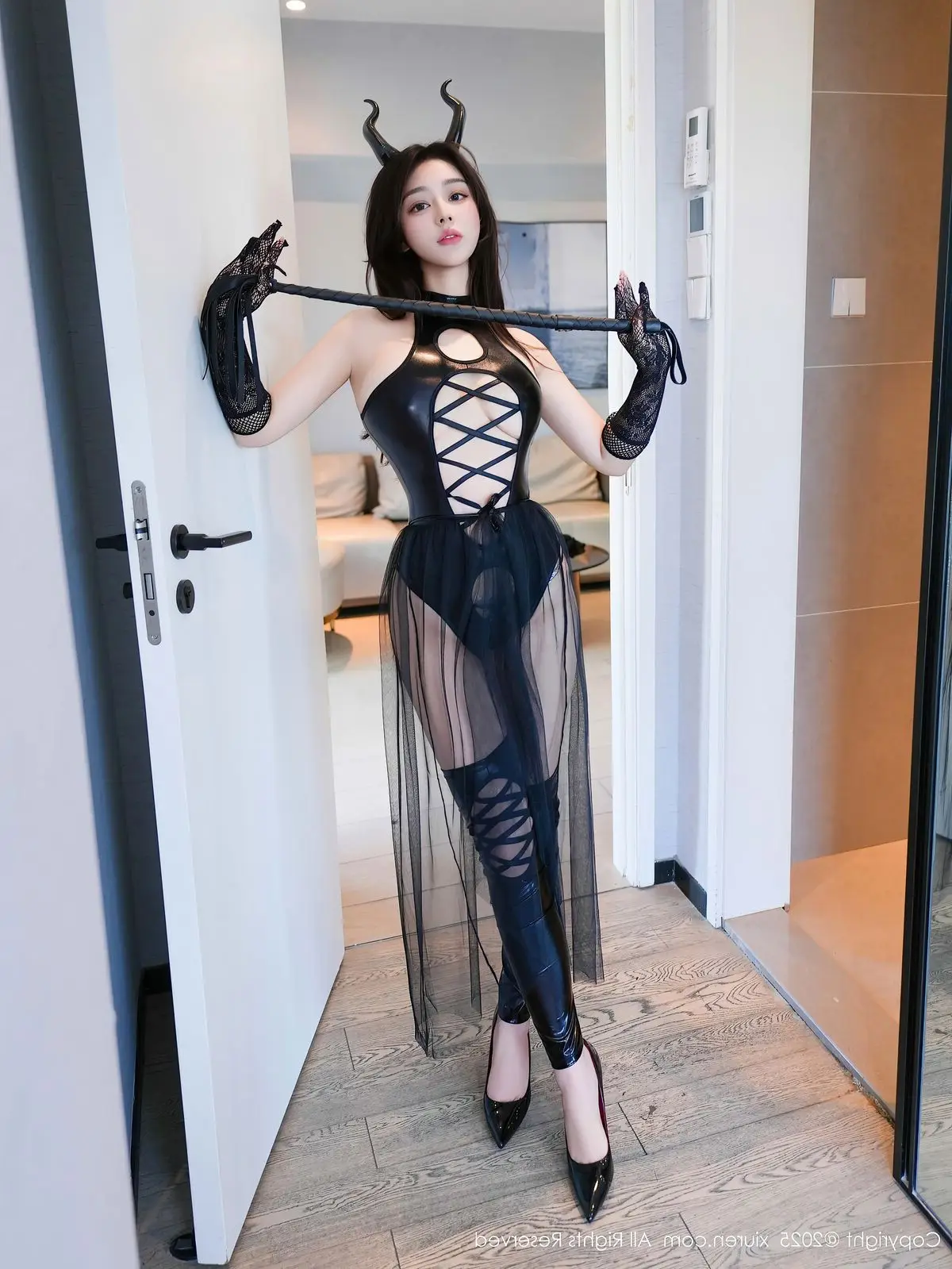 The XiuRen No.10607 collection unveils Yun Ying Luo in a captivating and mysterious style. She is featured in an all-black ensemble inspired by an enigmatic, dark aesthetic, perfectly blending strength with subtle sensuality. The delicate horns, form-fitting bodysuit, and striking high-heeled boots accentuate her slender figure and confident demeanor. Yun Ying Luo poses gracefully on a table, her deep gaze fixed on the camera, creating an alluring connection. The minimalist yet elegant background further highlights her unique beauty and irresistible charm. This debut showcases her distinct personality and leaves a lasting impression.#YunYingLuo #XiuRen #Model #SensualFashion #DarkAesthetic