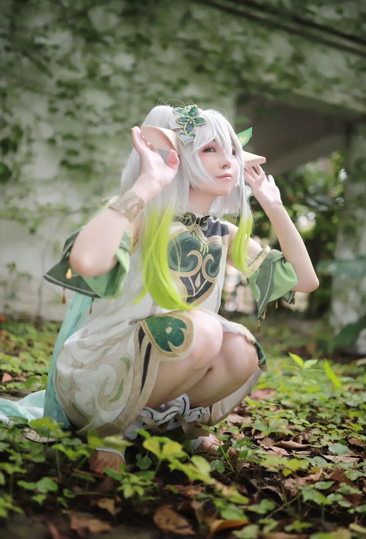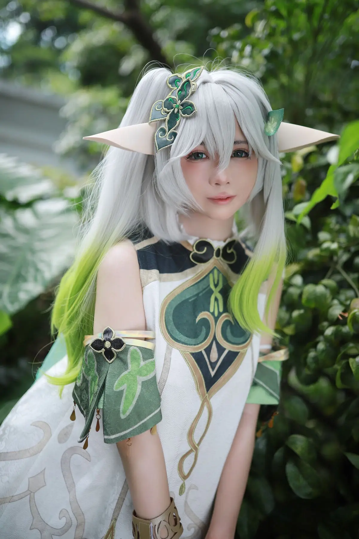 Immerse yourself in the enchanting world of Genshin Impact with Coser Uesugi Erika’s captivating portrayal of Nahida. Her iconic white and green hair adorable pointed ears and exquisitely detailed costume perfectly capture the essence of the Dendro Archon. With a mischievous smile alluring gaze and delicate gestures Erika embodies a beauty that is both innocent and captivating. The photo not only showcases meticulous attention to costume detail but also successfully conveys Nahida’s ethereal charm offering a visually stunning and memorable experience for fans. Every element from the verdant crown to the golden patterns on her attire is carefully crafted creating a harmonious and utterly charming overall look.#CoserUesugiErika #Nahida #GenshinImpactCosplay #DendroArchon #CosplayGirl