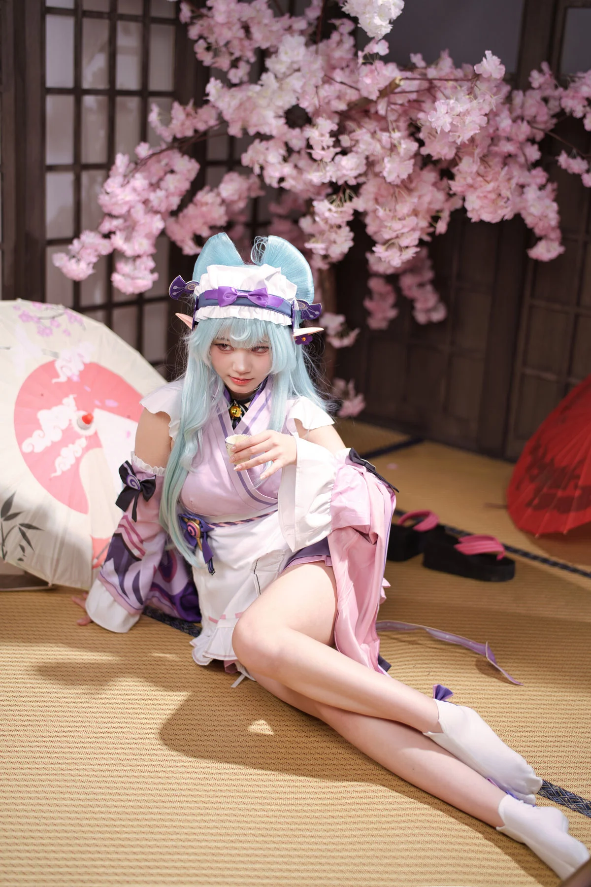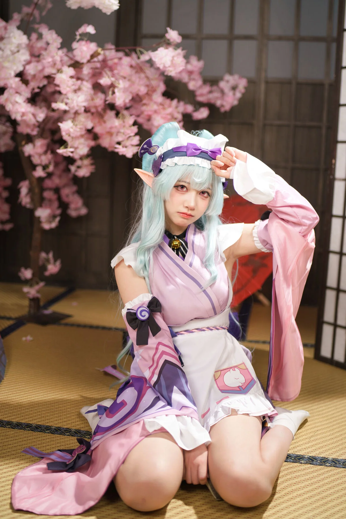 Step into a realm where art meets imagination with the stunning Ran Ran Zi Ya in this YiTuYu Art Language Vol.8873 collection. The visual narrative is woven through a delicate balance of pastel pinks and traditional oriental motifs, creating an atmosphere that is both nostalgic and avant-garde. The model’s soft blue hair and pointed elf ears add a touch of otherworldly charm, while her thoughtful gaze invites the viewer into a world of poetic elegance. The outfit showcases a brilliant fusion of textures, featuring airy ruffles, structured bows, and flowing sleeves that embody a modern take on classical aesthetics. Set against a backdrop of warm lanterns and rich crimson patterns, the lighting highlights a mood of serene mystery. Every detail, from the traditional footwear to the intricate headpiece, is a testament to sophisticated costume design and visual storytelling. This collection captures a fleeting moment of grace, making it a perfect inspiration for those who appreciate the intersection of fashion, cosplay, and fine art photography.#RanRanZiYa #ArtLanguage #DreamyAesthetic #CosplayPhotography #FashionInspiration
