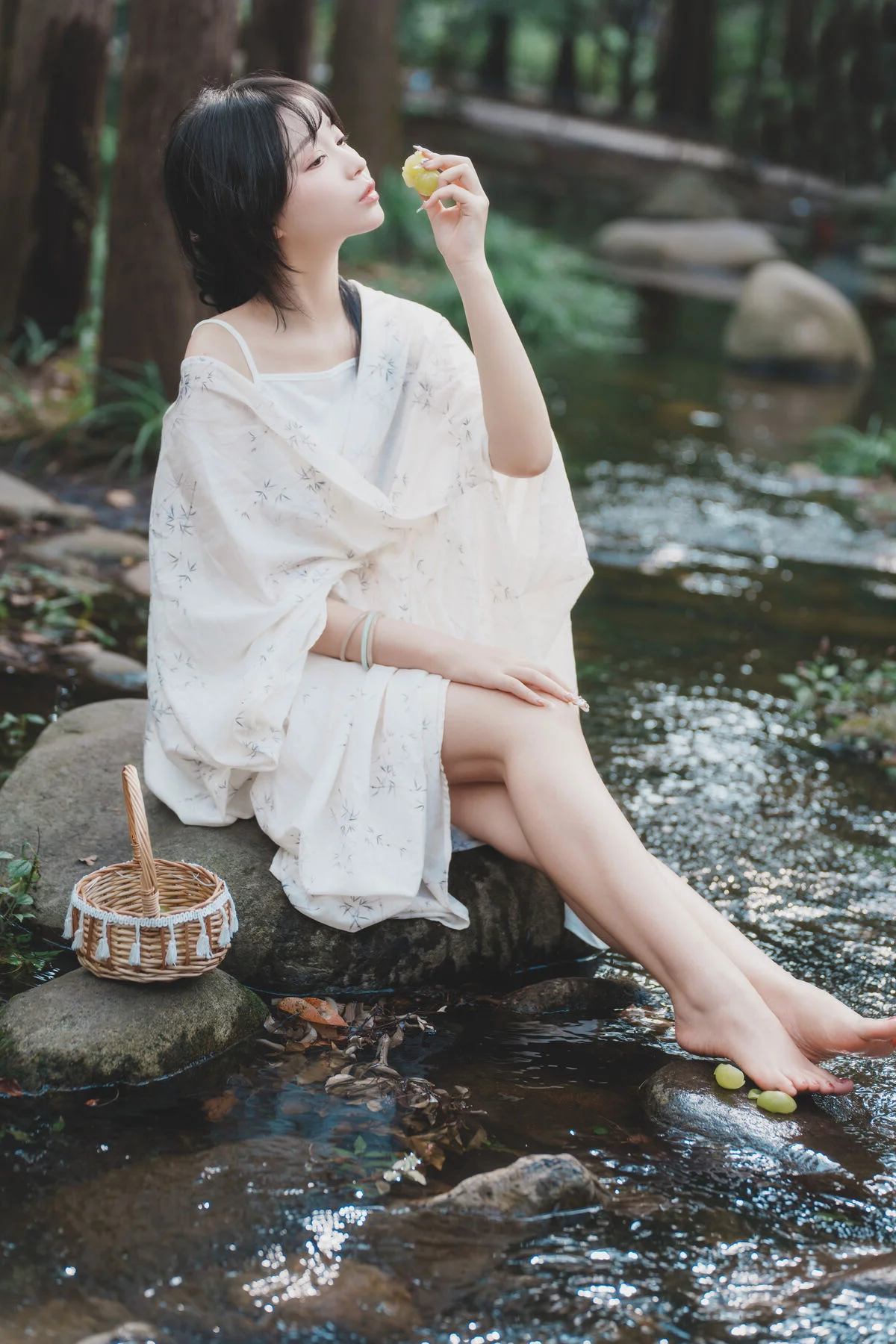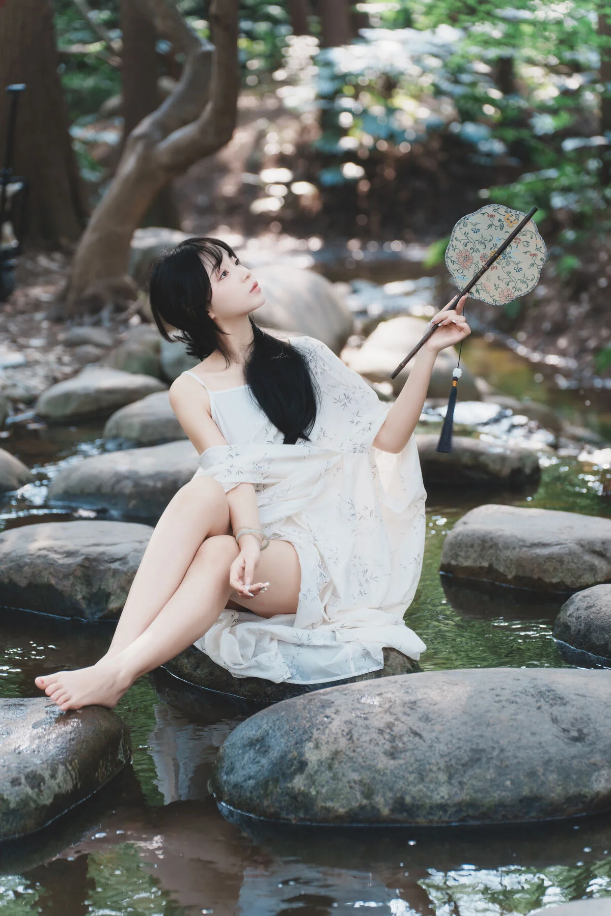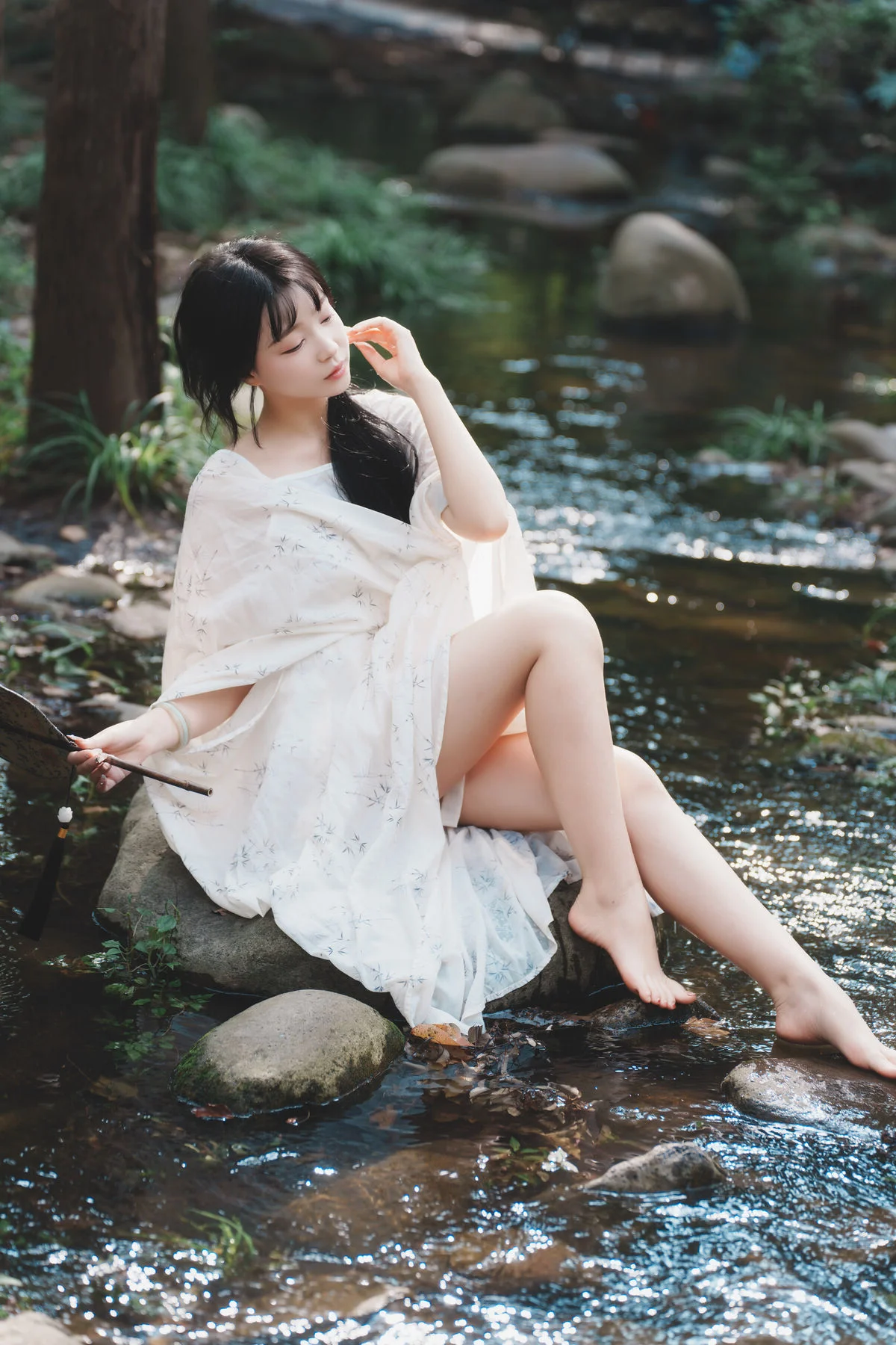 In the heart of a lush forest, Disexi Si Ning embodies the essence of a woodland nymph for the YiTuYu Art Language Vol.8875 collection. Her choice of attire, a flowing white ensemble made of lightweight and breathable fabric, perfectly captures the soft sunlight dancing through the canopy. There is a poetic stillness in her gaze, complemented by the gentle ripples of the stream and the traditional round fan she holds with such grace. The visual storytelling here is profound, blending modern fashion sensibilities with a timeless, nostalgic atmosphere. As she playfully splashes the cool water, the droplets catch the light like scattered diamonds, adding a dynamic layer to the otherwise serene composition. This series is more than just photography; it is a visual exploration of tranquility and elegance, inviting the viewer to lose themselves in a world where nature and fashion exist in perfect, quiet harmony.#DreamyAesthetic #ForestFairy #YiTuYu #ArtLanguage #FashionInNature