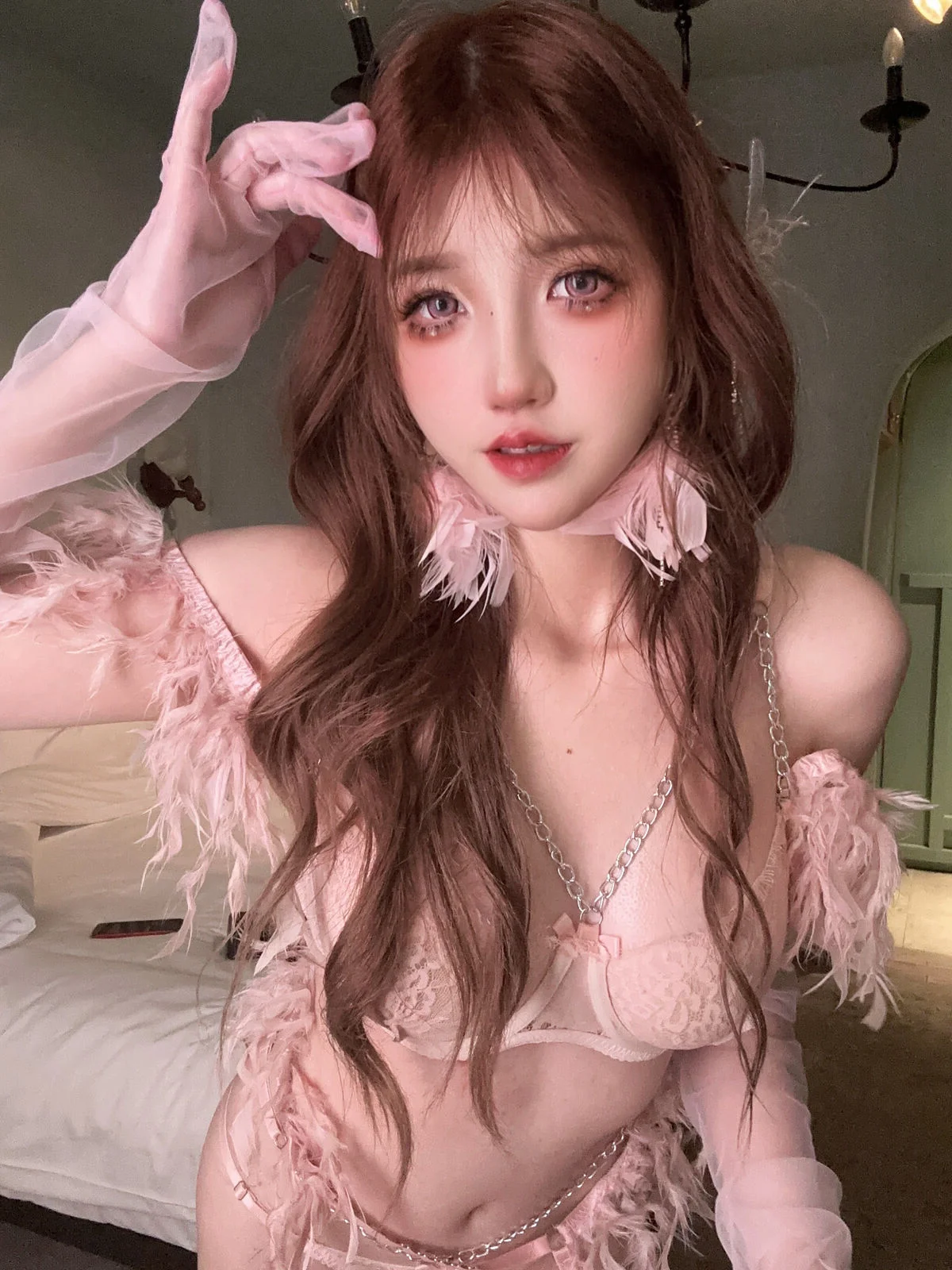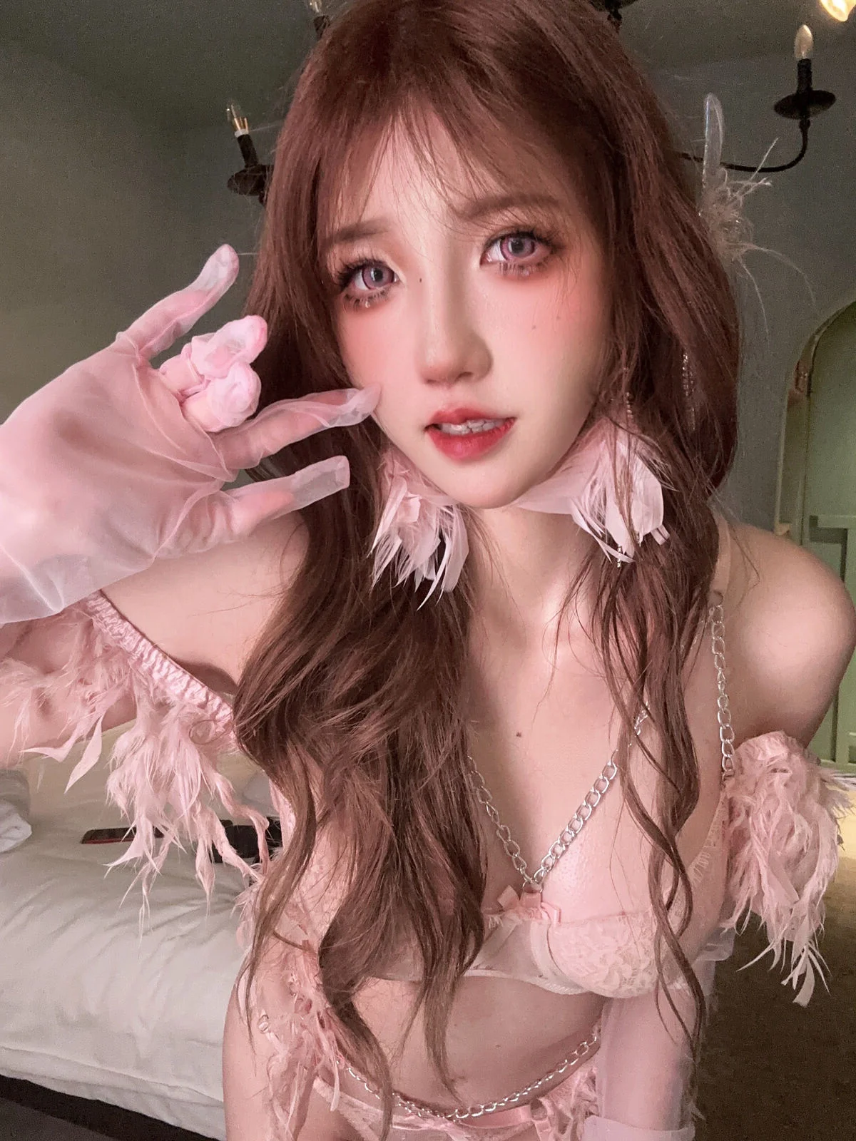 This visual masterpiece captures a dreamy and poetic atmosphere featuring Coser kaOri in a delicate pastel pink ensemble. The highlight of the outfit is the soft feather detailing elegantly placed on the shoulders and neck, perfectly embodying the theme. Her gaze is both innocent and alluring, complemented by soft wavy hair that adds a touch of whimsical charm to the entire look. The choice of sheer lace paired with fine metallic chains showcases a sophisticated sense of style and artistic vision. Bathed in warm, soft lighting, the composition highlights her radiant skin and angelic aura against a classic interior backdrop. It is a beautiful intersection of fashion and emotion, creating a moment of pure visual inspiration that feels like a scene from a modern fairy tale. The overall vibe is minimalist yet deeply expressive, making it a perfect example of high-end portrait photography that celebrates feminine grace and artistic maturity.#Axun #Kaori #DreamyAesthetic #PastelPink #PortraitPhotography #FeatherStyle