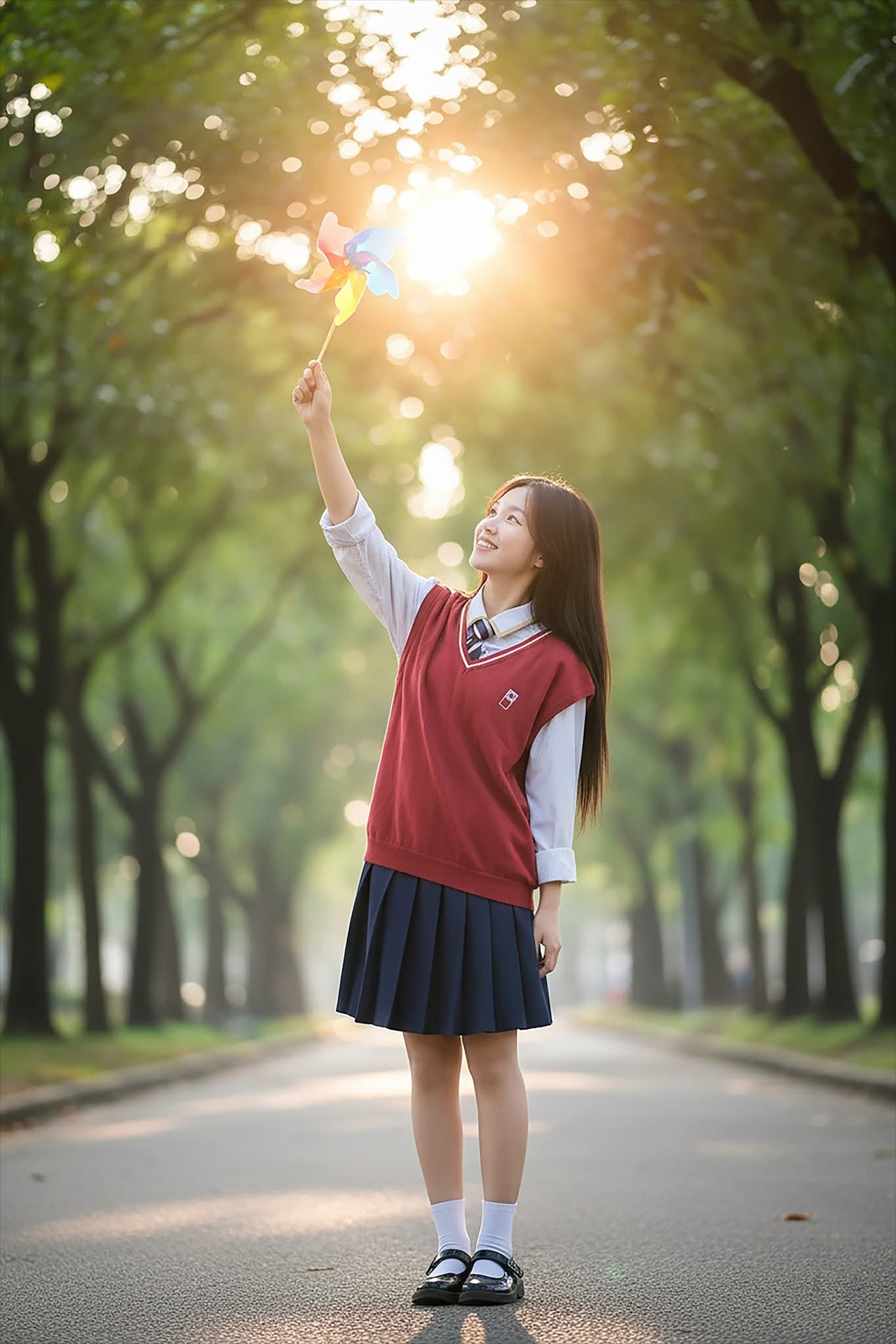 This image captures the innocent moment of a female student in a familiar school uniform: a white shirt, red vest, and blue skirt. With a radiant smile and pure eyes, the girl exudes youthful and vibrant beauty. The background features a serene tree-lined path, creating a peaceful and poetic setting that enhances the image of school age. This photograph symbolizes innocence, natural beauty, and cherished memories of student life. It is an ideal visual for projects related to education, youth, and the purity of adolescence, perfectly embodying the spirit of a bright student.Stories