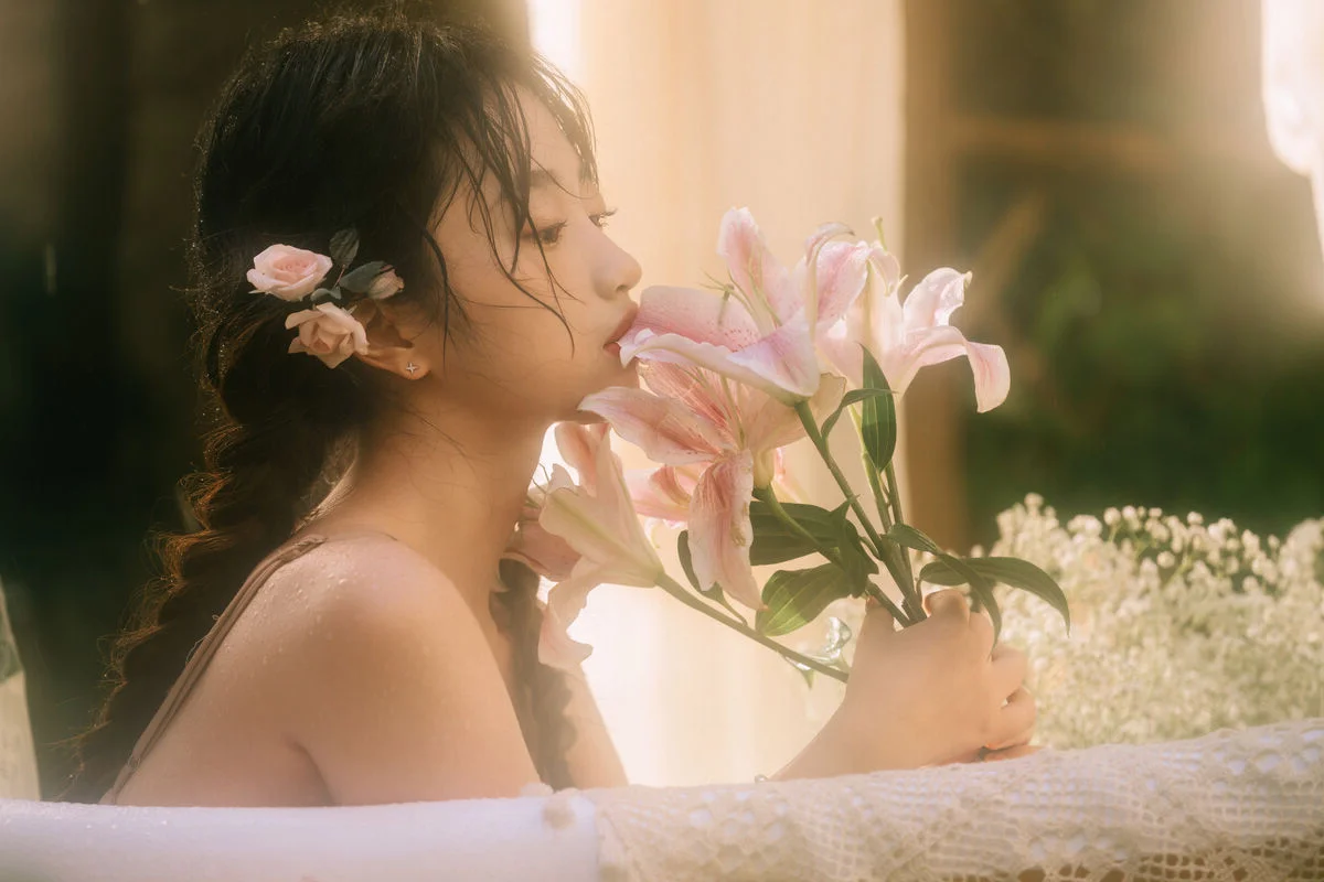 Bathed in the soft glow of golden hour, Qian Yao Zi emerges like a delicate dream in this latest edition of YiTuYu Vol.8926. Embracing the essence of Art Language, the visual storytelling captures a moment of pure serenity and introspective beauty. The model's gentle expression, paired with intricately braided hair adorned with tiny blossoms, evokes a nostalgic Cottagecore aesthetic that feels both timeless and enchanting. Every detail, from the soft lace textures to the fragrant lilies surrounding her, contributes to a cinematic atmosphere that celebrates femininity and nature. This collection is more than just photography; it is a visual poem that speaks of quiet afternoons and the whispers of a hidden garden. The warm, hazy lighting enhances the mood and tone, creating a sense of peace that resonates deeply with the viewer. Whether you are a lover of vintage fashion or fine art portraiture, the ethereal charm of Qian Yao Zi in this series offers a breathtaking escape into a world of elegance and grace.