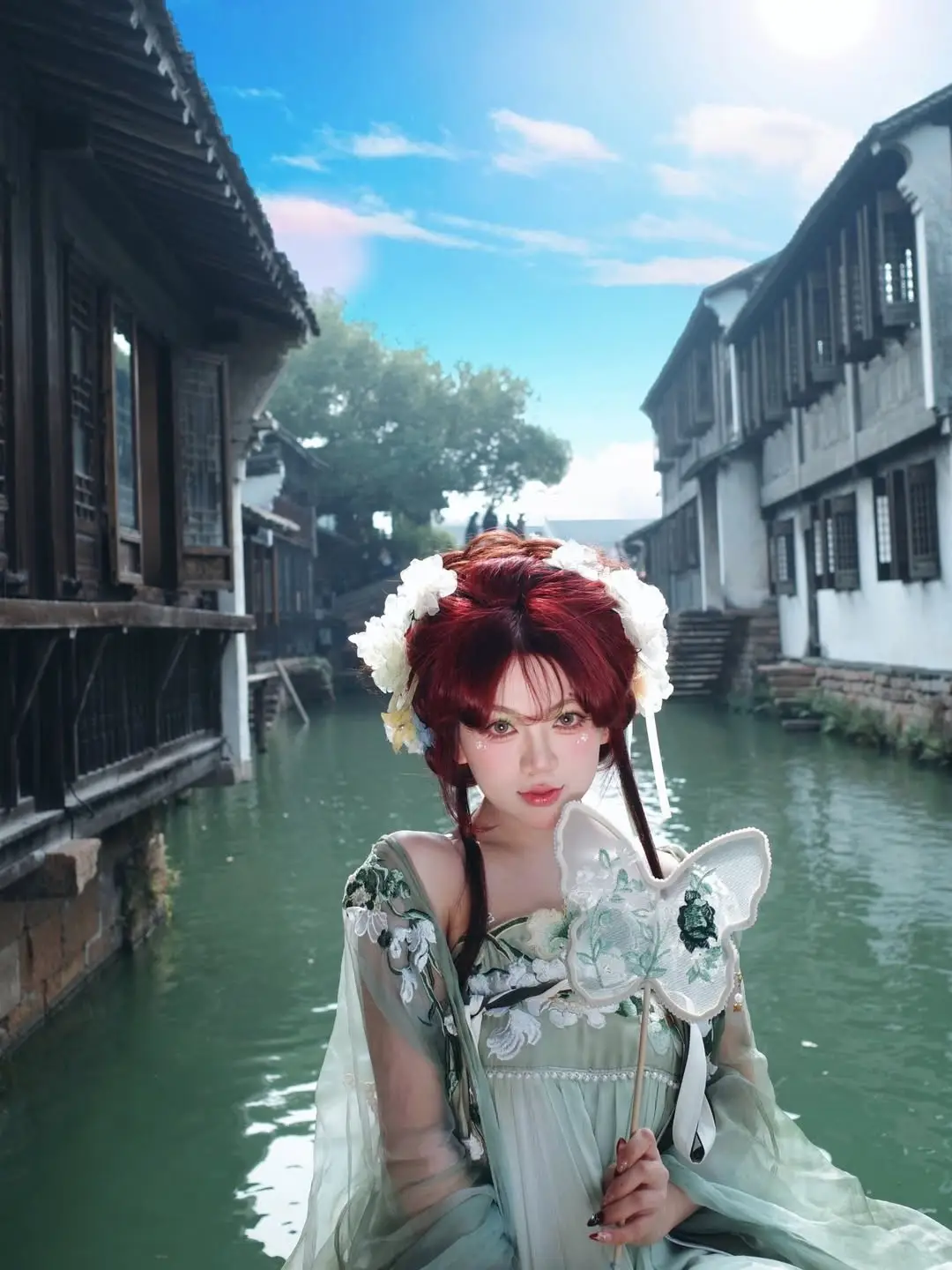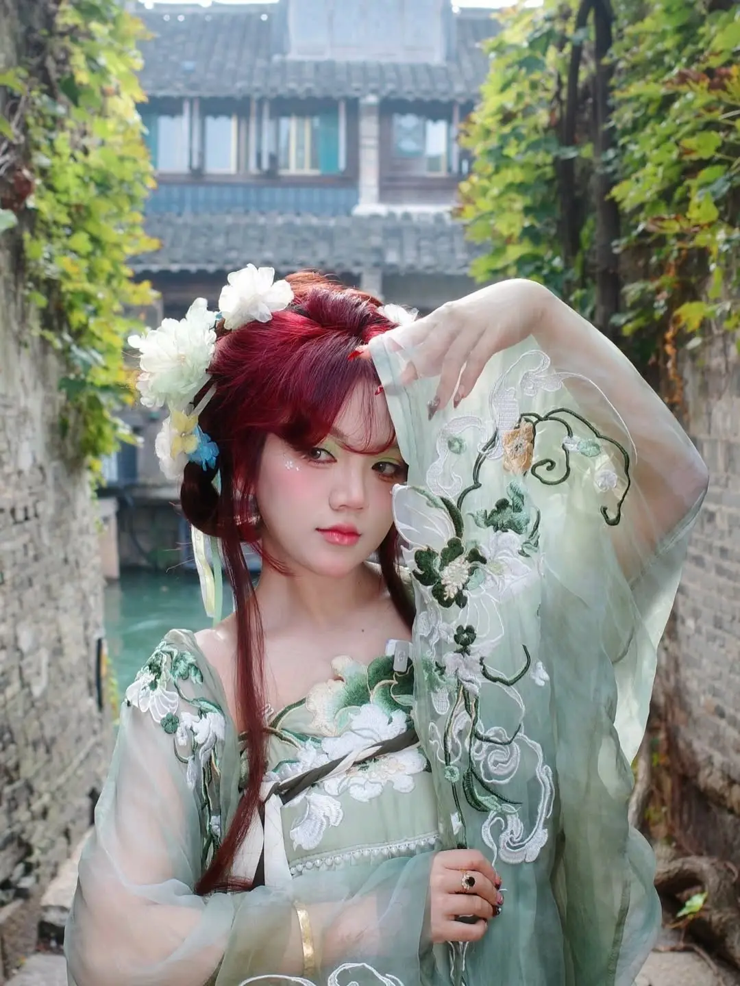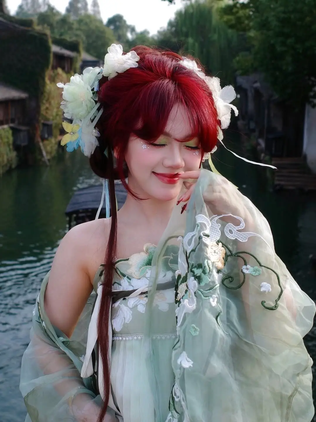 Hot girl Bao Han Helia once again captivates fans with her enchanting ancient-style photoshoot. In this series she gracefully poses on a rustic wooden bridge amidst the historic ambiance of a Chinese ancient town. Dressed in an elegant emerald green traditional costume (Hanfu) adorned with delicate white flowers in her red hair her ethereal beauty truly makes her appear like a celestial fairy descended to earth. The ancient town's scenery with its classic architecture lush greenery and a mystical moonlit sky blends seamlessly to create a romantic and poetic tableau. This artistic collection not only showcases her radiant charm but also beautifully intertwines with rich traditional culture transporting viewers into an enchanting fairytale world.