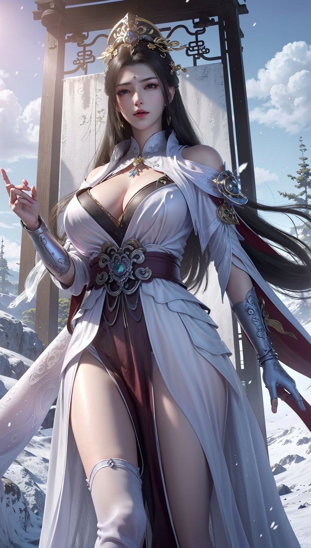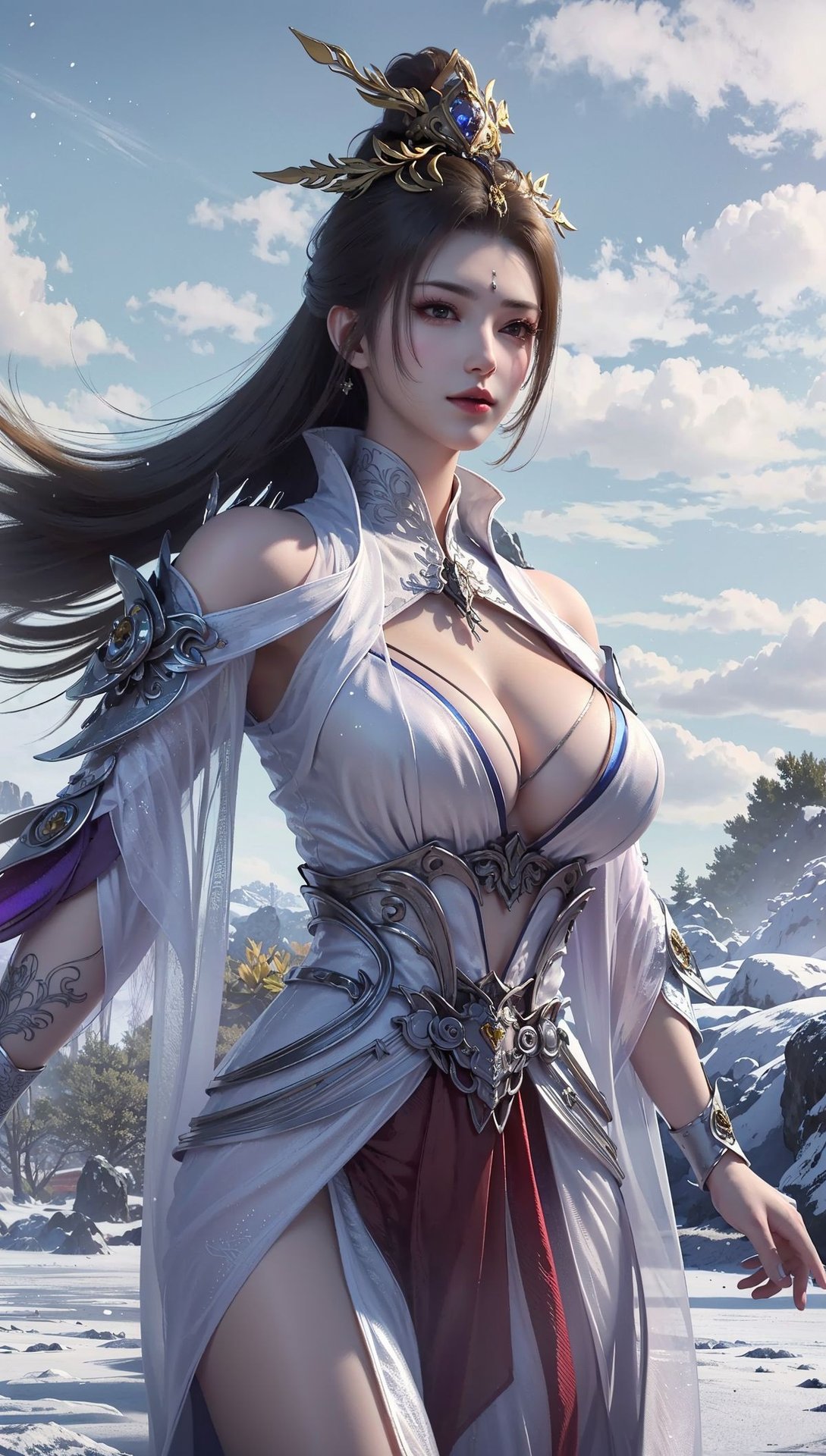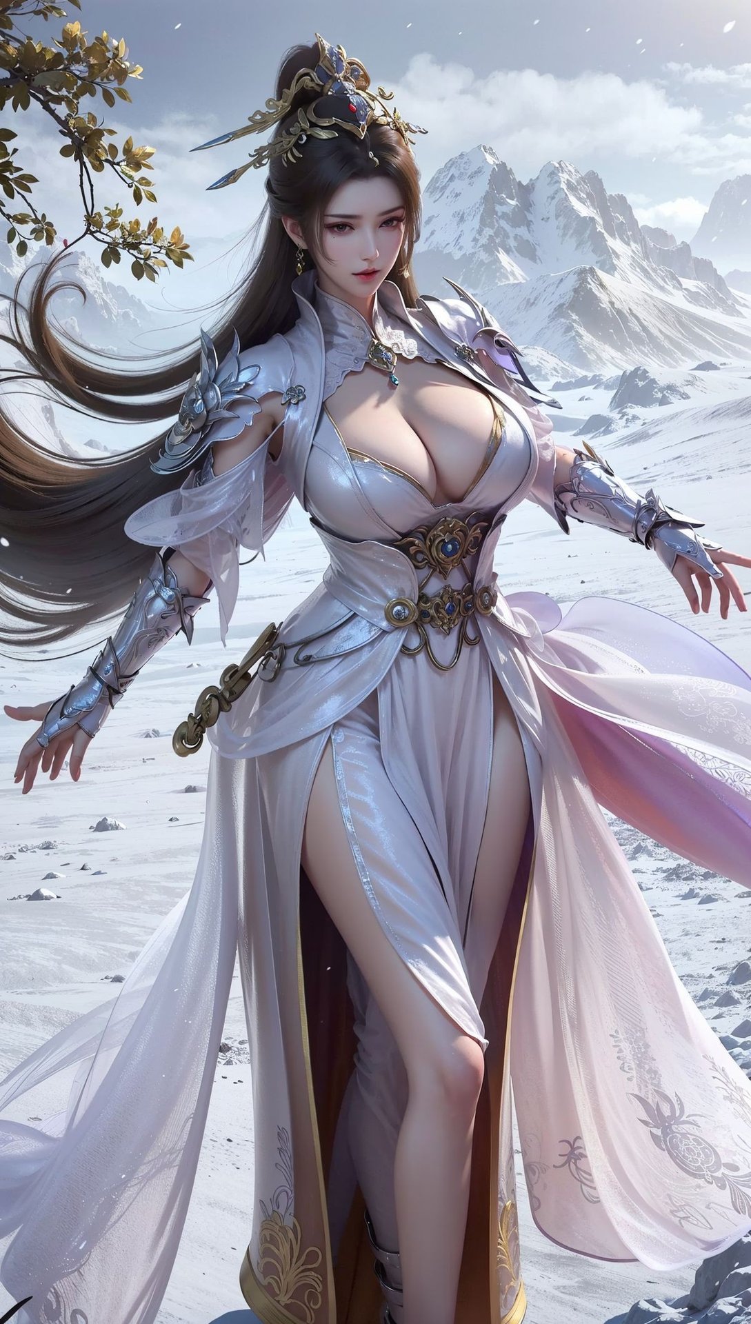 This AI Generated image portrays an exquisite female general adorned in an intricately detailed ancient fantasy costume. She possesses a delicate beauty with long dark hair, crowned by a resplendent golden headpiece, and draped in a flowing silver-white gown embellished with elegant blue and gold motifs. The costume's design subtly highlights her graceful figure with a captivating allure. A backdrop of pristine white snow creates an ethereal winter landscape, further accentuating the character's noble aura and mysterious demeanor. This portrayal is ideal for a web game's female general version, showcasing a perfect fusion of AI technology and fantasy art, delivering an impressive and emotionally rich visual experience.