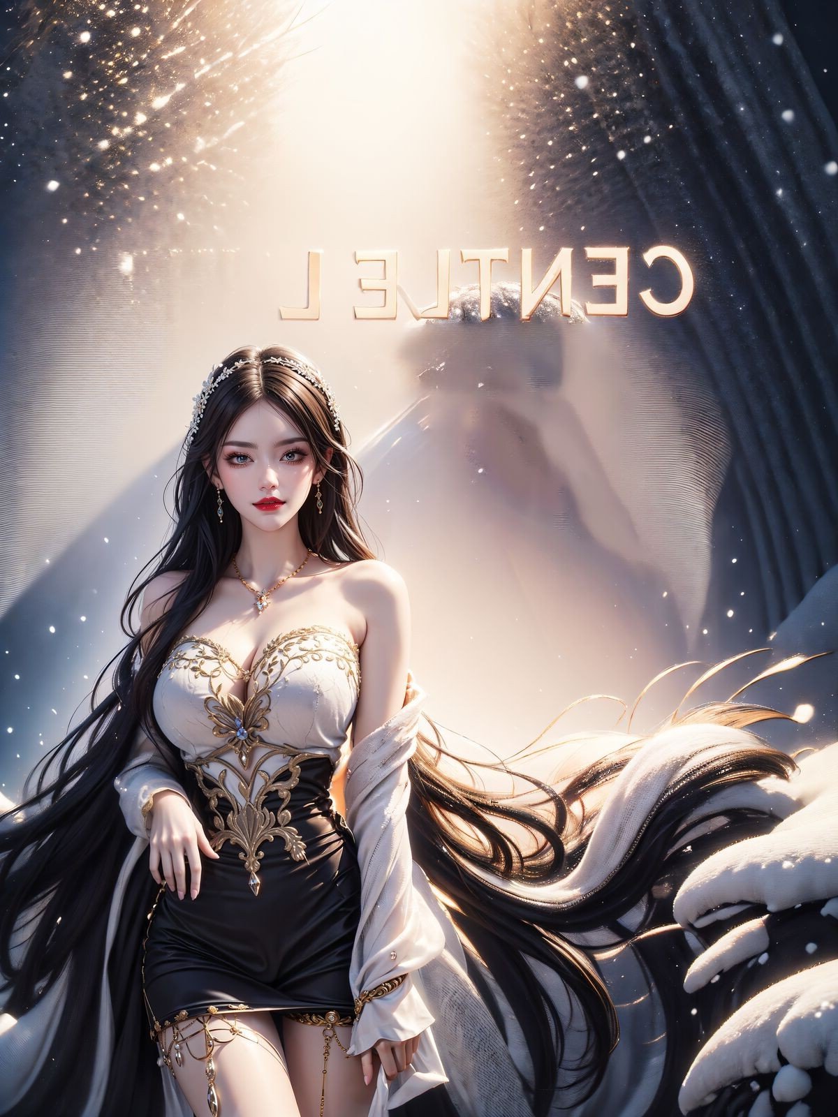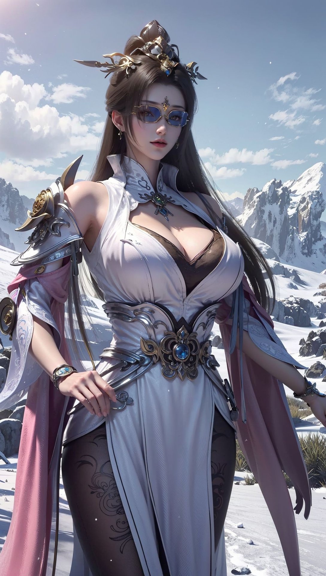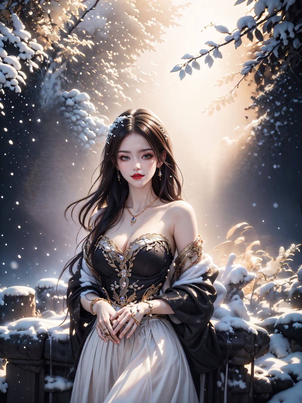 This AI Generated image portrays an exquisite female general adorned in an intricately detailed ancient fantasy costume. She possesses a delicate beauty with long dark hair, crowned by a resplendent golden headpiece, and draped in a flowing silver-white gown embellished with elegant blue and gold motifs. The costume's design subtly highlights her graceful figure with a captivating allure. A backdrop of pristine white snow creates an ethereal winter landscape, further accentuating the character's noble aura and mysterious demeanor. This portrayal is ideal for a web game's female general version, showcasing a perfect fusion of AI technology and fantasy art, delivering an impressive and emotionally rich visual experience.
