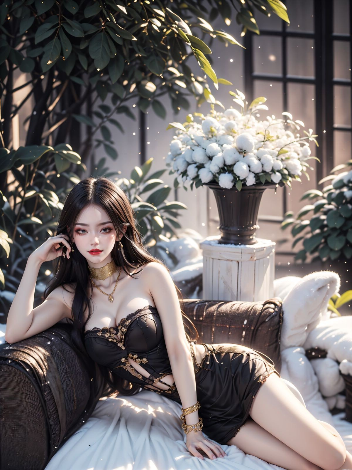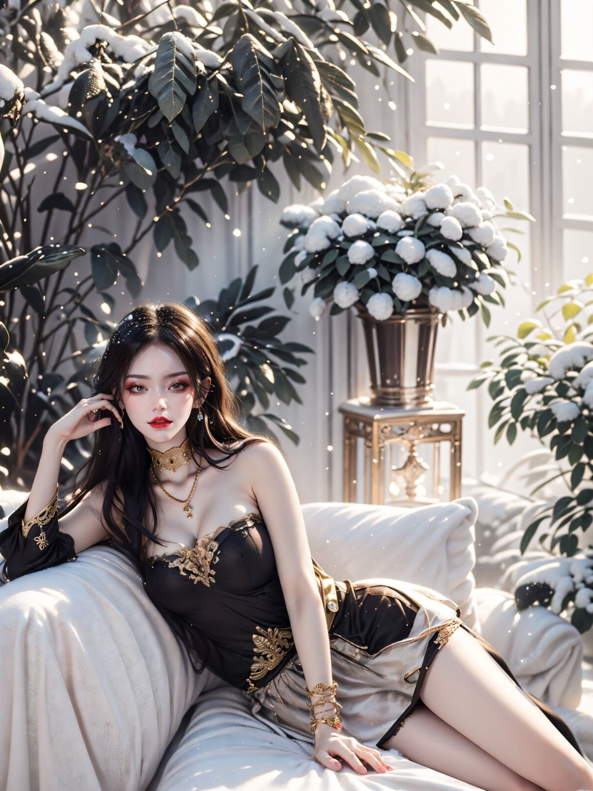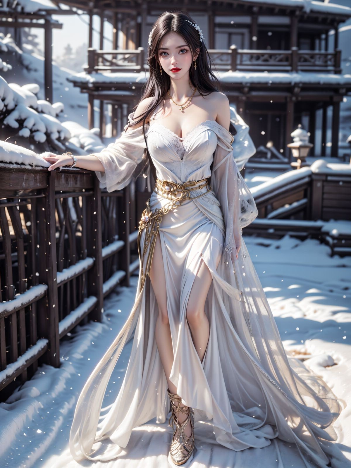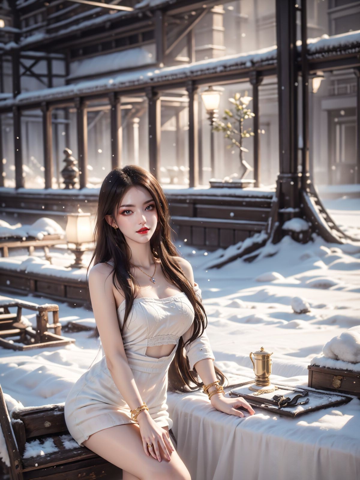 This stunning AI generated artwork features the captivating Medusa from Battle Through the Heavens. She is portrayed with an alluring and enchanting beauty sitting gracefully on snow covered stone steps. Her pristine white dress elegantly drapes her slender figure enhancing her ethereal and mystical charm. Long dark flowing hair and deep expressive eyes convey the mystery and power of the serpent queen. Despite the icy and cold surroundings Medusa maintains a serene demeanor exuding an undeniable allure. This is a masterful piece of AI art bringing the character vividly to life as if stepping directly from a fantasy realm. Medusas beauty amidst the winter landscape creates a striking contrast that captures every gaze.