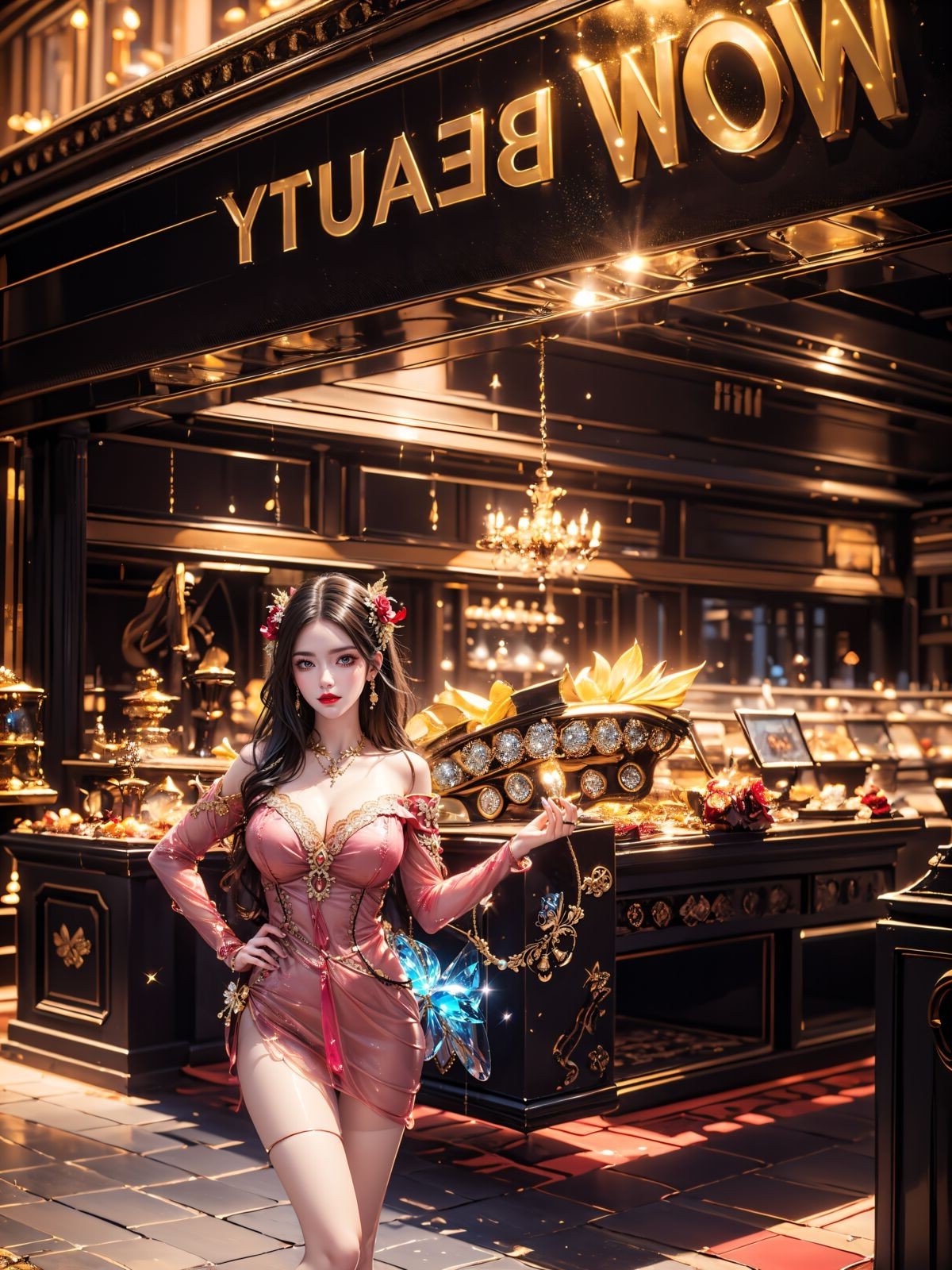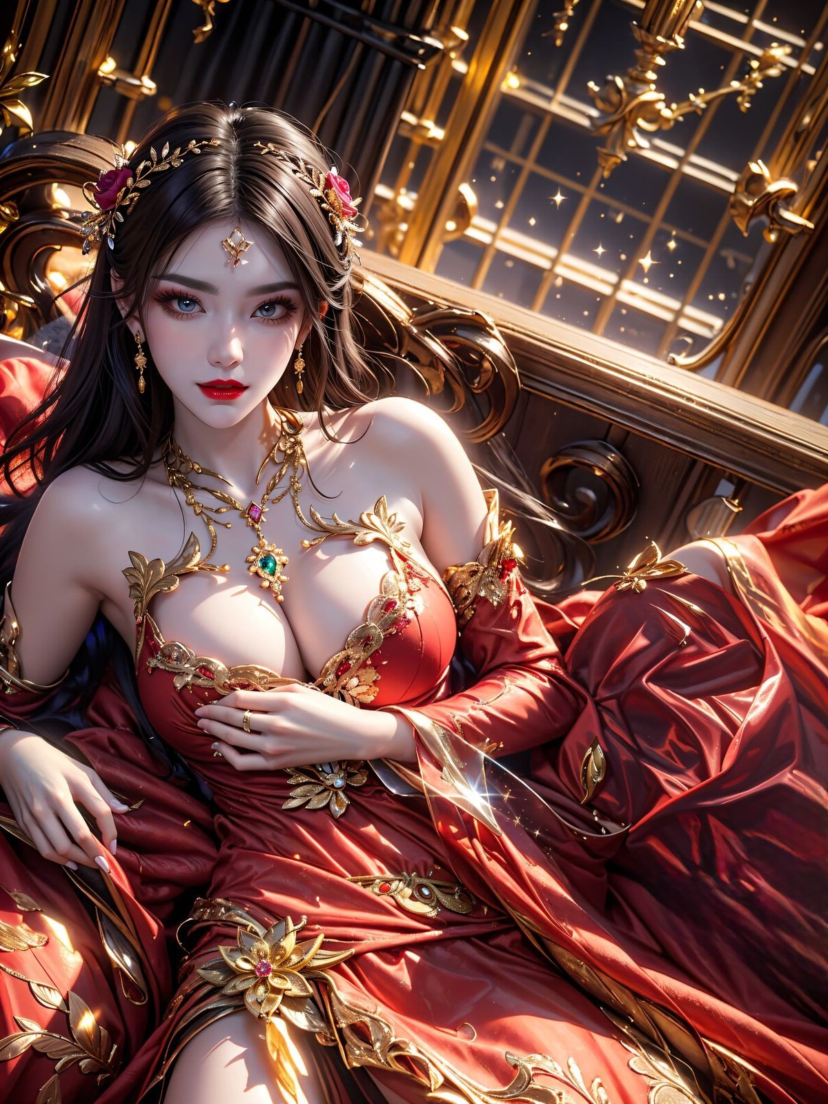 This stunning image showcases Coser luobao1221洛宝 embodying an enchanting fantasy persona. She radiates magnificent beauty adorned in an exquisite jeweled headpiece and an intricately designed necklace. The ornate costume meticulously crafted highlights her elegance and allure. With long dark hair and sophisticated makeup luobao1221洛宝 perfectly transforms into her character. The blurred background with shimmering lights further enhances the mystical and dreamlike atmosphere of the photograph. This is a high quality artistic work demonstrating the elaborate effort and talent of the Coser.