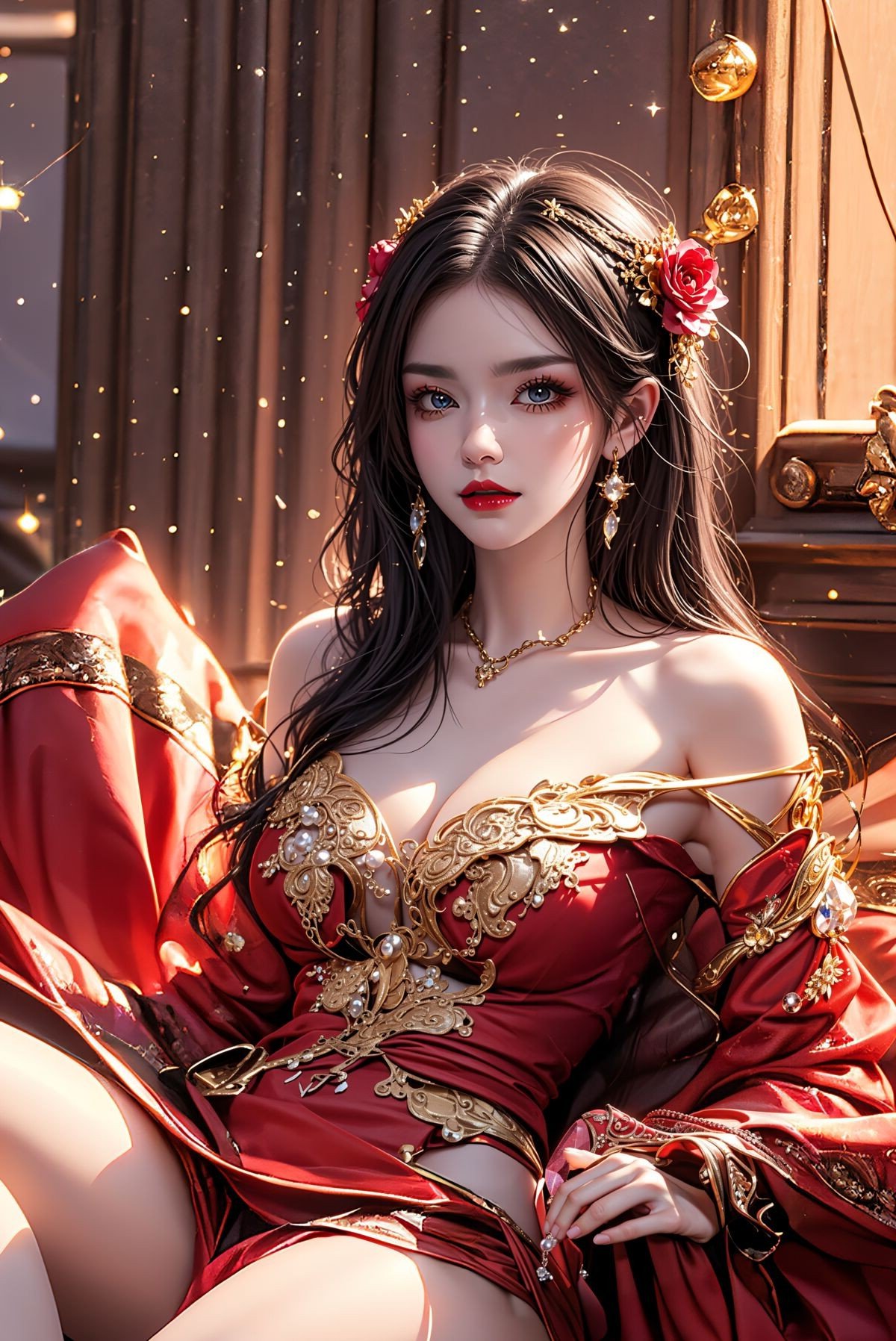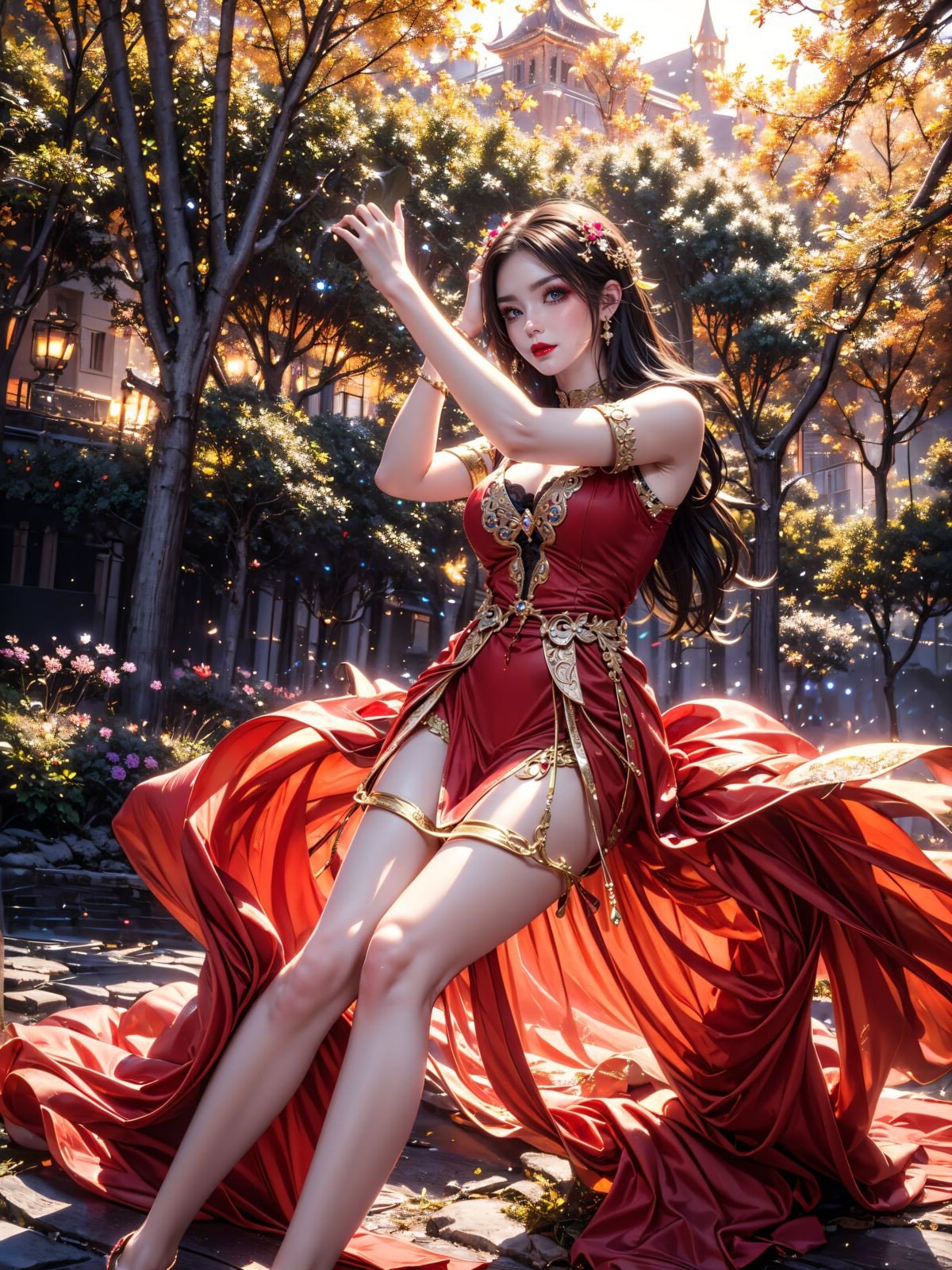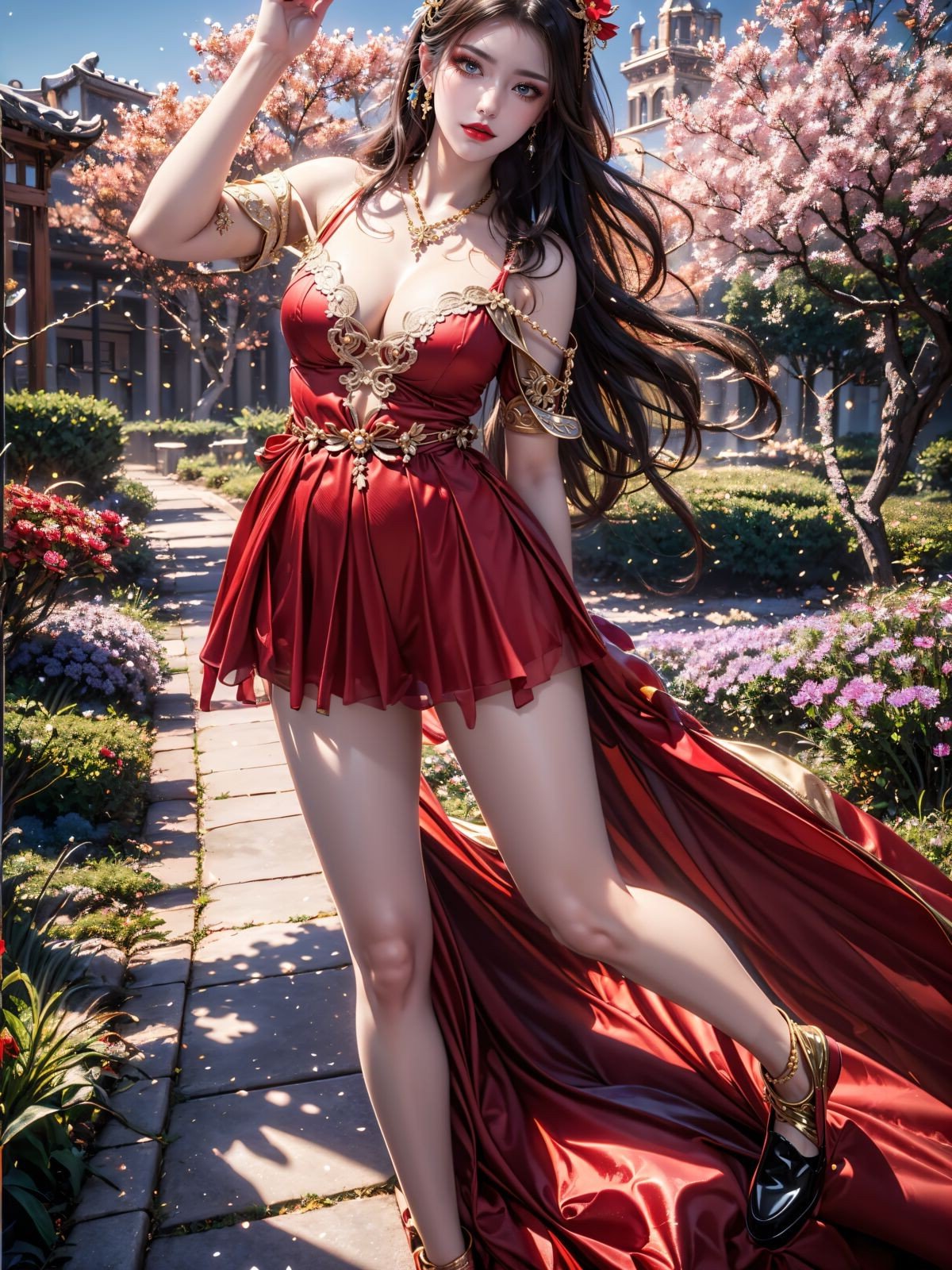 This stunning AI Generated image beautifully portrays Queen Medusa from the Battle Through the Heavens series in an enchanting setting. Medusa captivates with her irresistible allure, featuring long flowing dark hair, mesmerizing eyes, and luscious red lips. Her minimalist yet exquisite golden attire gracefully accentuates her slender and elegant physique. The backdrop unfolds as a mystical forest, awash in the vibrant pink hues of blooming cherry blossoms, creating a romantic and ethereal atmosphere. Soft light filters through the canopy, highlighting Medusa's majestic aura and regal beauty. This digital masterpiece perfectly blends advanced AI technology with rich imagination, presenting a Medusa who is both powerful and inherently feminine, captivating the hearts of fans and admirers alike.