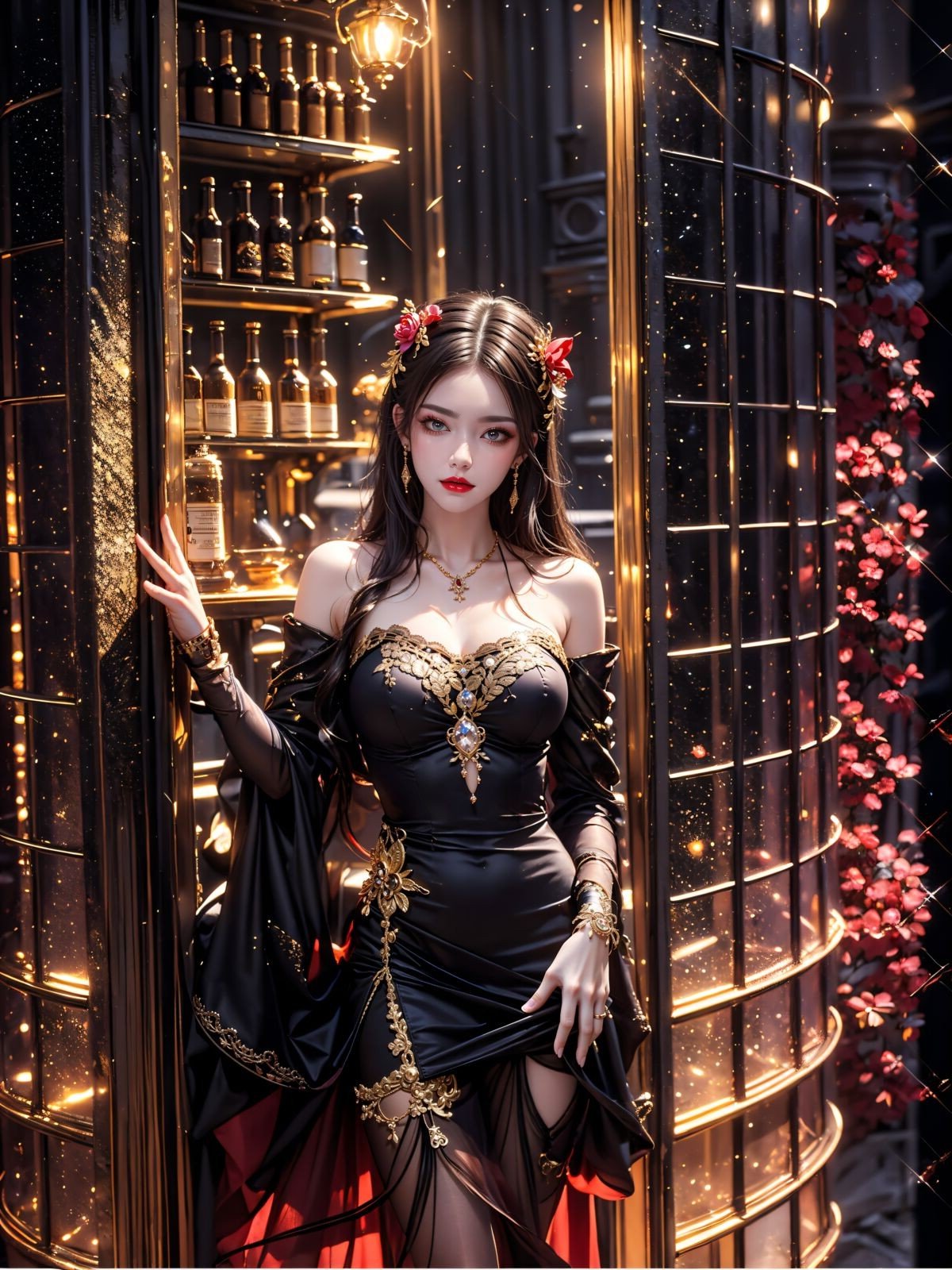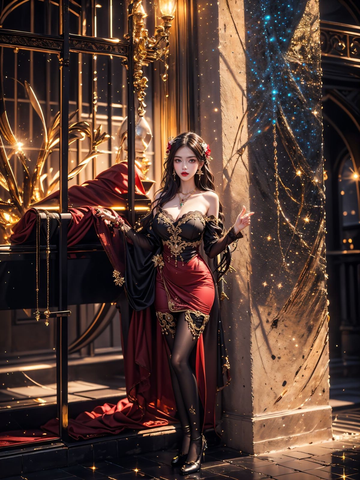 This stunning image showcases an AI generated female general with captivating beauty and an aura of power. She is adorned in a magnificent gold and black outfit, blending classic elegance with modern allure. The exquisite costume design features shimmering gold embroidery and a daring slit, highlighting her graceful figure. Her deep gaze and mysterious expression hint at an exciting adventure within a fantasy game world. The harmonious blend of her attire colors and the natural background creates a visually striking and captivating image. This is an excellent example of digital art and AI character design delivering an impressive visual experience.
