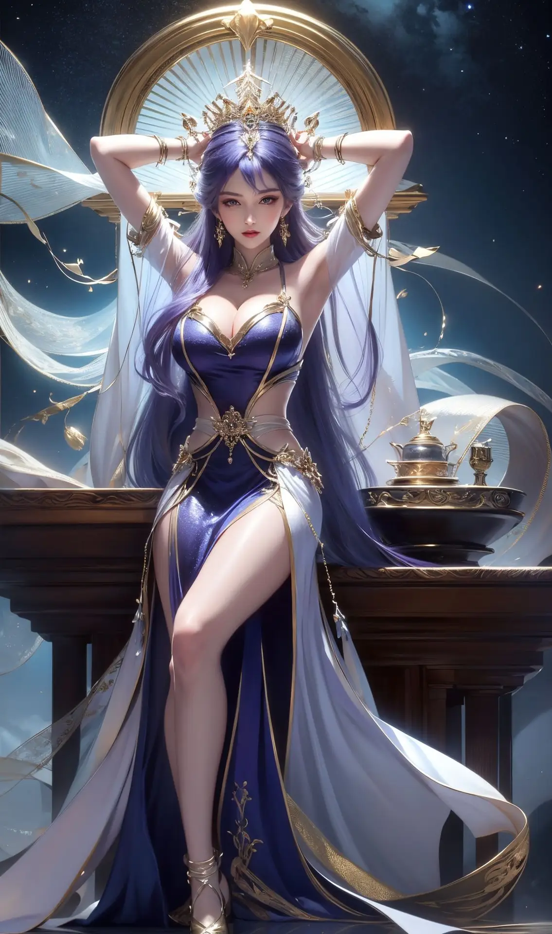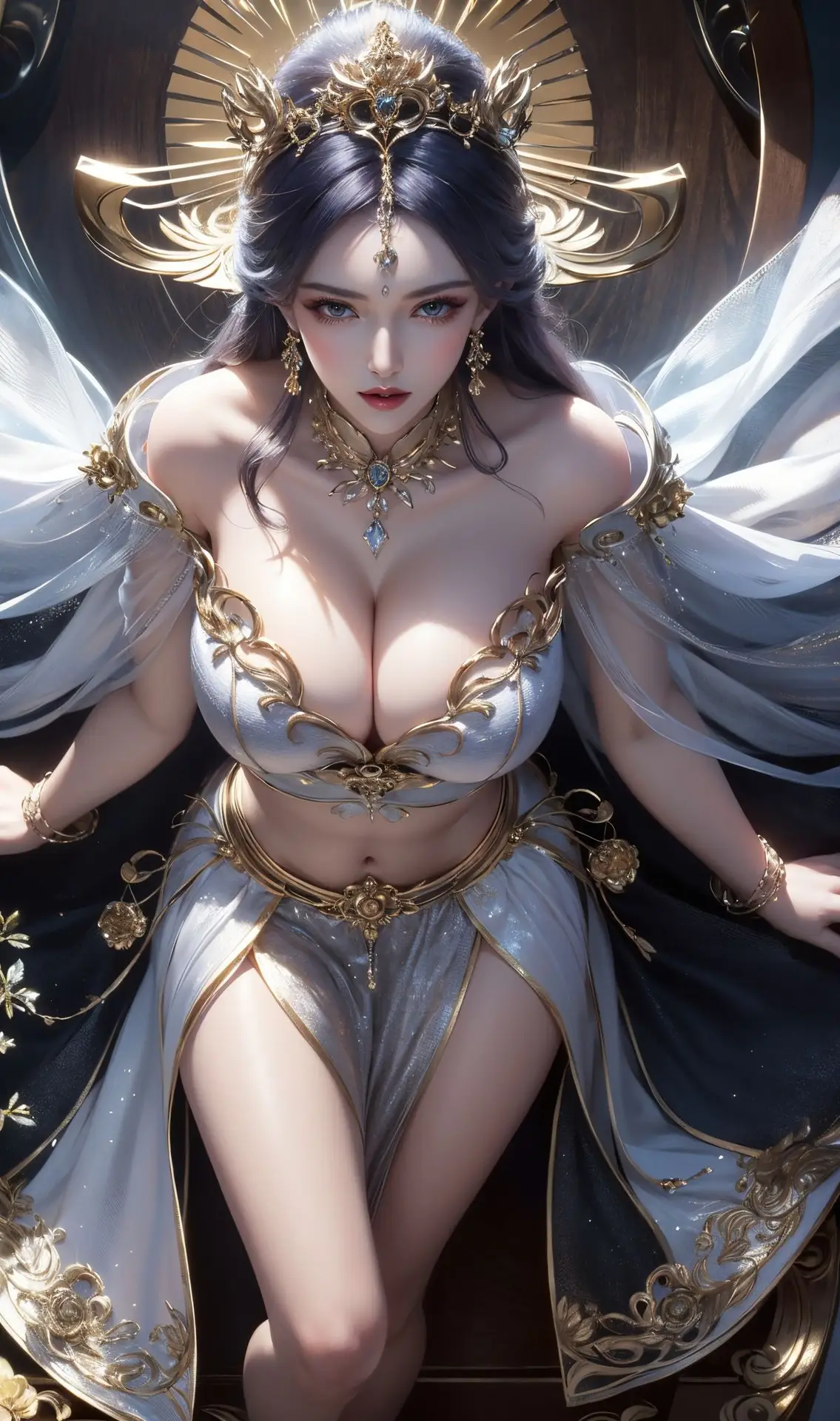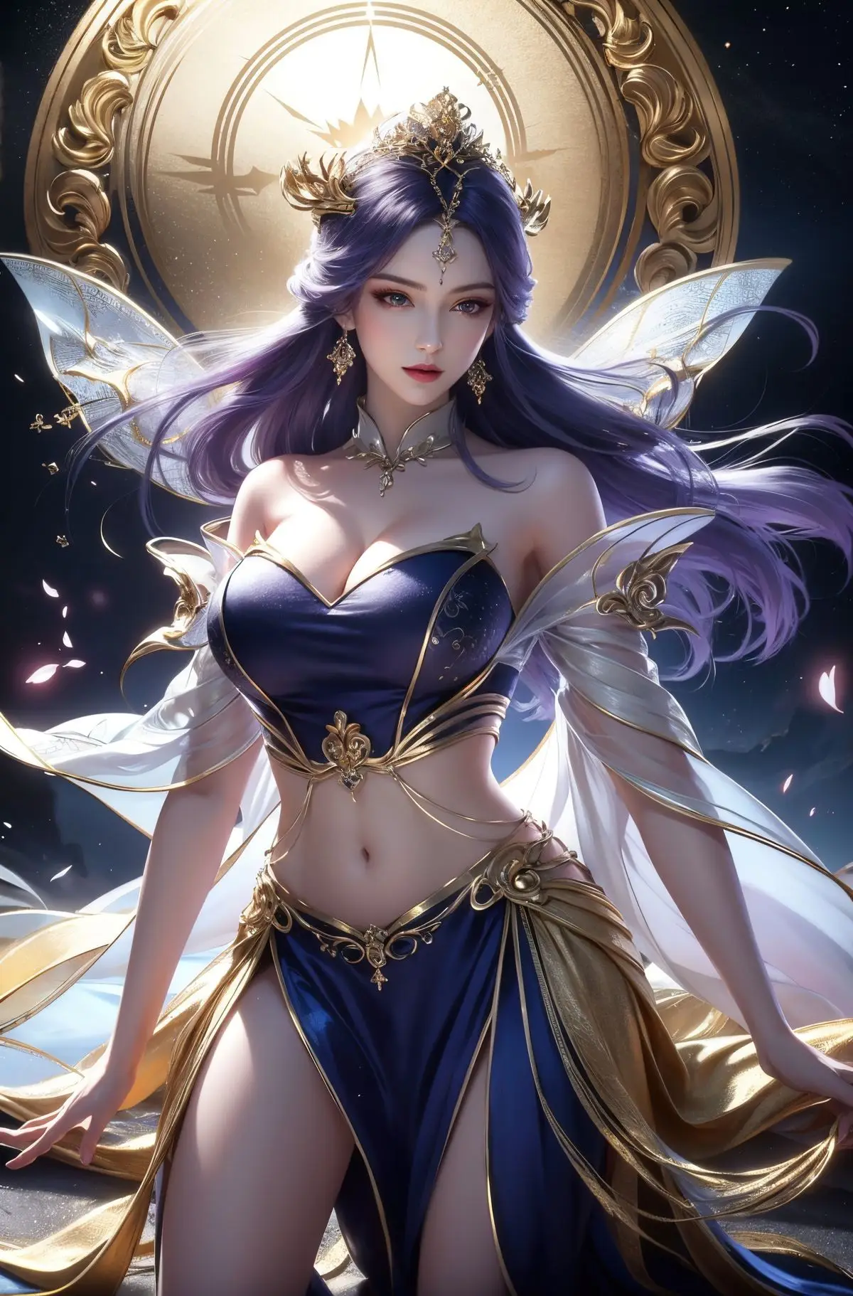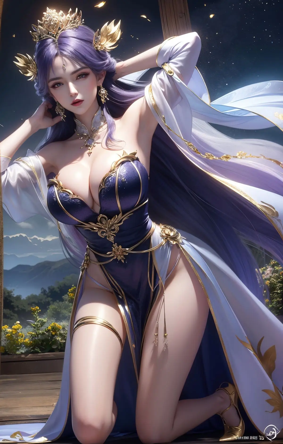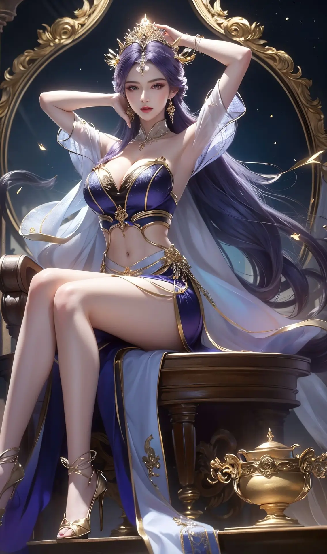 This AI Generated image unveils a breathtaking goddess kneeling majestically within the opulent confines of a heavenly palace. Her ethereal purple hair flows softly, while deep, captivating eyes and alluring lips craft an enchanting beauty. Adorned in a magnificent dark blue and gold ensemble, intricately detailed, she embodies regal grace and divine power. A brilliant golden light radiates from behind her head, forming a sacred halo that symbolizes the boundless strength and sanctity of a being forged into a god, a true 百炼成神. Every element, from her sparkling crown to her exquisite jewelry, exudes mystery, inviting viewers to immerse themselves in this impressive digital artwork of divine allure.#AIGoddess #BaiLianChengShen #HeavenlyPalace #DigitalArt #FantasyArt