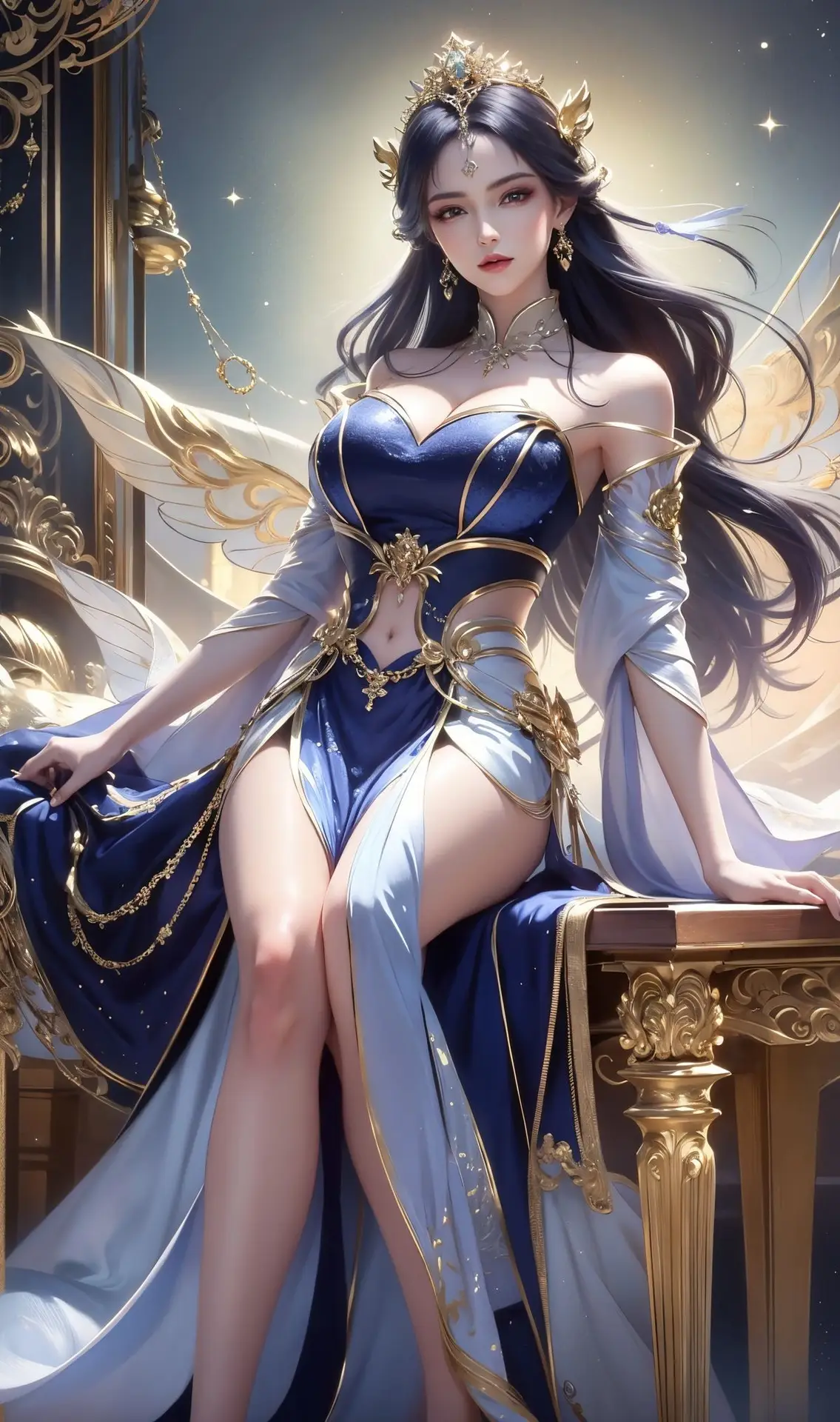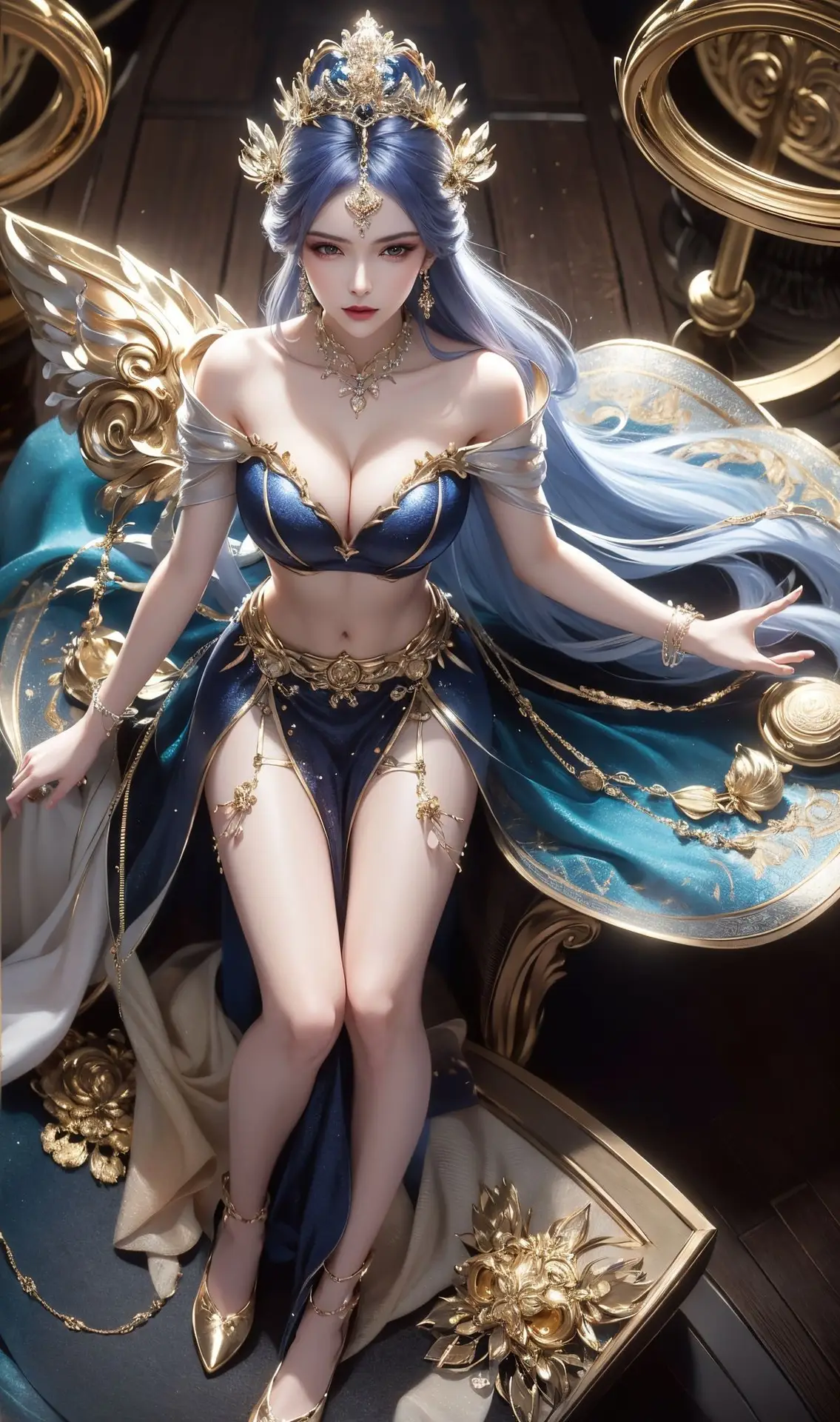 This stunning AI Generated image transports viewers into the ethereal world of Bai Lian Cheng Shen where the Heavenly Dome Goddess appears with captivating beauty. The main character features long flowing blue hair deep eyes and a regal aura exuding mystery and power. She wears a magnificent blue gown adorned with shimmering gold accents highlighting her graceful figure and alluring contours. The shimmering golden background suggests a divine realm where time and cosmos intertwine. This is not just an image but an emotionally rich digital artwork sparking imagination about an enchanting fantasy world where deities reign with superhuman beauty and boundless strength.#AIGeneratedArt #HeavenlyGoddess #BaiLianChengShen #FantasyArt #MysticalBeauty