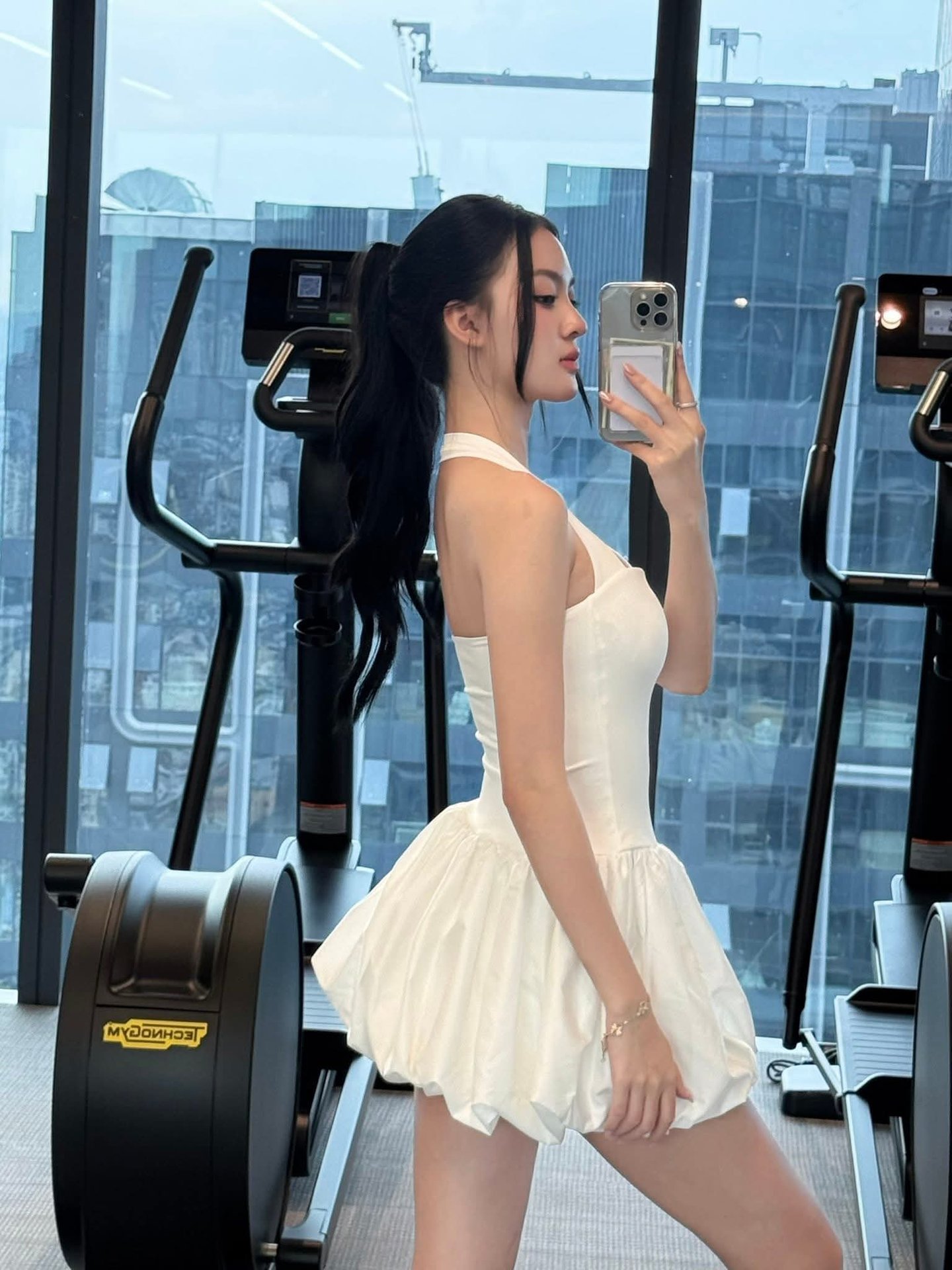 Gym Fashionista: Elegant woman in white bubble dress at a modern fitness center