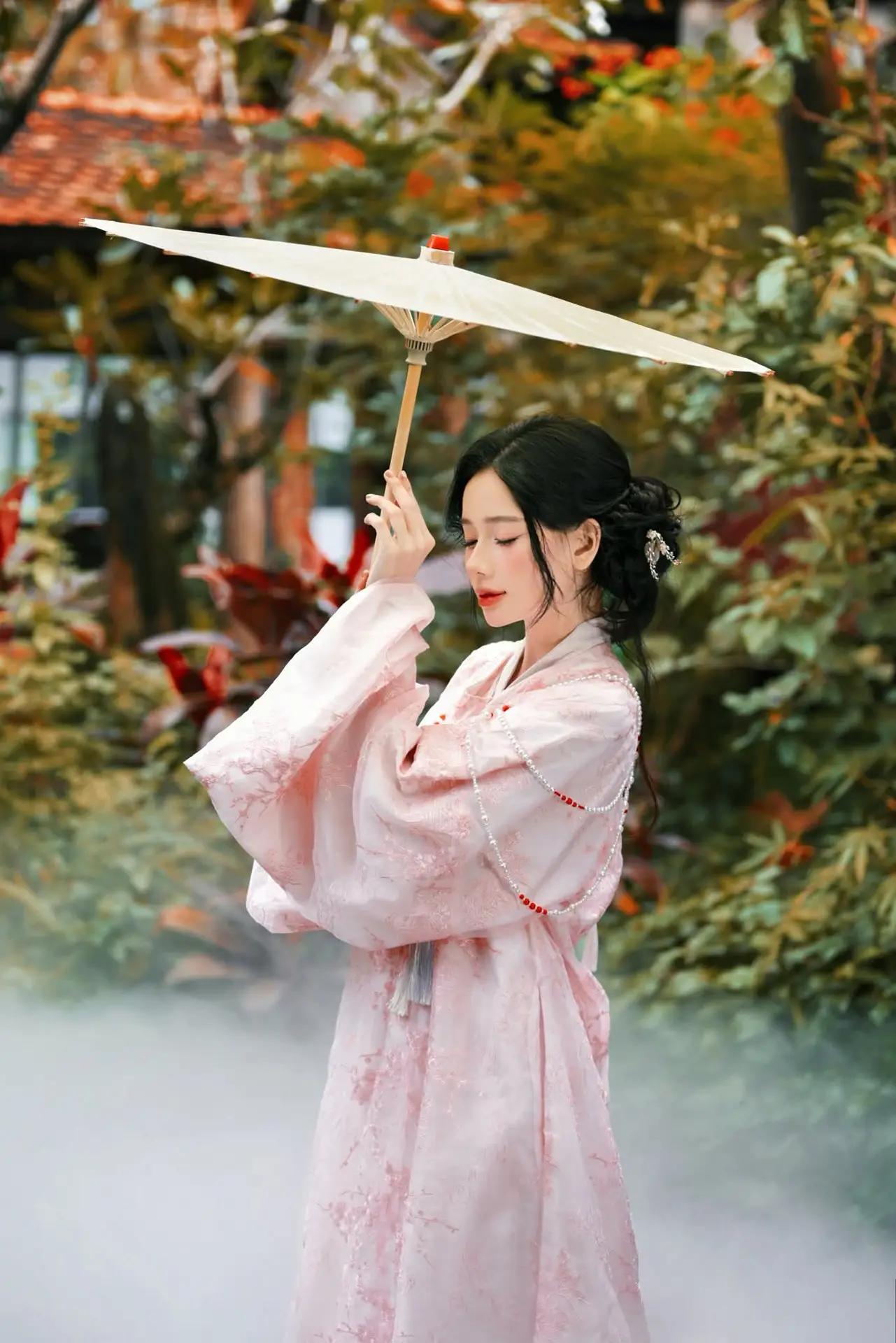 This exquisite photograph captures a young woman embodying the serene grace of Asian beauty, adorned in a delicate light pink Hanfu, intricately embroidered. She stands elegantly in a lush garden, where the foliage hints at autumn's embrace with touches of red and orange, creating a truly romantic and picturesque backdrop. A traditional yellow paper umbrella, held with a gentle poise, serves as a charming accent, further enhancing her classic and refined appearance. Her soft gaze and subtle smile, combined with the ethereal mist at her feet, transport viewers into a scene straight out of an ancient fairy tale. More than just a portrait, this image celebrates cultural heritage and traditional aesthetics, evoking a sense of peaceful nostalgia and timeless charm.