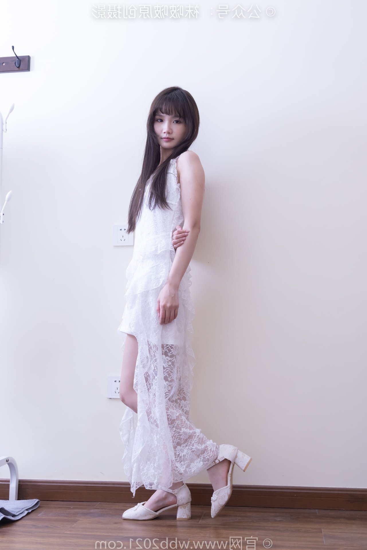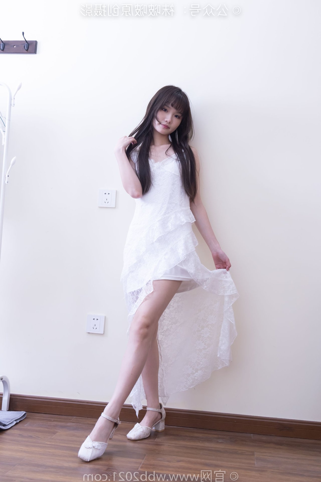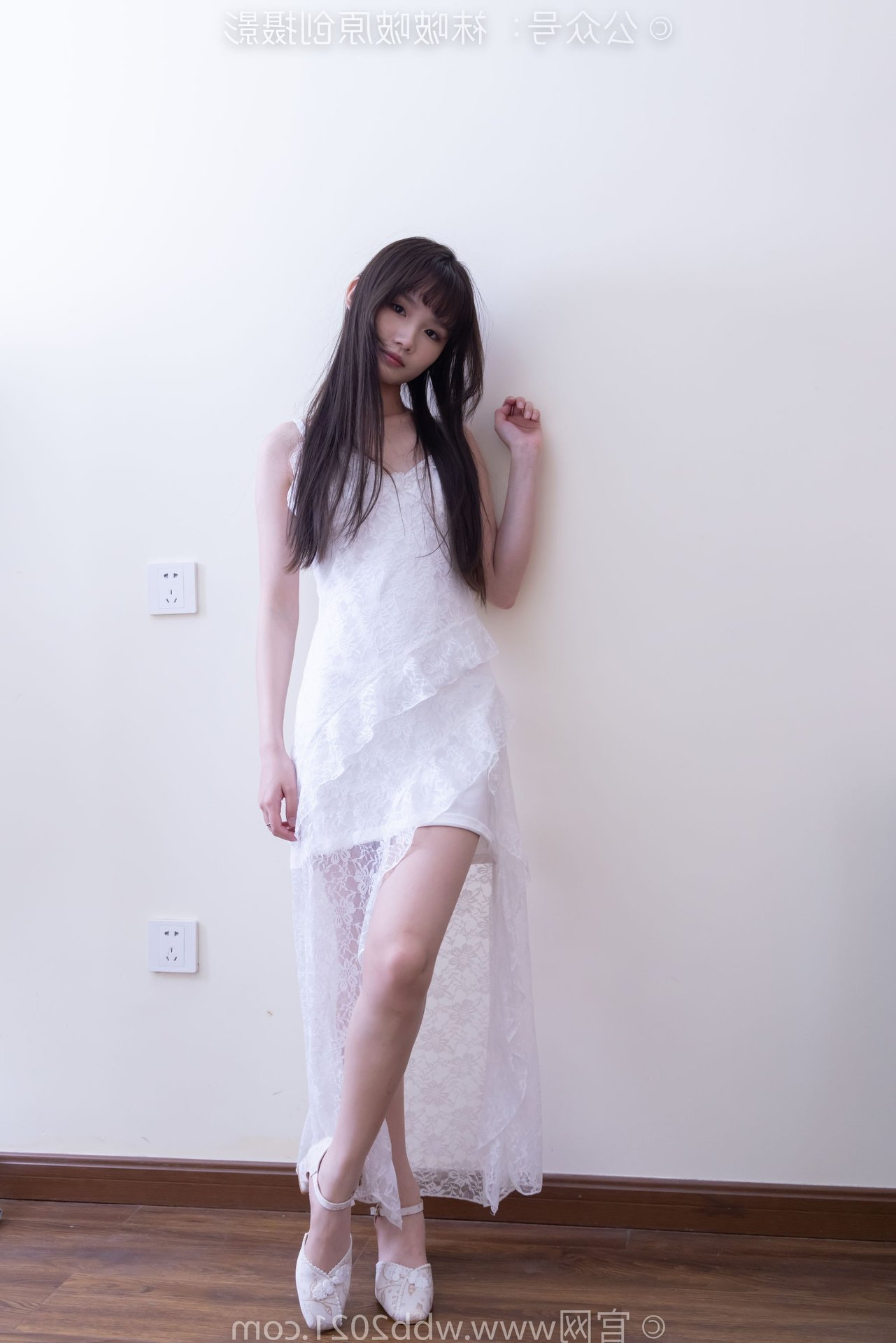 This photograph captures an emotional moment of the Chinese model from the BoBoSocks No.542 collection. She is adorned in a pristine white dress its soft fabric exuding a gentle and ethereal beauty. Her kneeling posture with hands delicately pressed against the white wall combined with a contemplative gaze creates a serene and profound atmosphere. The graceful bare feet further emphasize her natural charm showcasing a simple and approachable beauty. This image not only conveys purity but also subtly hints at a delicate allure evoking a sense of fragility and introspection. It is a photographic artwork that focuses on the models expression and natural grace offering an authentic glimpse into her inner beauty.