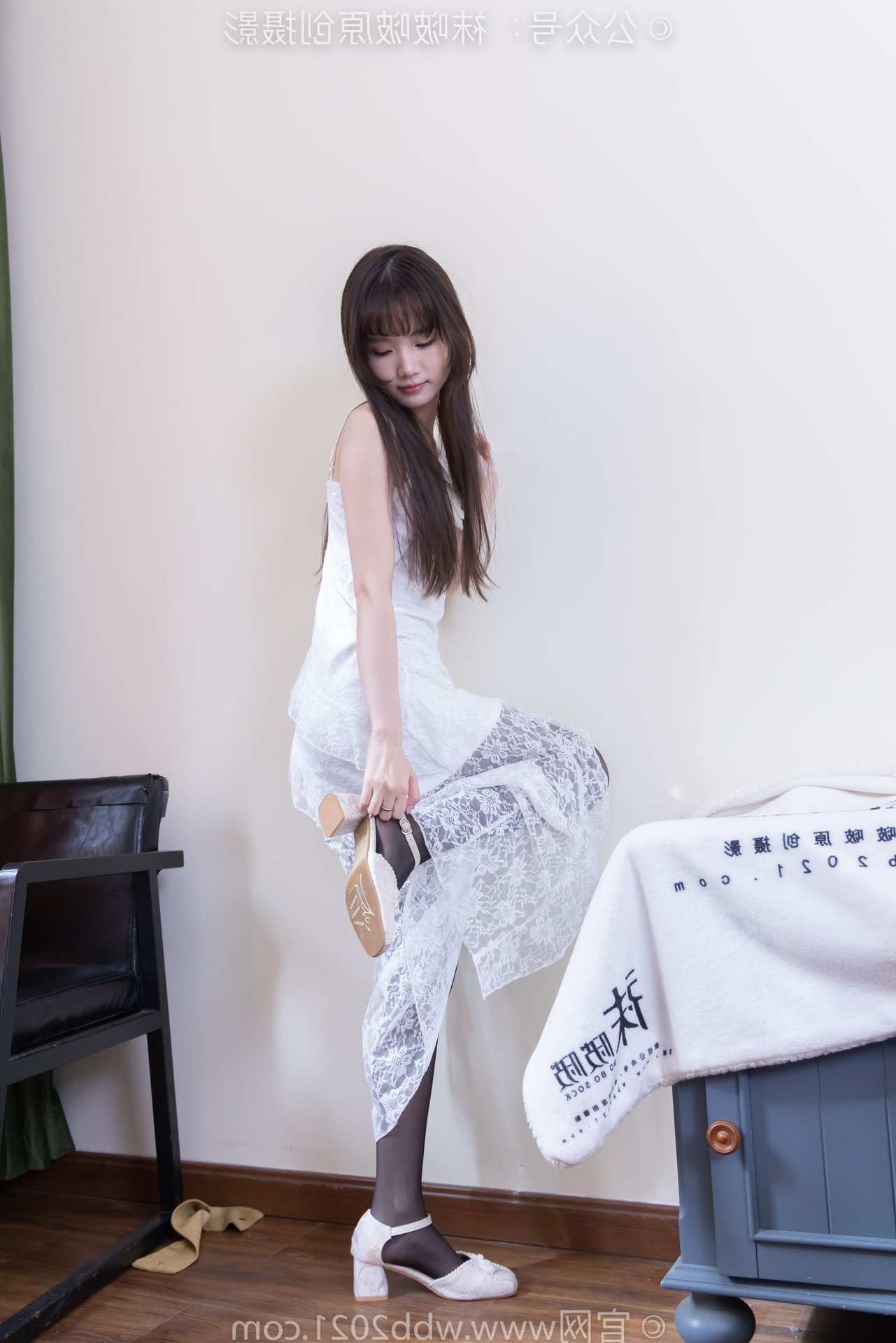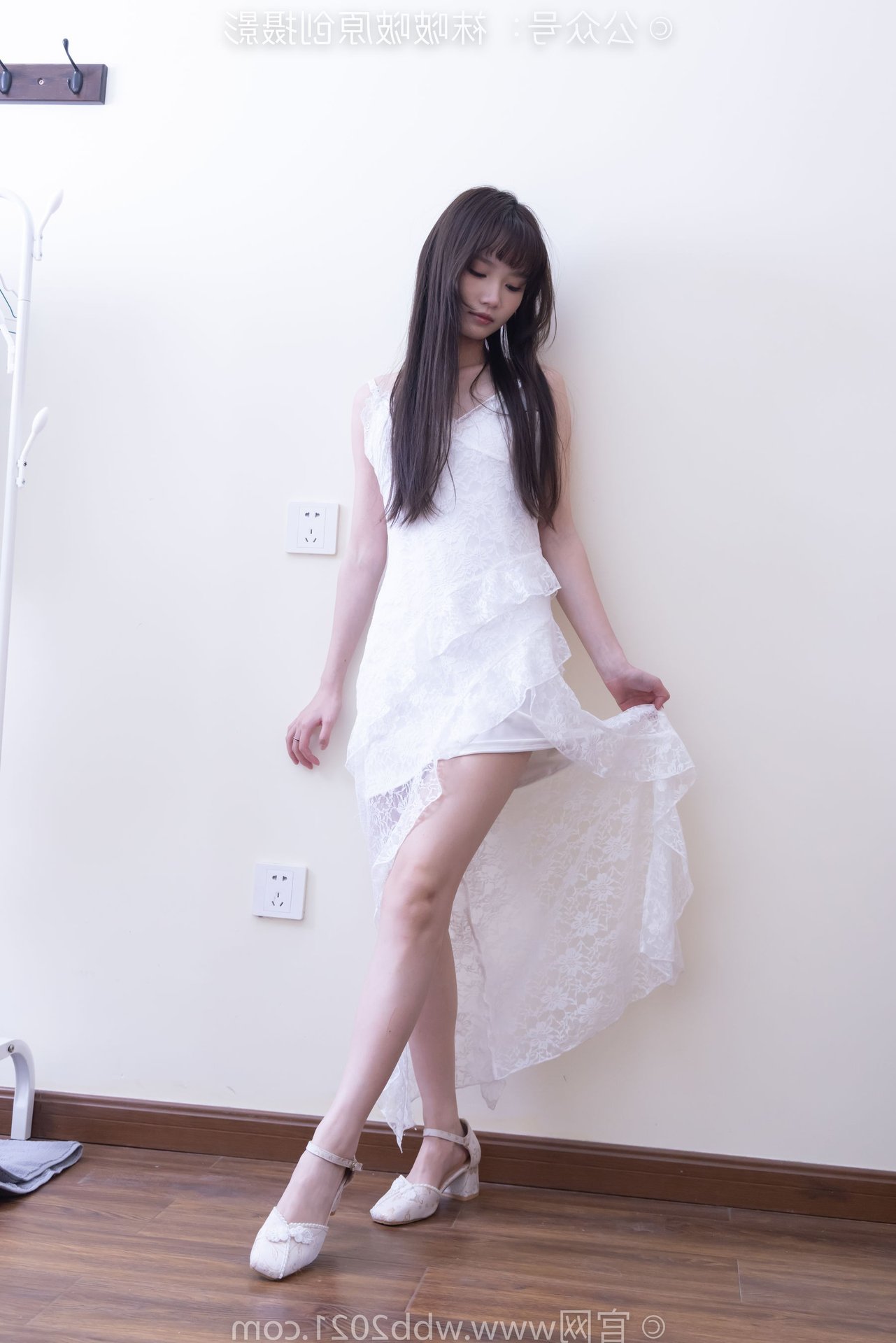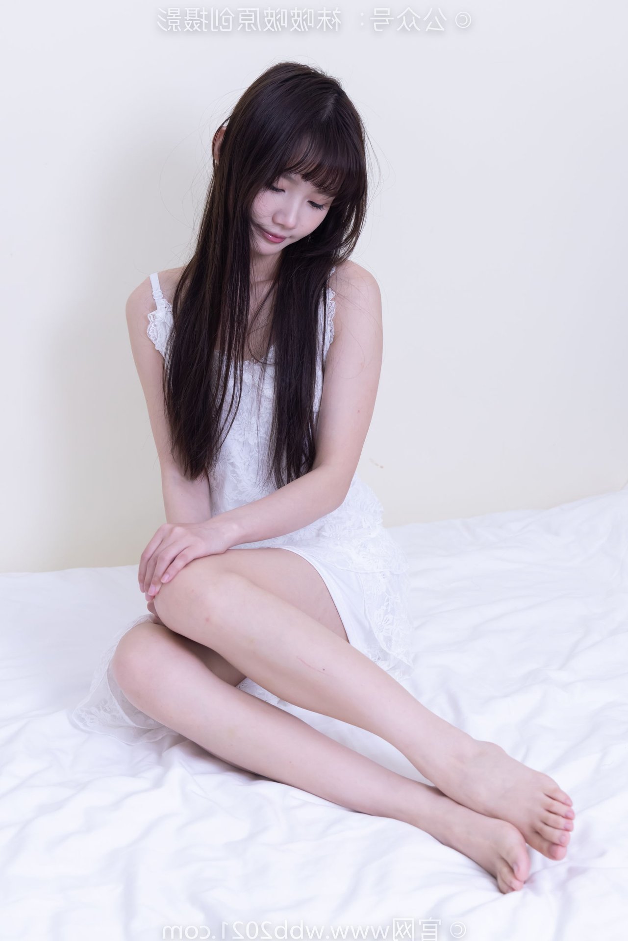 This photograph captures an emotional moment of the Chinese model from the BoBoSocks No.542 collection. She is adorned in a pristine white dress its soft fabric exuding a gentle and ethereal beauty. Her kneeling posture with hands delicately pressed against the white wall combined with a contemplative gaze creates a serene and profound atmosphere. The graceful bare feet further emphasize her natural charm showcasing a simple and approachable beauty. This image not only conveys purity but also subtly hints at a delicate allure evoking a sense of fragility and introspection. It is a photographic artwork that focuses on the models expression and natural grace offering an authentic glimpse into her inner beauty.