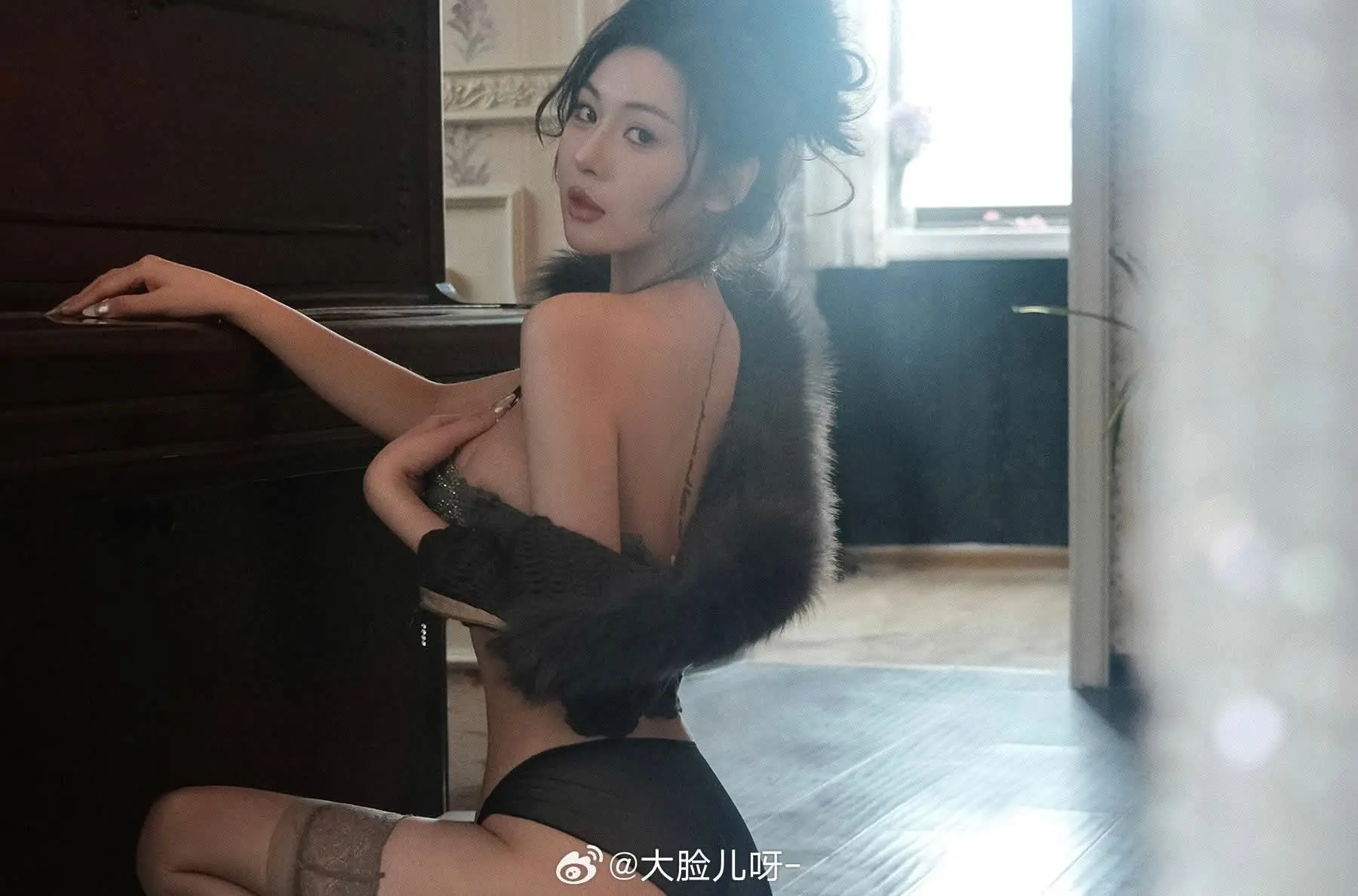 This stunning image portrays a woman of captivating beauty and confident aura. She is seated gracefully on wooden stairs, striking a sensual pose in delicate black lingerie, showcasing her soft body curves. Natural light streaming from the window highlights her skin and lustrous dark hair, creating an intimate and enchanting atmosphere. Every detail, from her deep gaze to the way she subtly holds a furry garment, exudes mystery and allure. More than just a portrait, this is an artistic capture celebrating feminine form and modern confidence.#SeductiveBeauty #LingerieLook #ConfidentAura #ArtisticPortrait #FeminineCharm