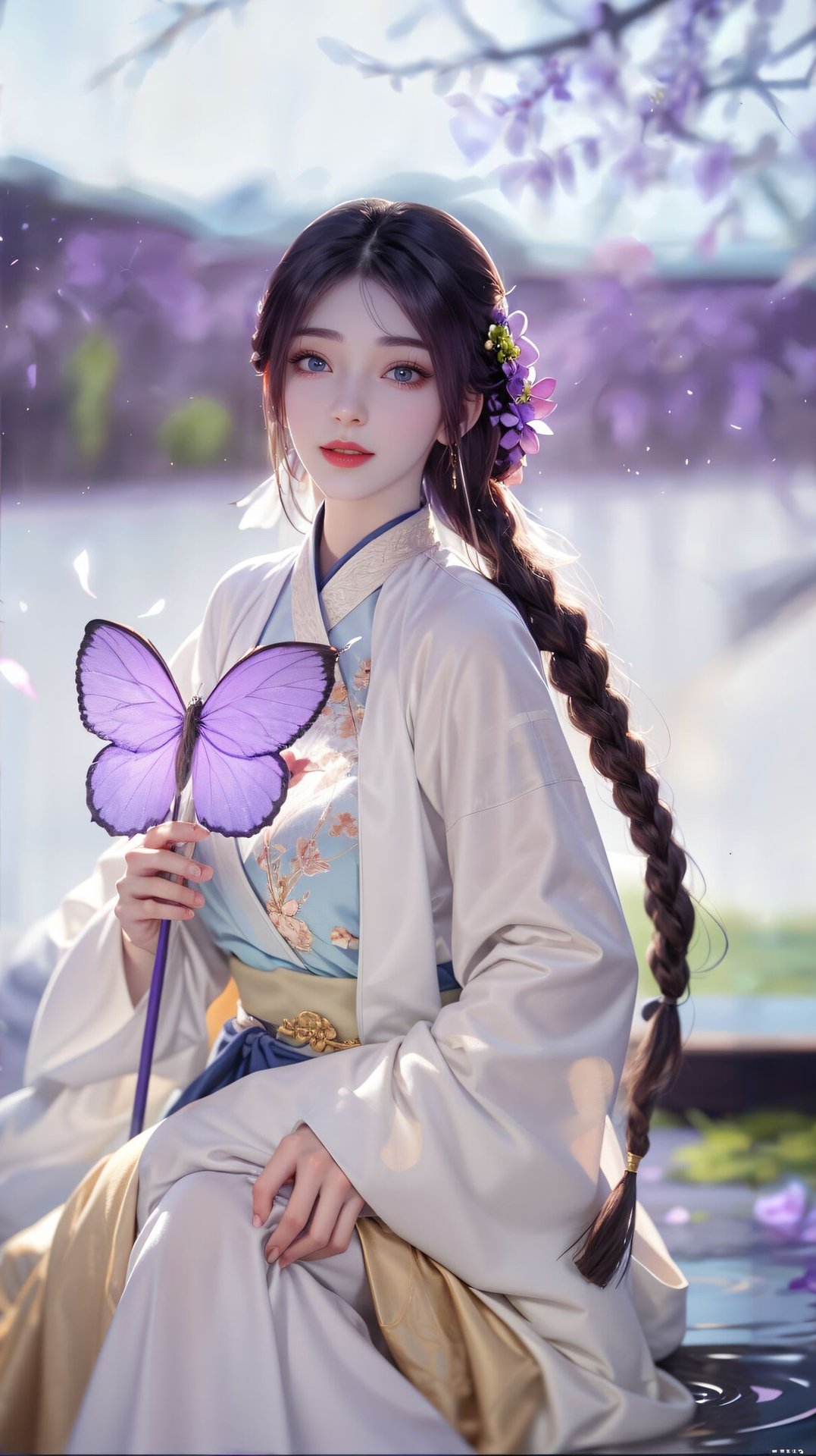 This stunning AI generated image captivatingly portrays Tang Zichen from the renowned Long She Yan Yi novel. Her ethereal ancient beauty is exquisitely captured with flowing dark hair intricate traditional attire and a dreamy gaze directed towards the horizon. Set within a serene classical Chinese garden adorned with delicate purple blossoms Tang Zichen emerges as a timeless muse radiating tranquility and profound elegance. This is more than just a digital artwork it represents a seamless fusion of cutting-edge technology and rich traditional culture vividly recreating a legendary beauty. This AI artwork is sure to enchant admirers of East Asian aesthetics and martial arts fiction offering a glimpse into a world of grace and mystique.