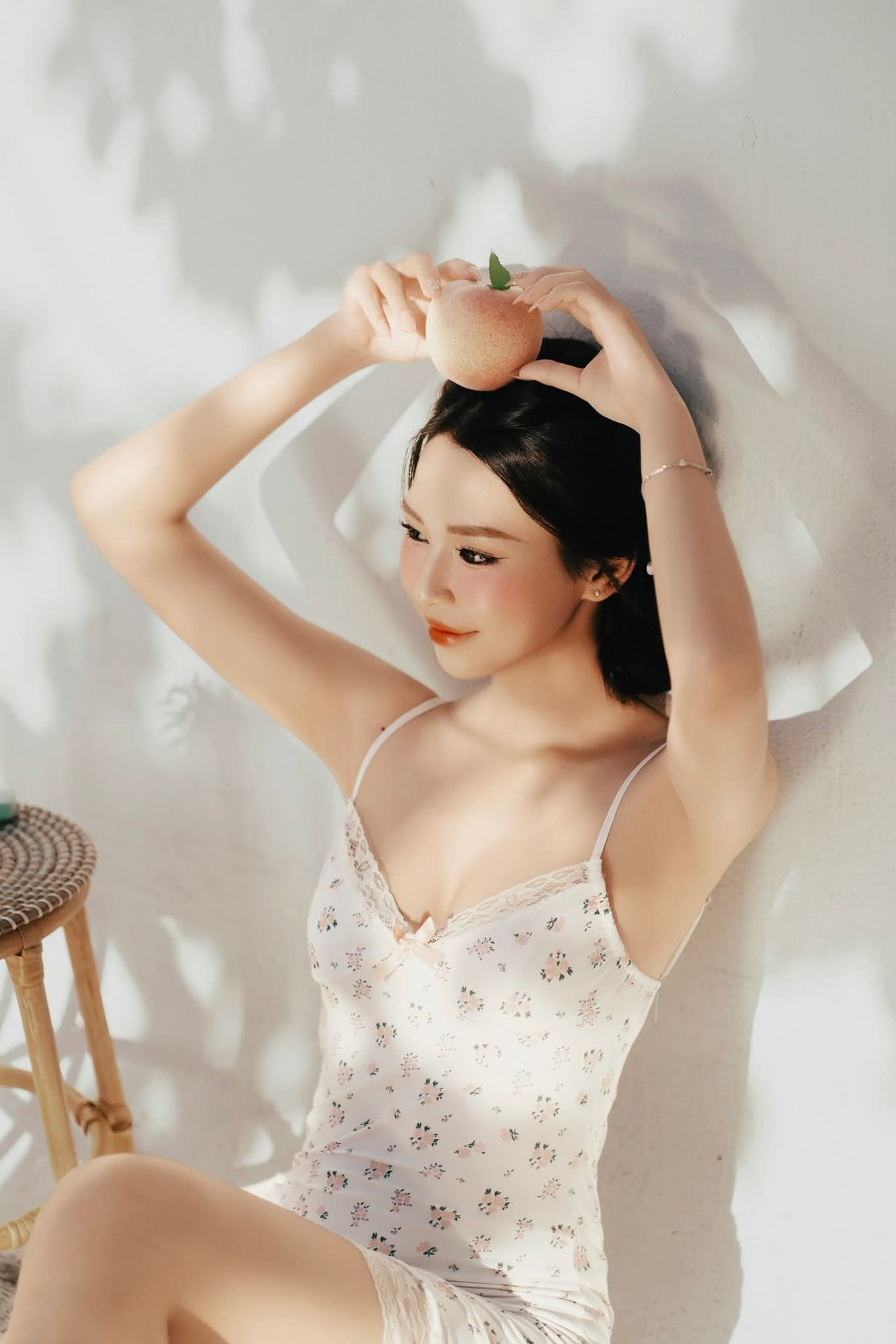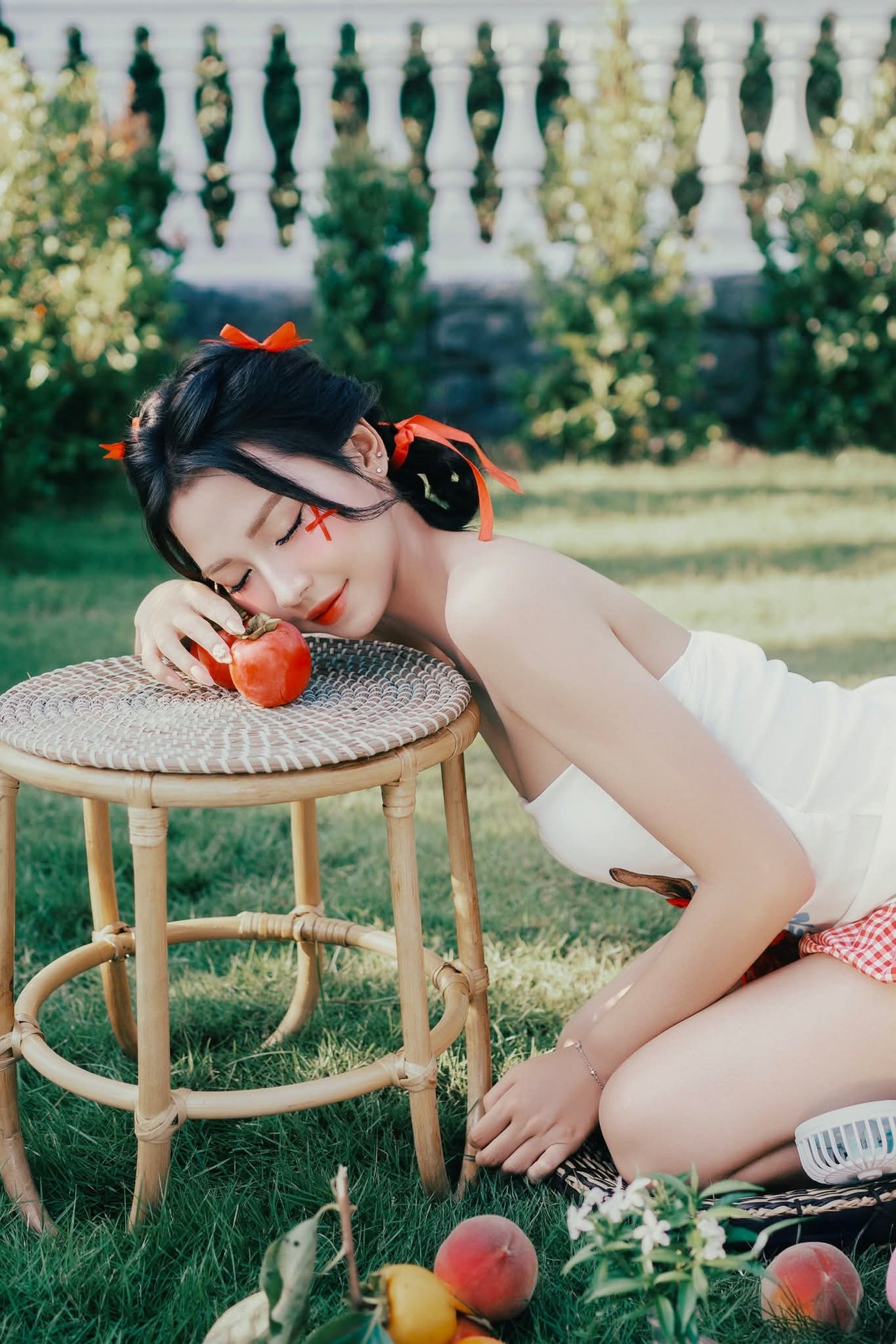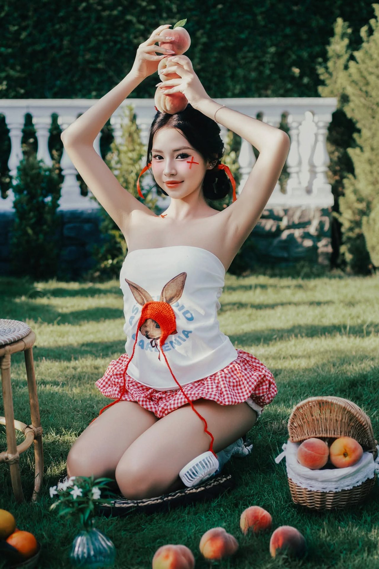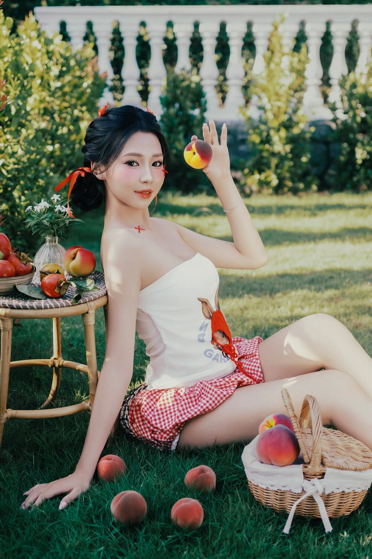 This captivating image features a beautiful young woman enjoying a serene moment amidst the lush greenery of a garden. She sits gracefully on the verdant lawn, surrounded by plump, vibrant peaches, symbolizing the fresh essence of summer. With a gentle smile and captivating gaze, she holds a ripe peach in her hand, exuding natural beauty and tranquility. The sun-drenched scene, complete with a fruit basket and scattered peaches, creates a vivid picture of nature's abundance and simple joys. This image not only evokes a sense of a sweet summer but also conveys a message of a healthy lifestyle, close to nature, and appreciating life's simplest pleasures. It is a peaceful moment, full of positive energy.Đông Hoàng