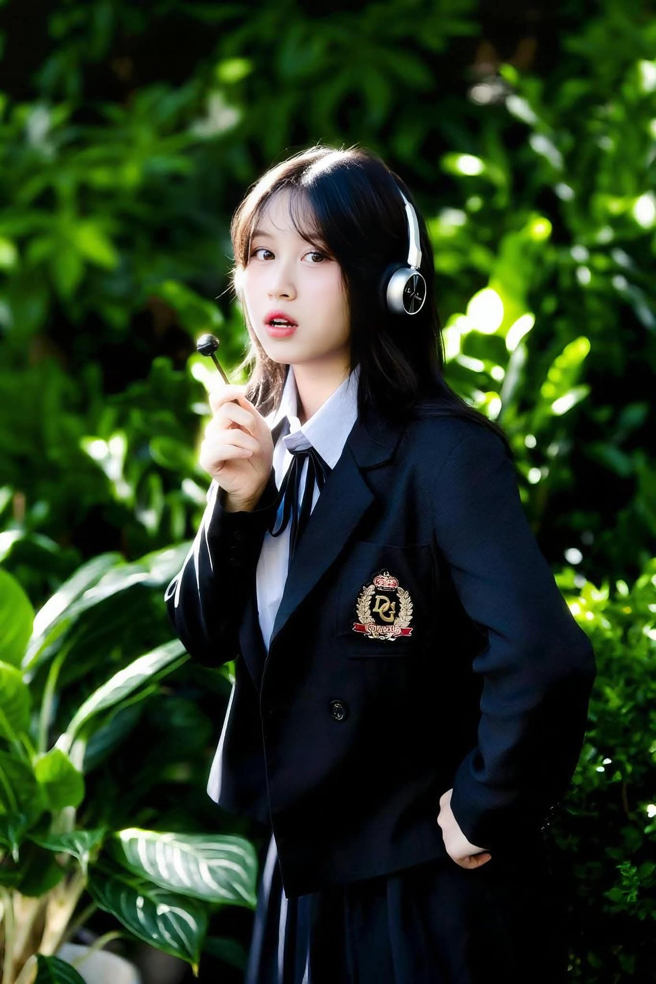This beautiful photograph captures a serene moment of a young Asian girl, her radiant smile exuding natural elegance and charm. She stands gracefully amidst a lush green garden, where golden sunlight gently filters through the leaves, creating a vibrant and lively atmosphere. Her dark hair and sparkling eyes enhance her endearing facial expression. Dressed in a dark outfit, she maintains a chic yet simple look, harmonizing perfectly with the fresh green hues of the surrounding foliage. This image not only conveys a sense of youthful freshness and joy but also evokes feelings of peace and tranquility, inviting viewers to appreciate the simple yet captivating beauty of both nature and humanity.