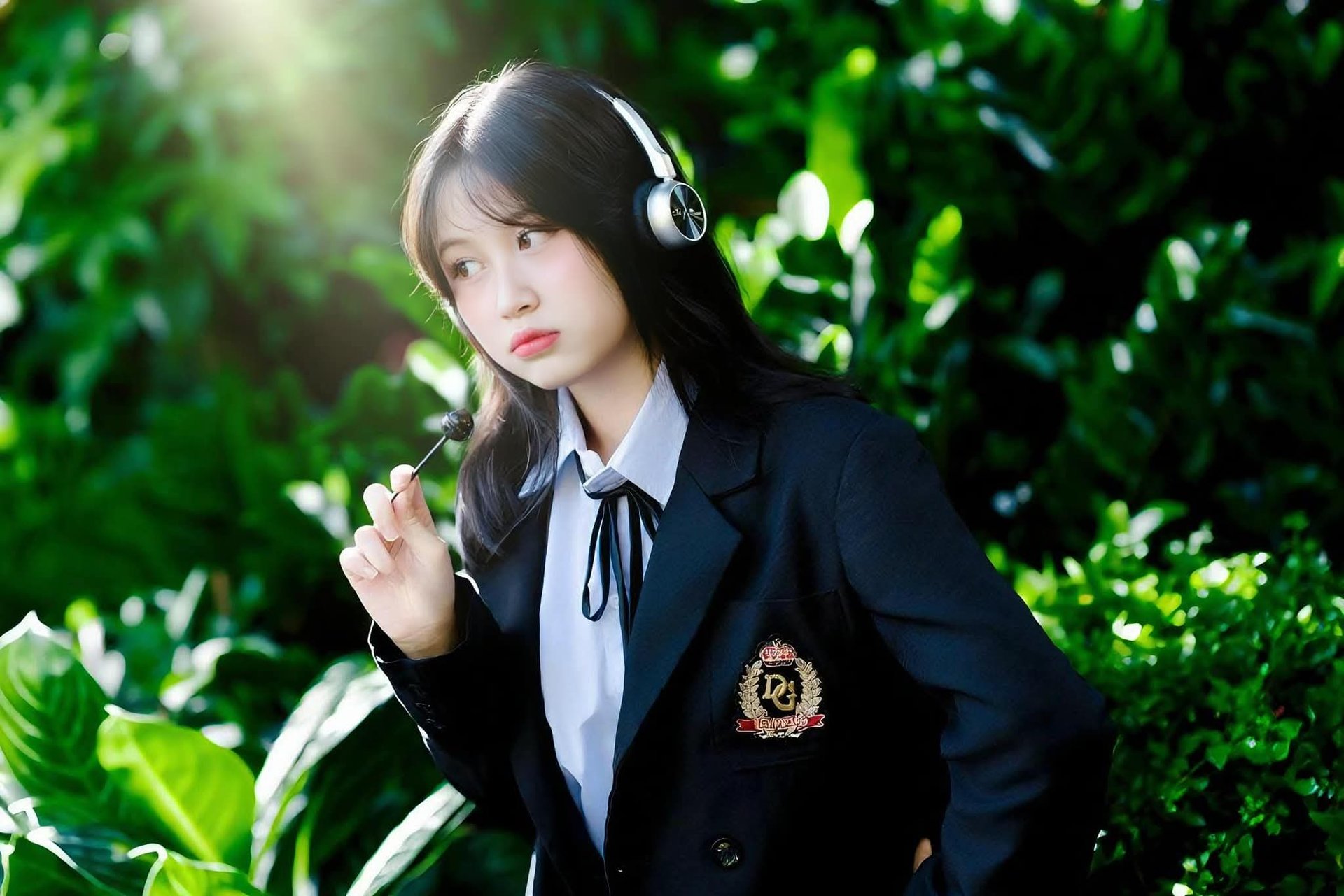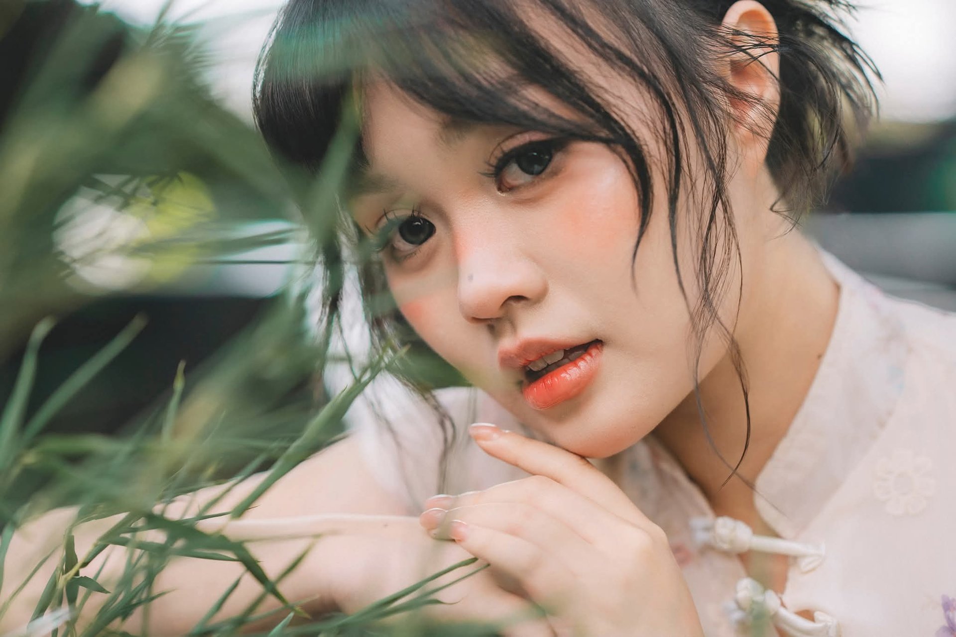 This image beautifully captures the serene and gentle natural beauty of a young woman in a vibrant green garden setting. The muse dressed in a flowing cream-colored dress with her long hair gently cascading is immersed in natural light. Her closed eyes convey a sense of absolute relaxation as if listening to natures symphony or simply savoring a rare moment of peace. A small bouquet of delicate white flowers held in her hands adds to her pure and feminine charm. More than just a portrait this photograph tells a story of harmonious connection between humanity and nature emanating tranquility and dreaminess. The girl in the garden symbolizes pristine beauty and inner calm a timeless escape into serenity.Đông Hoàng