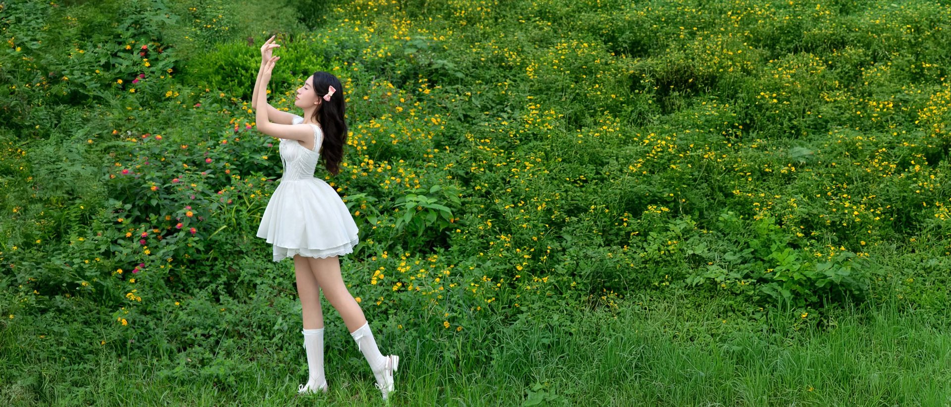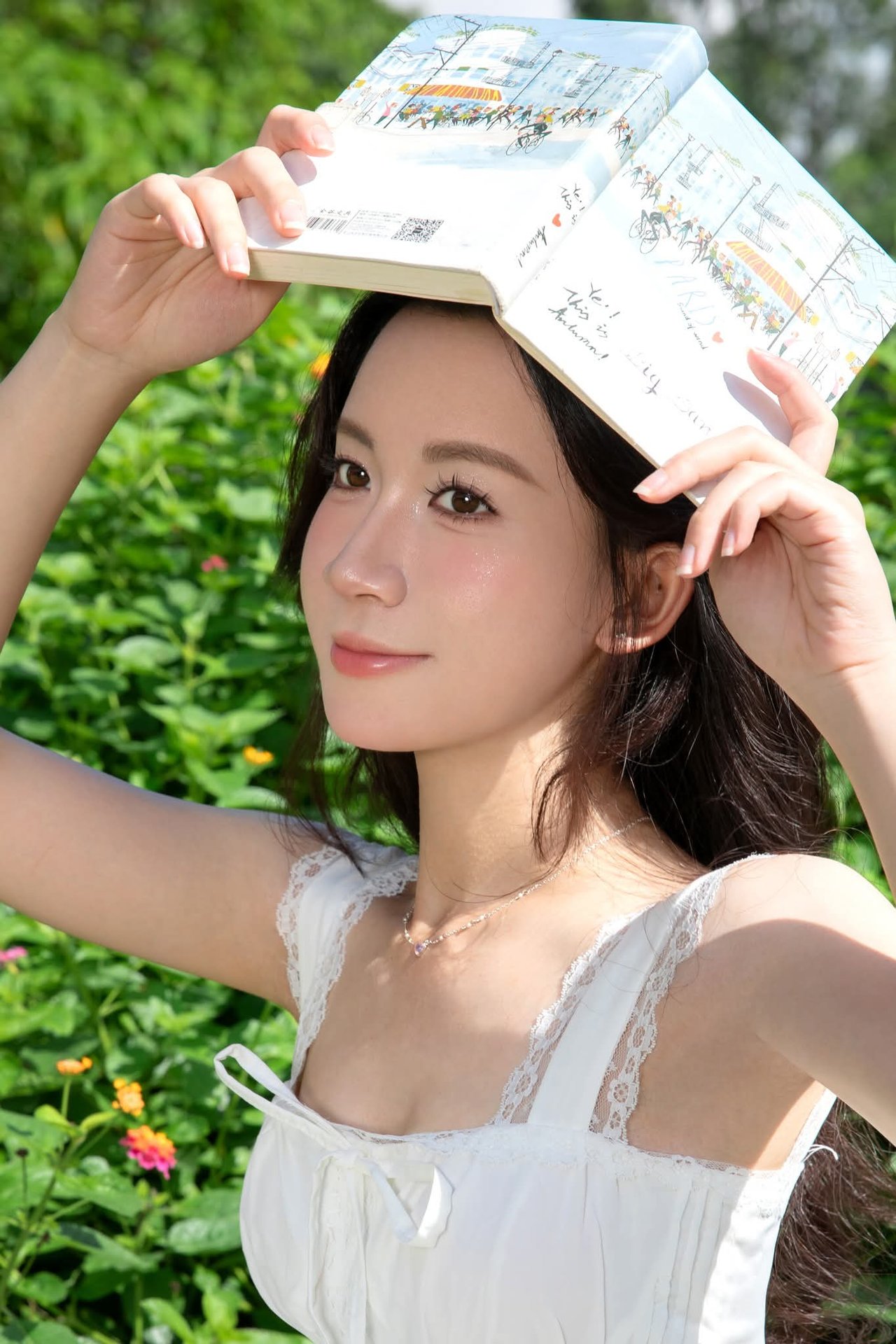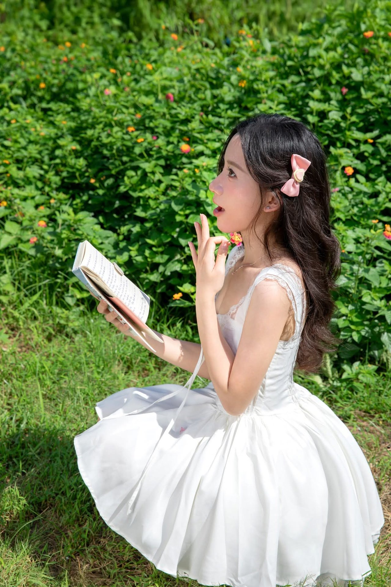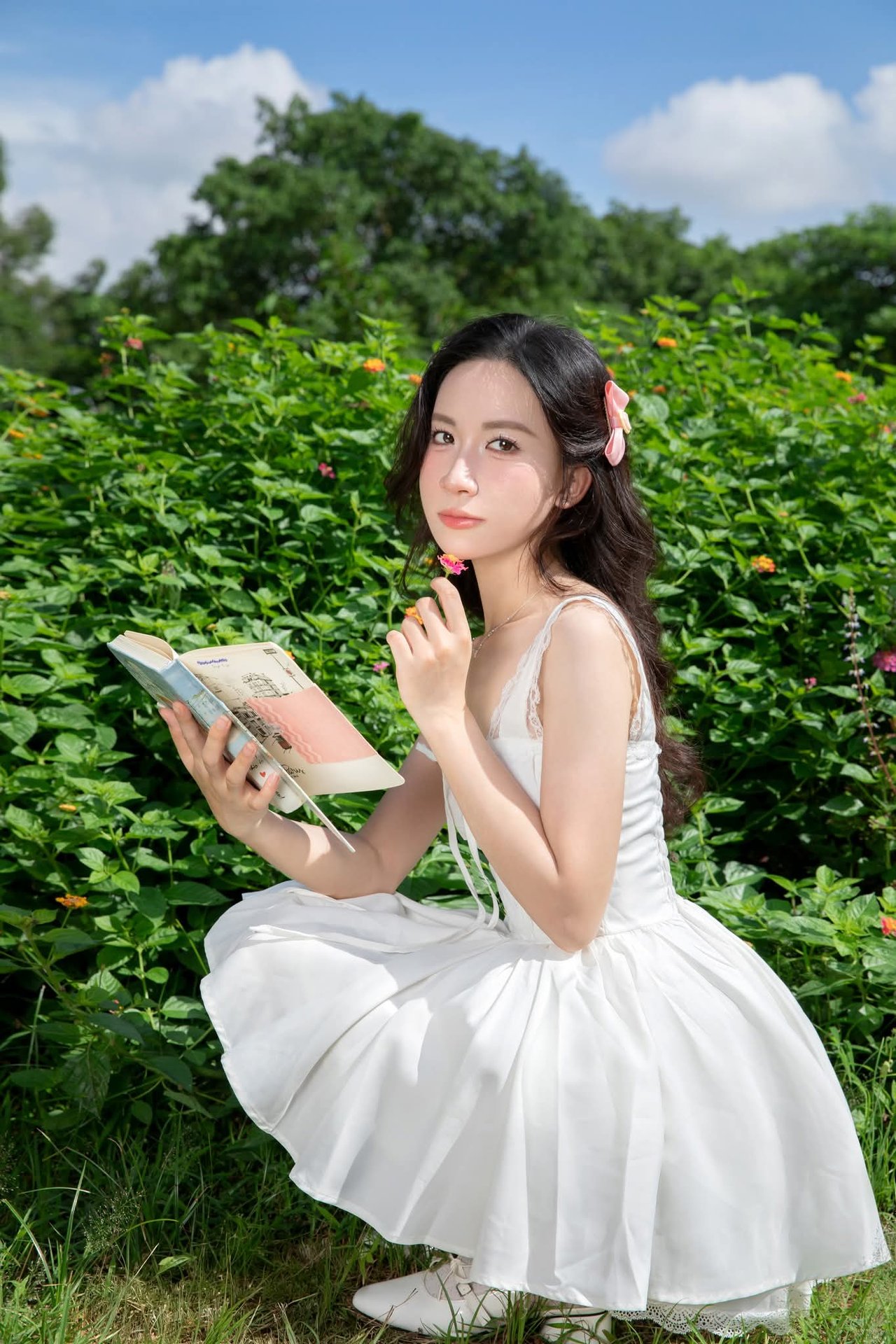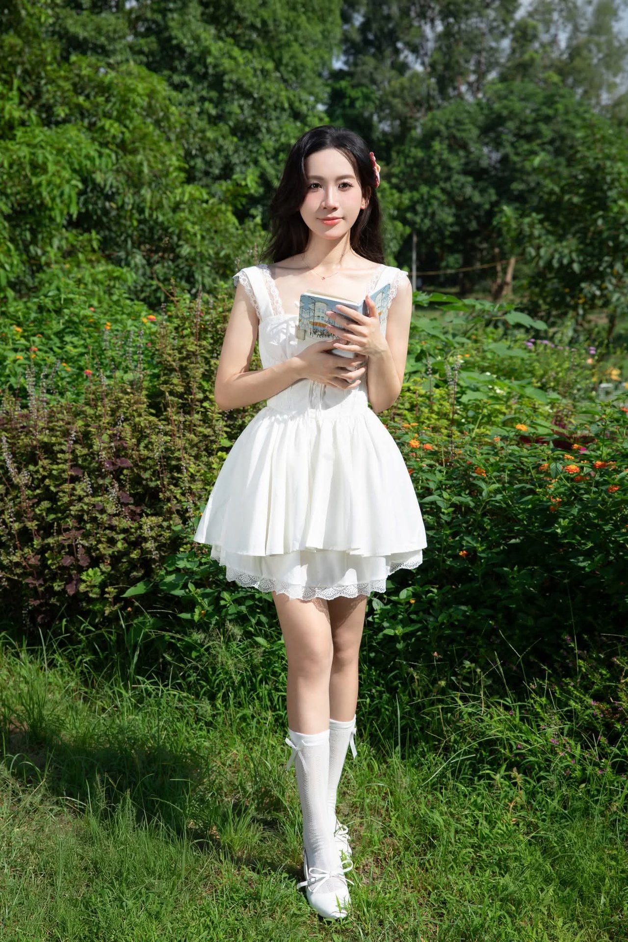This image captures a gentle moment of a young woman in a pristine white dress, standing amidst the lush green embrace of nature. Her graceful beauty blends seamlessly with the vibrant hues of the trees and grass, creating a truly poetic scene. The flowing white dress and knee-high socks accentuate her innocence and charm. Holding a book in her hands, she appears to be enjoying peaceful, tranquil moments within the garden. The picture evokes a sense of lightness, purity, and refined summer fashion, perfect for those who appreciate natural beauty and elegant style.Đông Hoàng
