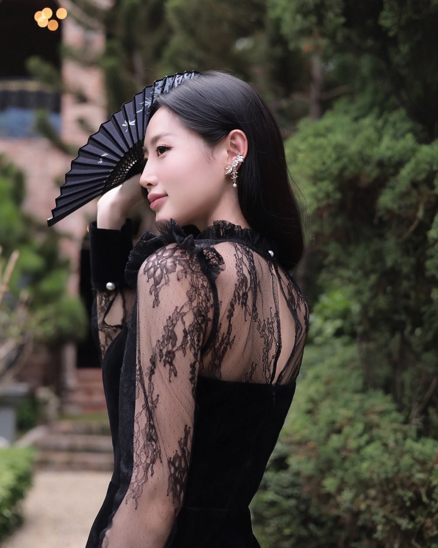 This image captures the elegant and captivating beauty of a young woman gracefully posing in a sophisticated black dress. With her long flowing hair and confident demeanor, she stands poised on ancient stone steps within a serene garden setting. The black dress, featuring delicate lace sleeves, accentuates her slender figure, creating an aura of both luxury and allure. Surrounded by lush greenery and classic stone architecture, her timeless charm is further enhanced. This moment beautifully blends fashion with nature, showcasing the unique style of a modern woman, embodying grace and poise within the tranquil Vietnamese landscape.