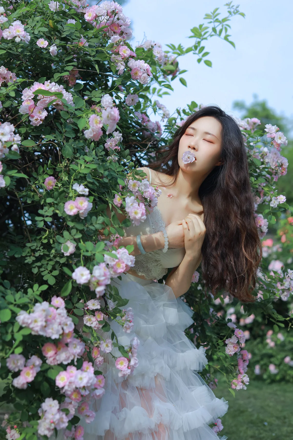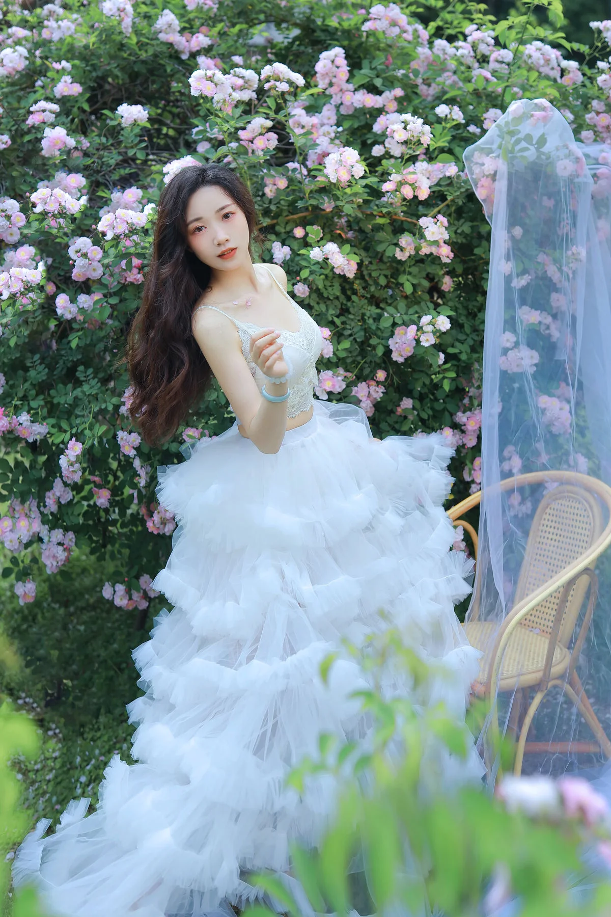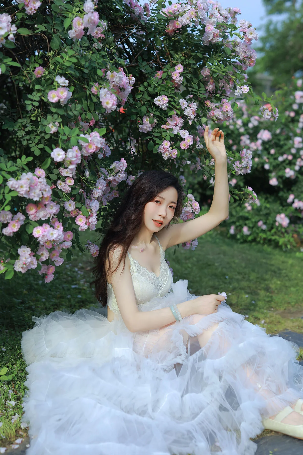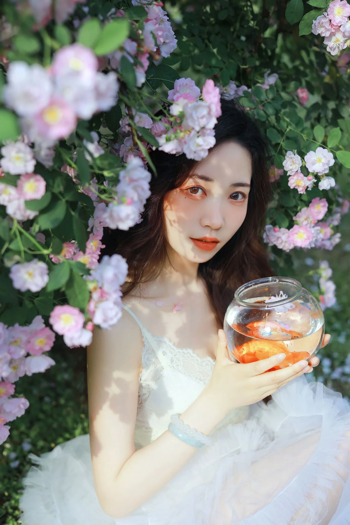Stepping into a sun-drenched secret garden, the muse Hua Zhuang Shi Tian emerges like a flower in full bloom amidst the whispers of nature. Dressed in a delicate white lace gown with flowing tulle accents, she embodies a celestial beauty that is both fragile and vibrant. Her dreamy gaze and graceful poses among the lush pink roses create a poetic visual narrative that feels like a scene captured from a classic fairytale. The unexpected addition of a small goldfish bowl beside her adds a touch of surrealism, symbolizing a harmonious connection between the human spirit and the natural world. The palette of verdant greens, soft pastel pinks, and pristine whites weaves a soothing color story that evokes a profound sense of tranquility and nostalgia. This collection perfectly captures the essence of the romantic Cottagecore aesthetic, offering a moment of stillness where high fashion and raw nature intertwine. It is a true testament to visual storytelling, where every frame whispers a tale of elegance, light, and timeless charm.#EtherealBeauty #GardenAesthetic #CottagecoreVibes #VisualArtistry #HuaZhuangShiTian #YiTuYu